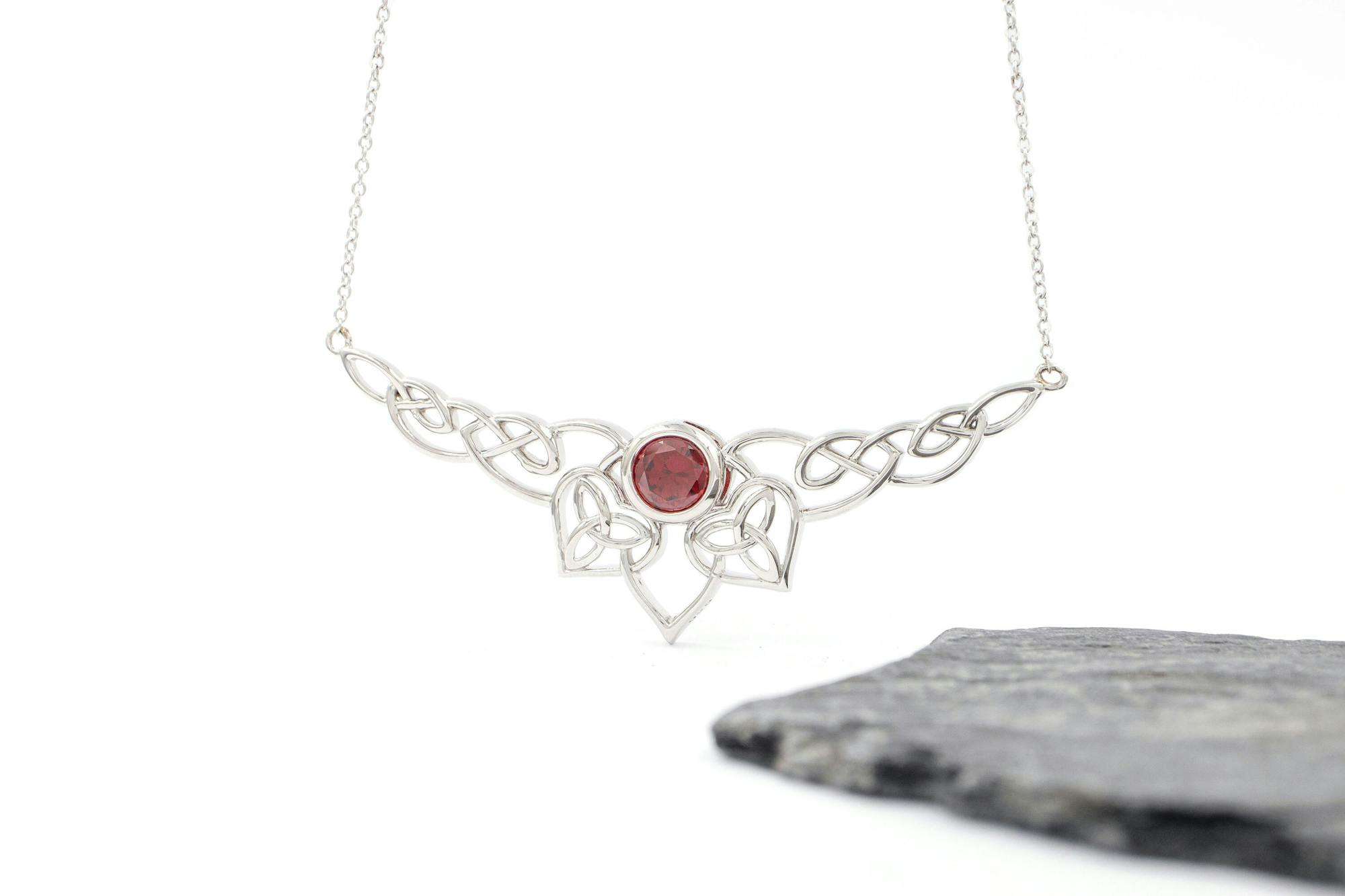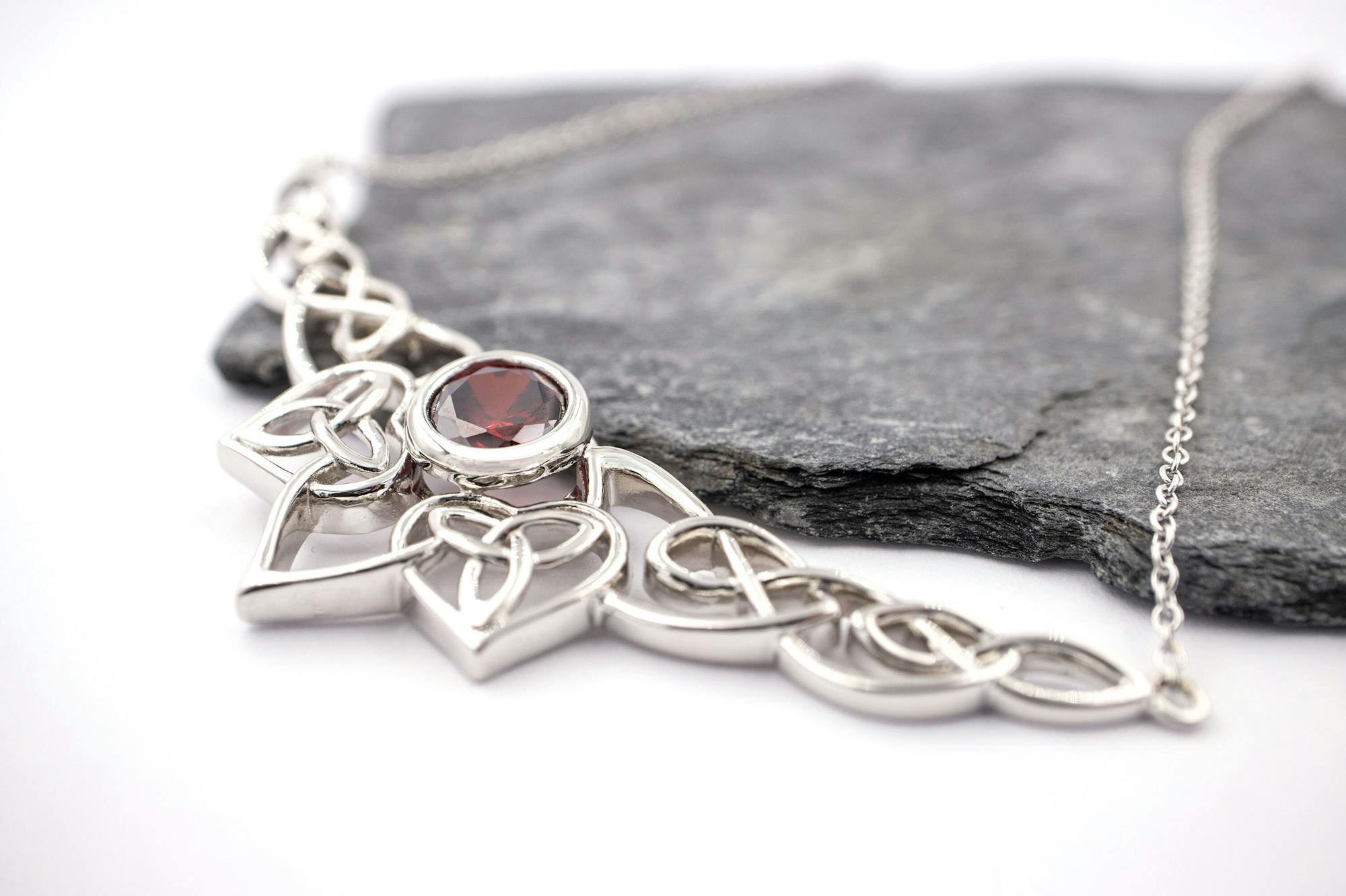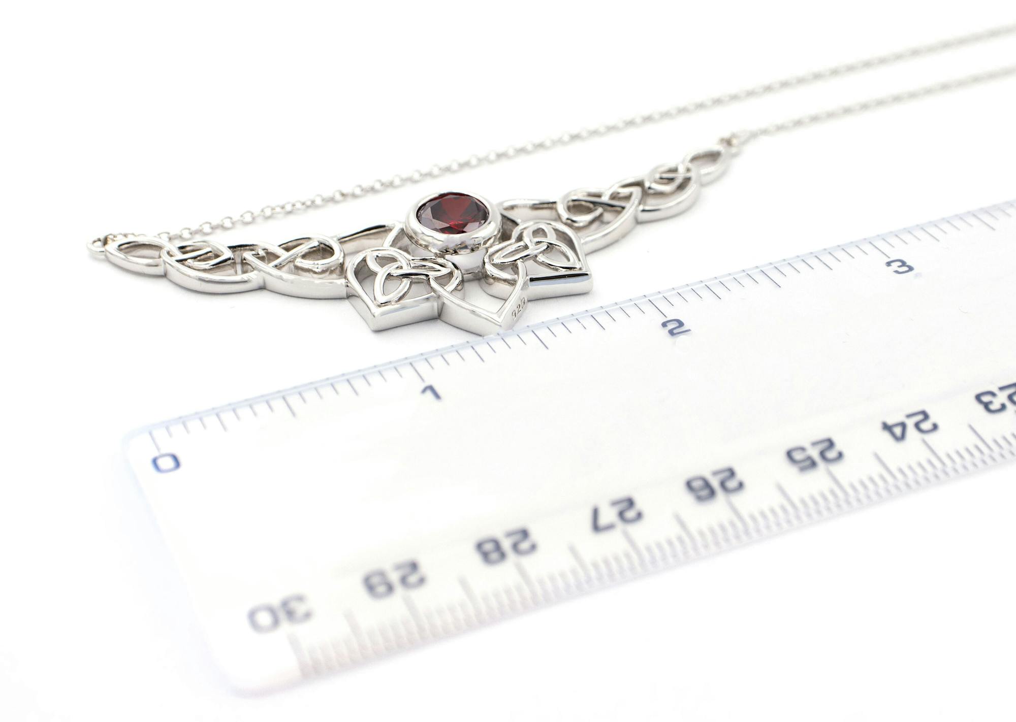 With an elegant form that speaks of the Celtic Torc treasures of ancient Ireland, the intertwined strands of fine sterling silver form an intricate interlace. This masterful Celtic knot-work incorporates two Trinity Knots in heart-shaped frames with a graceful central tapered tip that looks stunning on the neck. The Celtic interlace also encloses a sparkling, round cut, birthstone in a rub over setting, adding a touch of glamour to this striking piece.