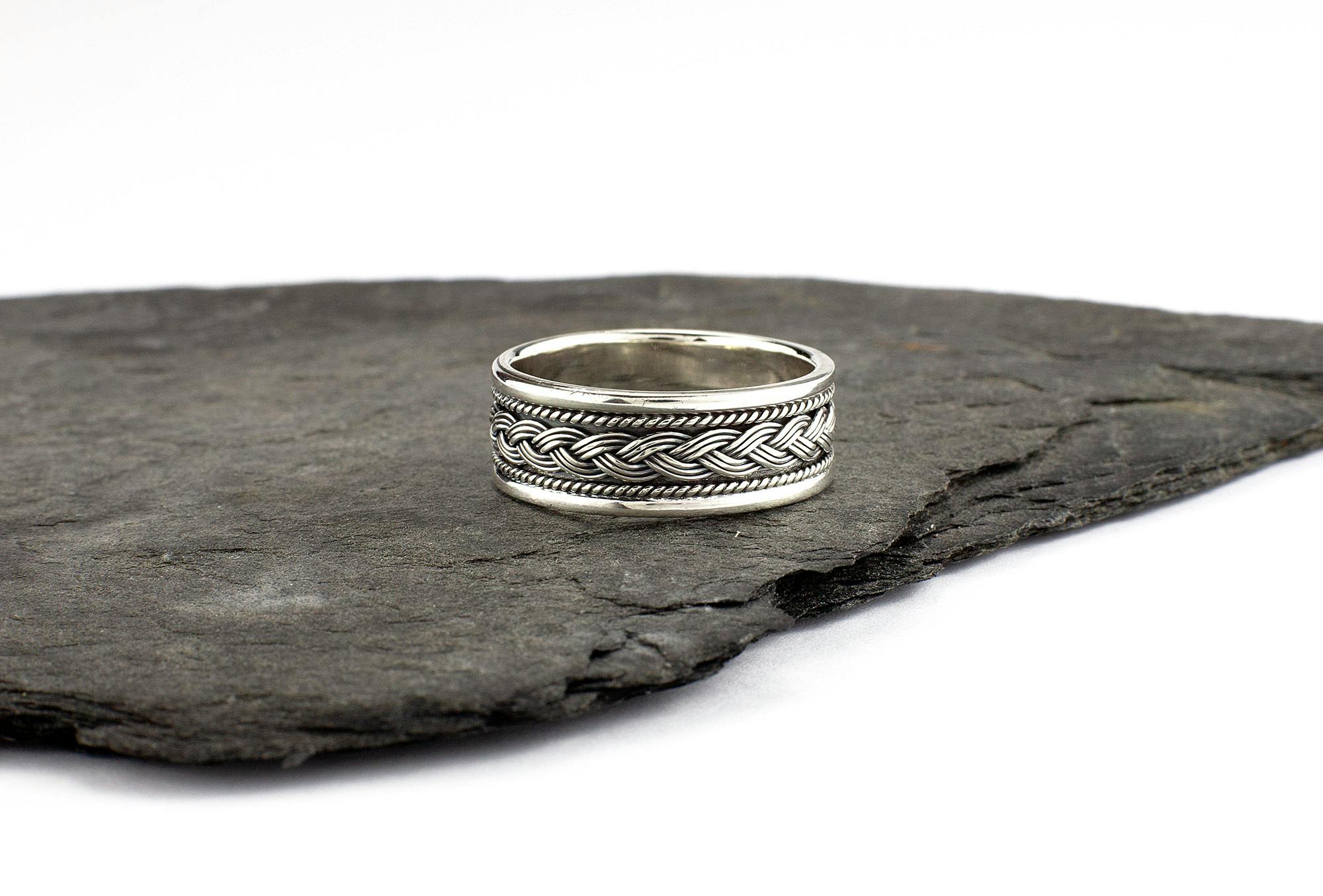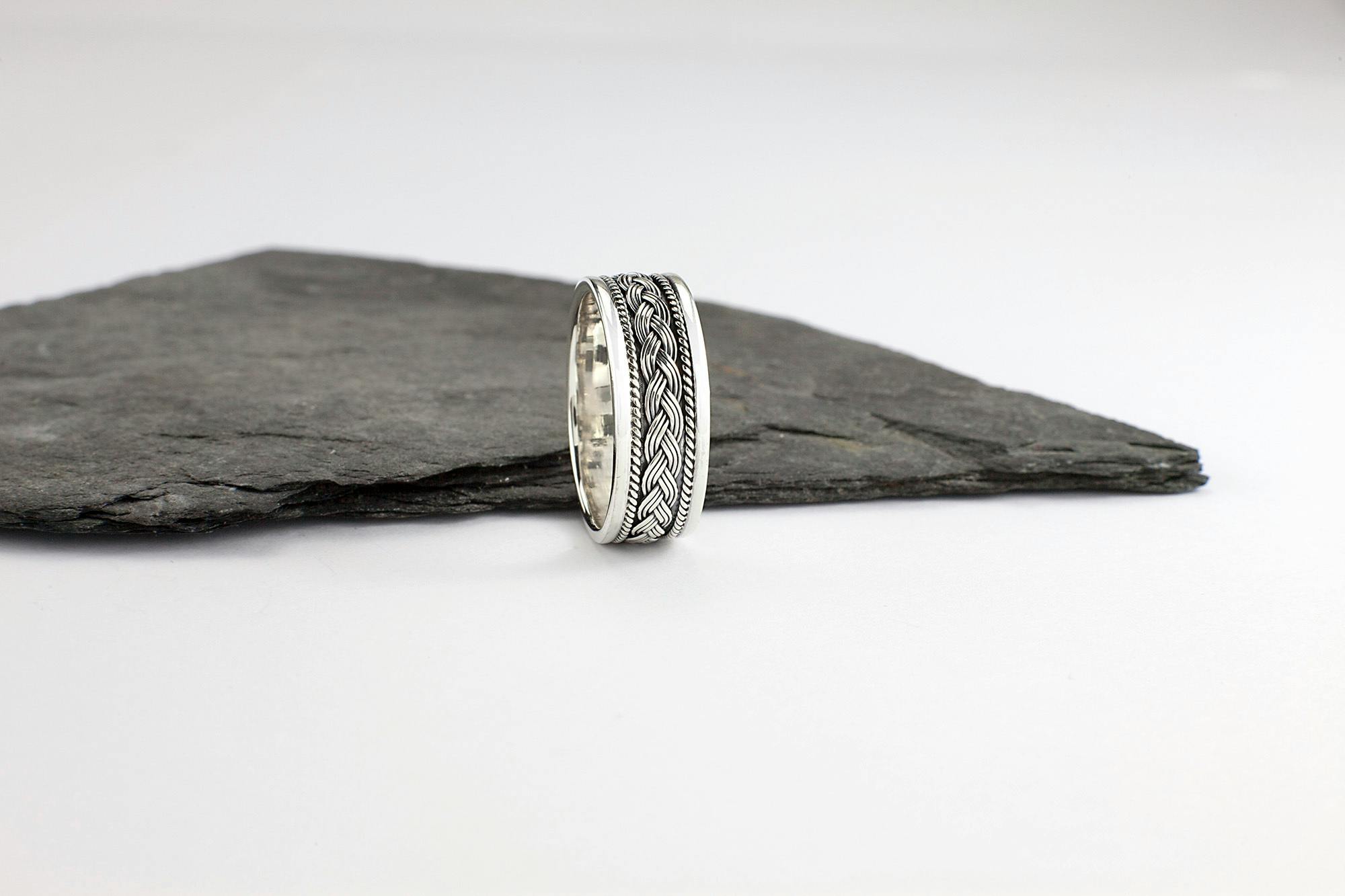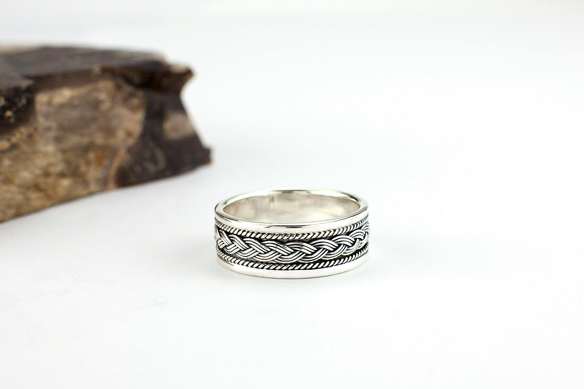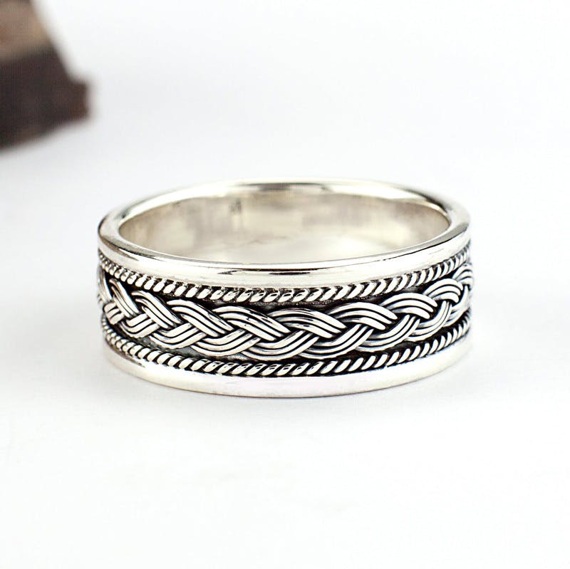 Sterling silver 8mm Celtic braid ring. The inner frame has a double woven Celtic braid enhanced by an unusual foxtail wire on either side. The design repeats around the entire ring .The ring is slightly oxidized giving it that lived in look or old world charm. The ring has shiny trims which is in sharp contrast to the antique inner frame of the ring.