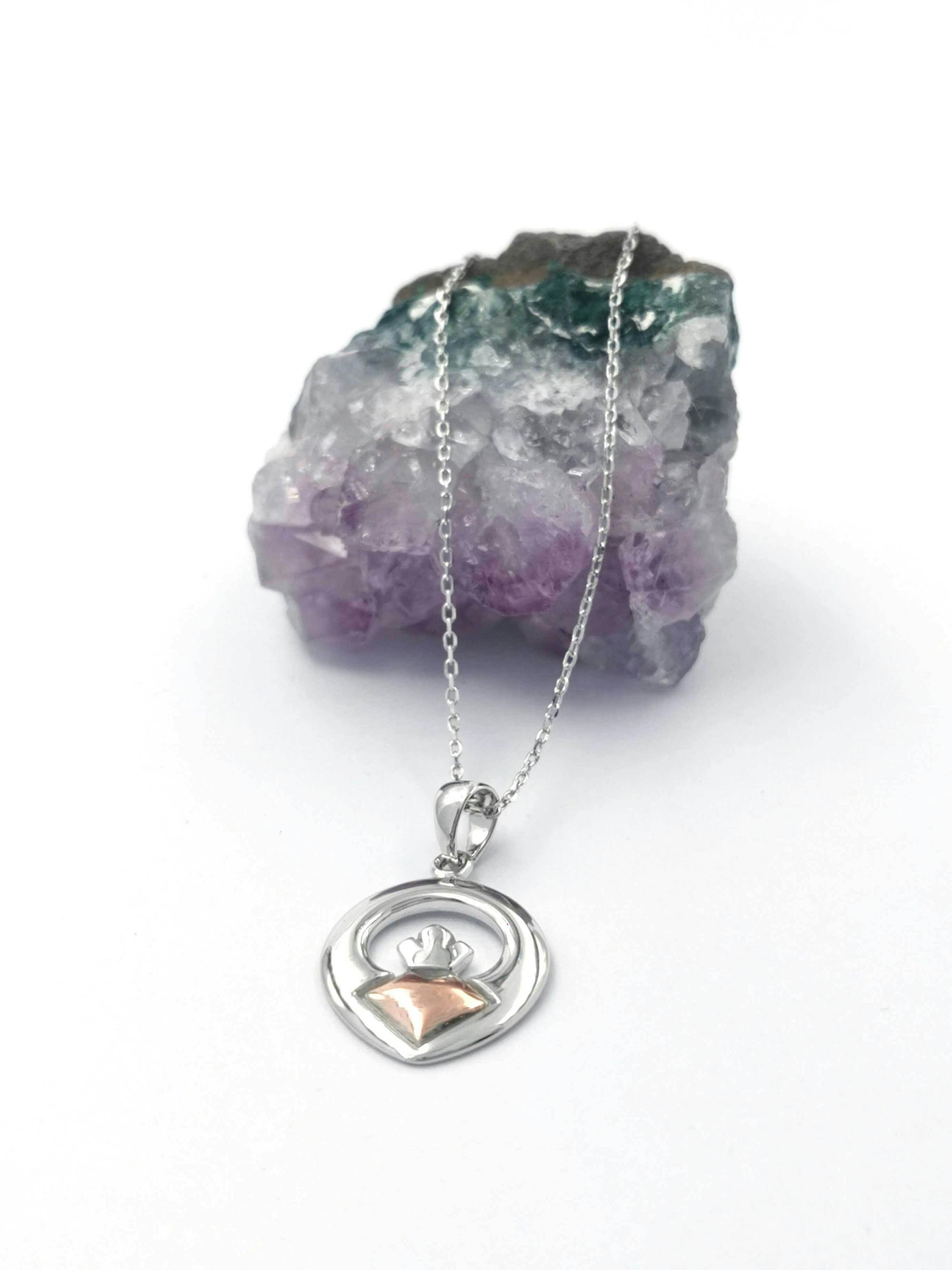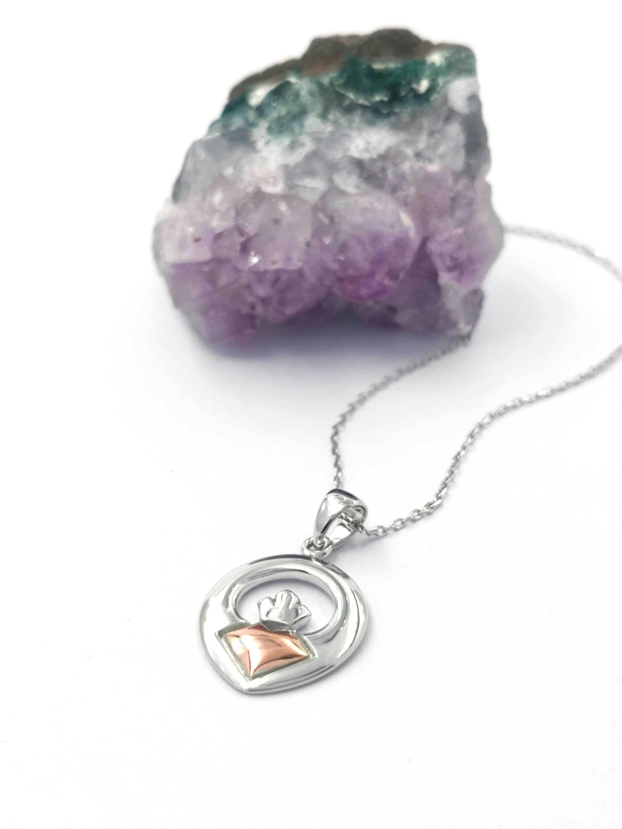 This sterling silver & 10k Irish rose gold necklace has a modern and contemporary look. The 10k rose gold is sourced in Ireland from the hills in Co. Tyrone. The necklace has sharp clean lines with no frills or fuss. The fusion of the two precious metals work in perfect harmony to accentuate the rose gold heart.