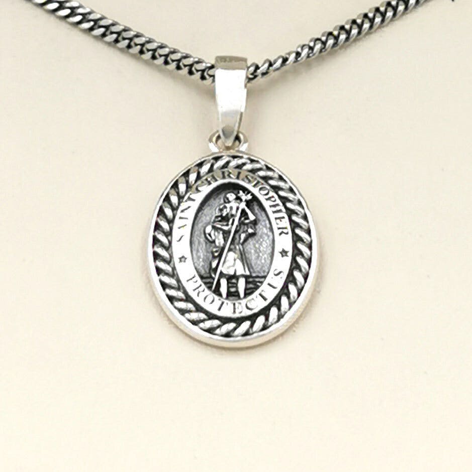 Carefully crafted in weighty sterling silver, the medal depicts St Christopher carrying a child safely across a river on his shoulder, staff in hand. A polished sterling silver oval bezel with the traditional wording 'St Christopher protect us' frames this scene and is in turn framed by a handsome oxidized Celtic braid.
