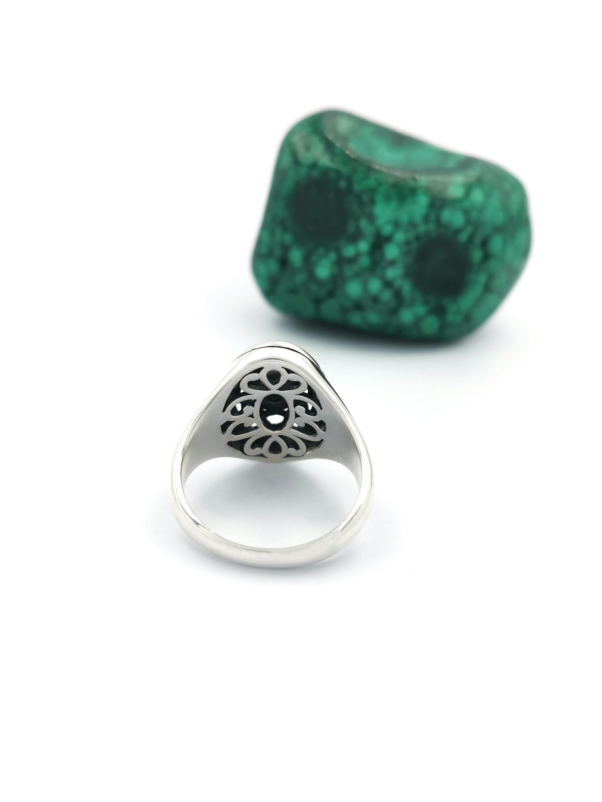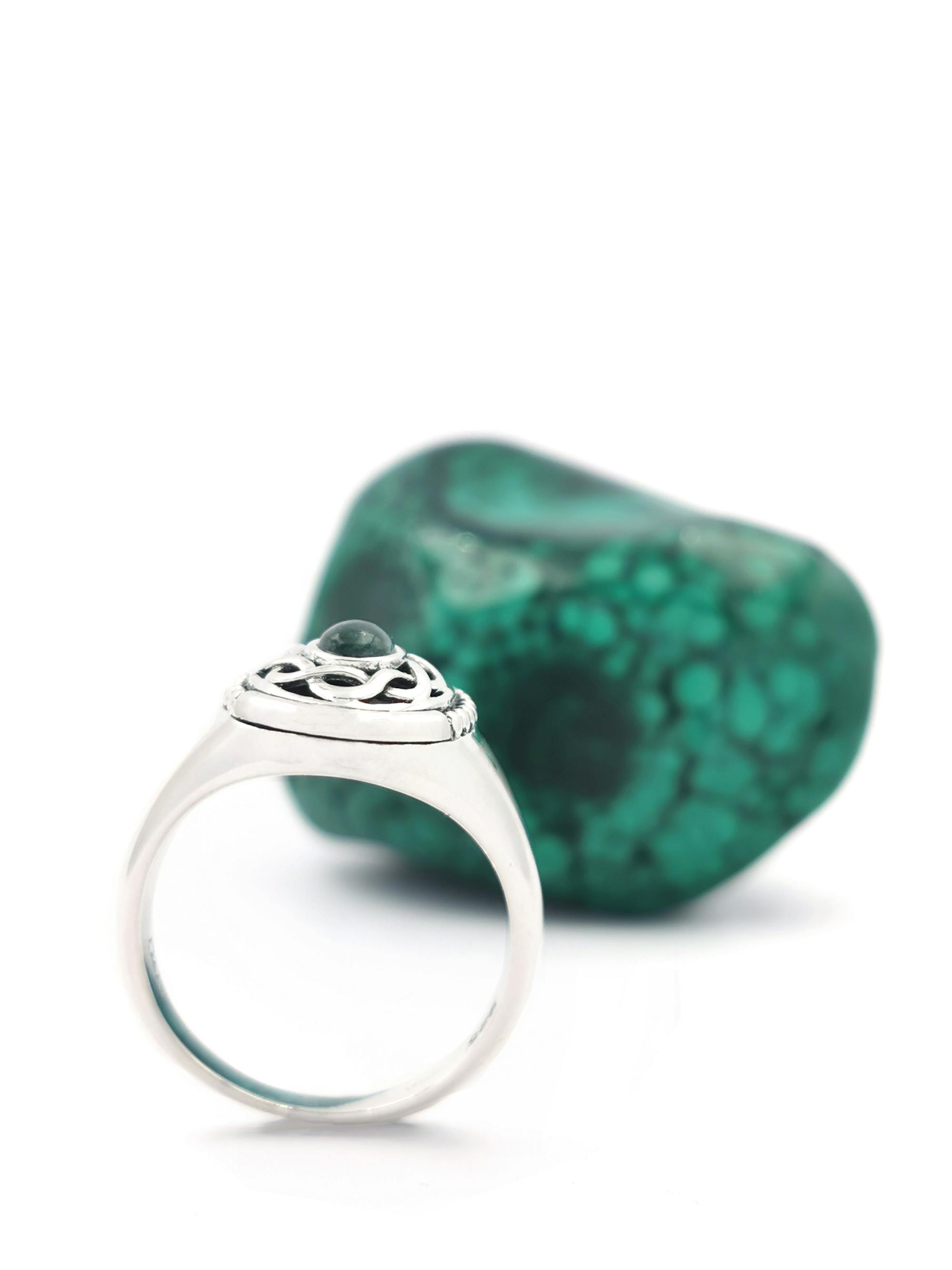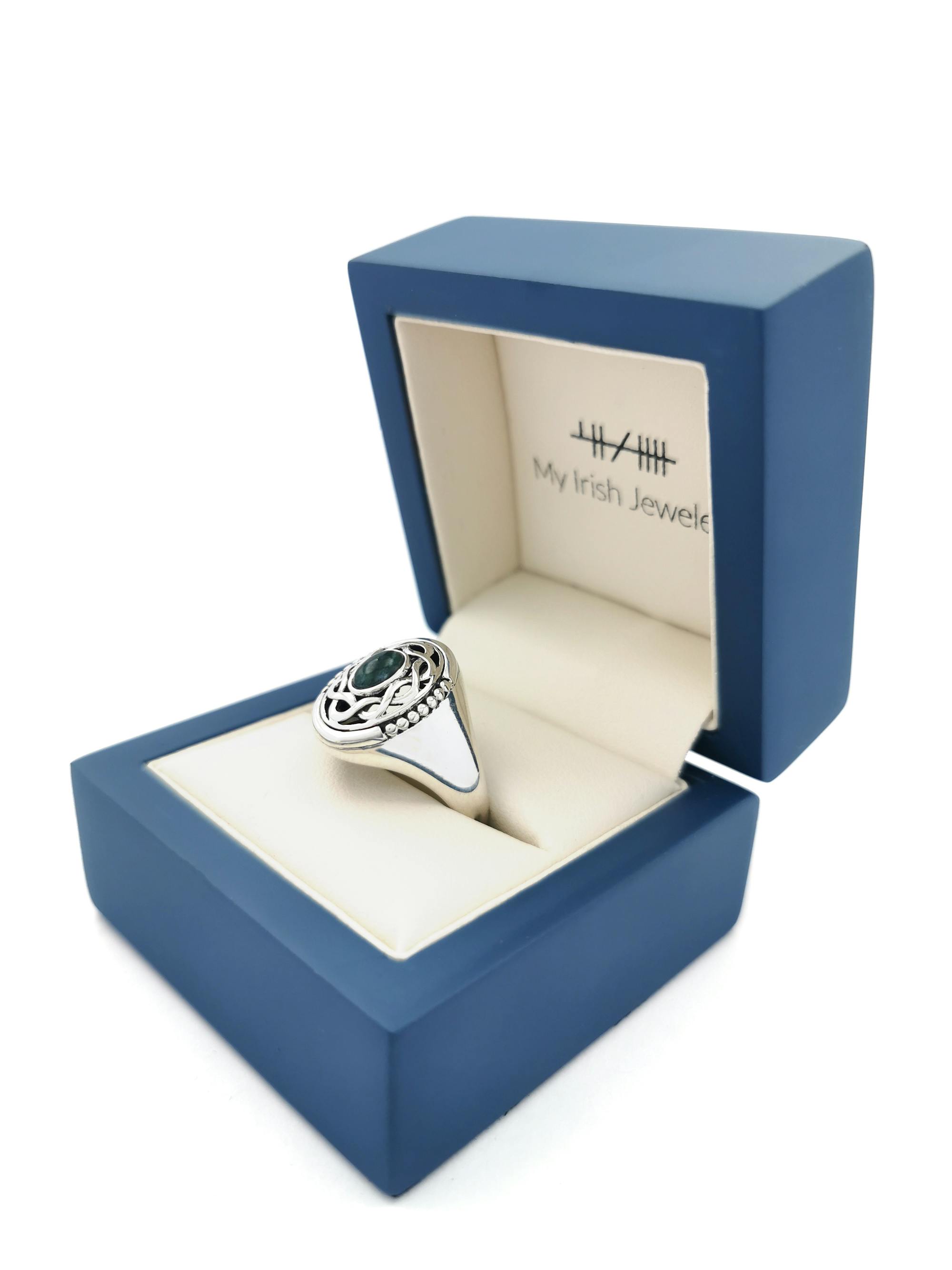 The ring has a soft feminine shape with lots of features to keep you interested. An oval piece of Connemara Marble is embedded in the center, securely held in place in a rub over setting.The marble is a dark shade of green known as sage green. Connemara marble is known as the 'gemstone' of Ireland found exclusively in the West of Ireland.