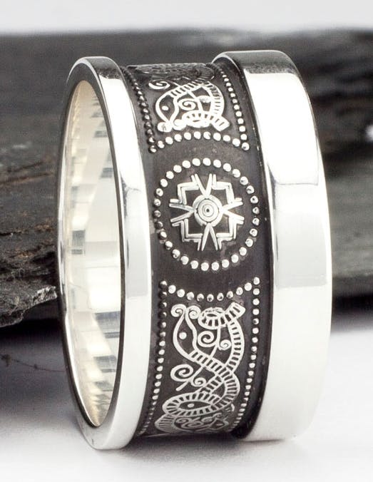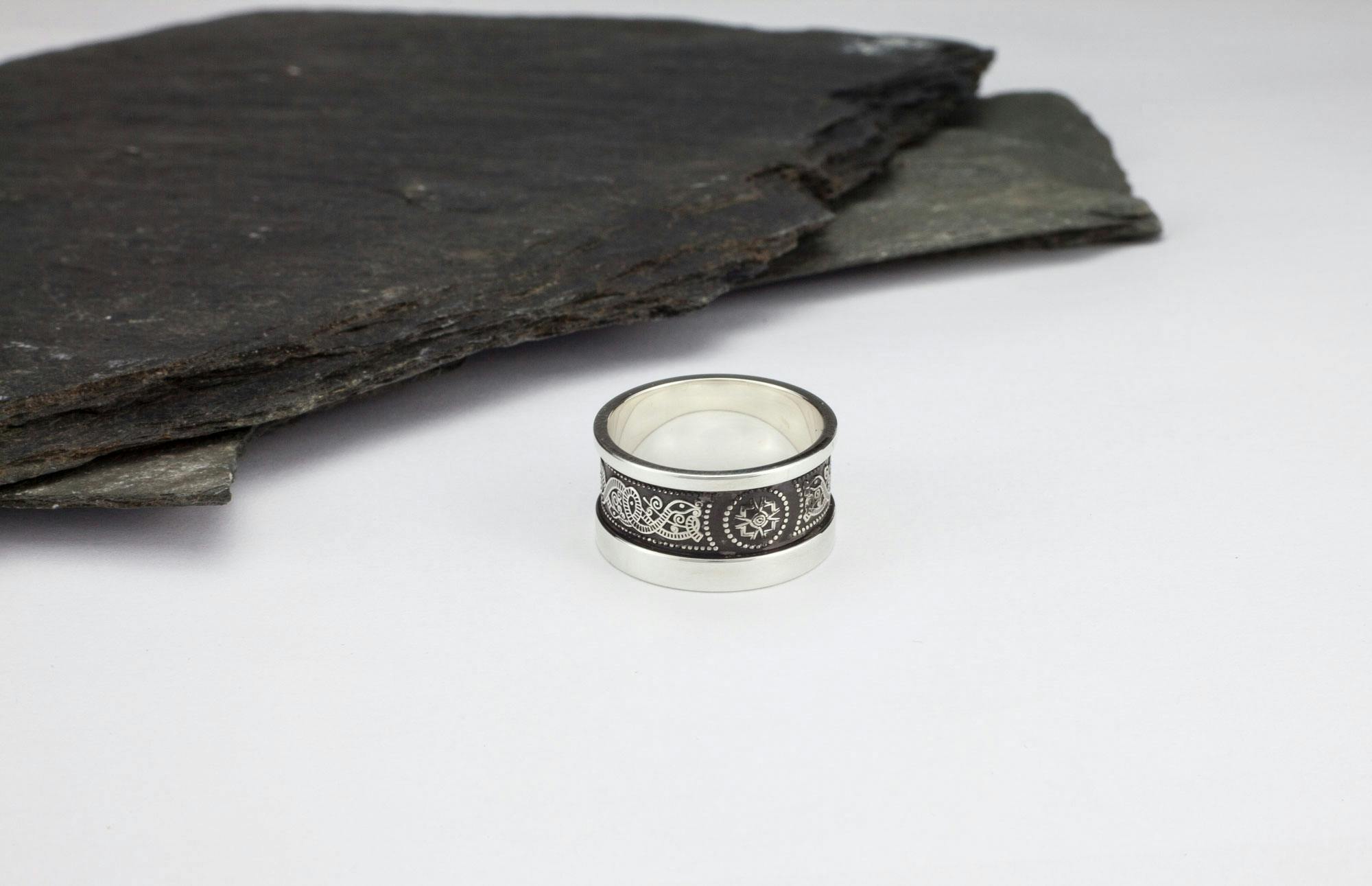 This Sterling Silver ring is a 'real beauty' with a complex and highly decorative design. The inspiration is taken from one of Ireland's priceless treasures, the Ardagh Chalice, which was discovered in 1868, Co Limerick.