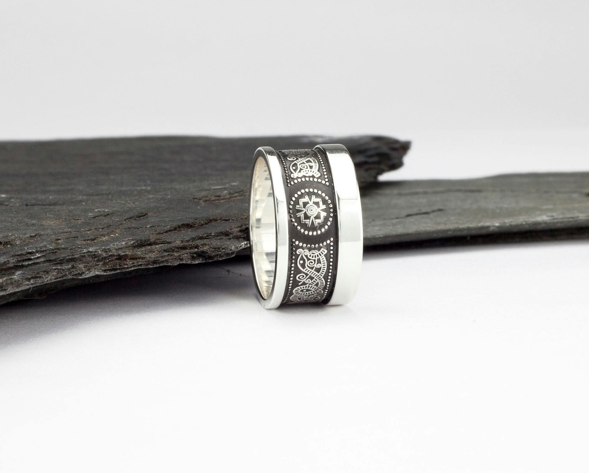 The filigree band on the original Ardagh Chalice has a series of shield decorations with minute intricate Celtic pattern. This design forms the basis of the ring and the pattern repeats around the entire band. As this band would be considered a real 'Man's' ring, we have made it extra wide with an a few interesting features. The pattern has been blackened, or oxidized to give it that 'lived in look'. The side trims are flattened to a very high polish, with one side having a 3.5mm trim and the opposite side a 1.7mm trim.