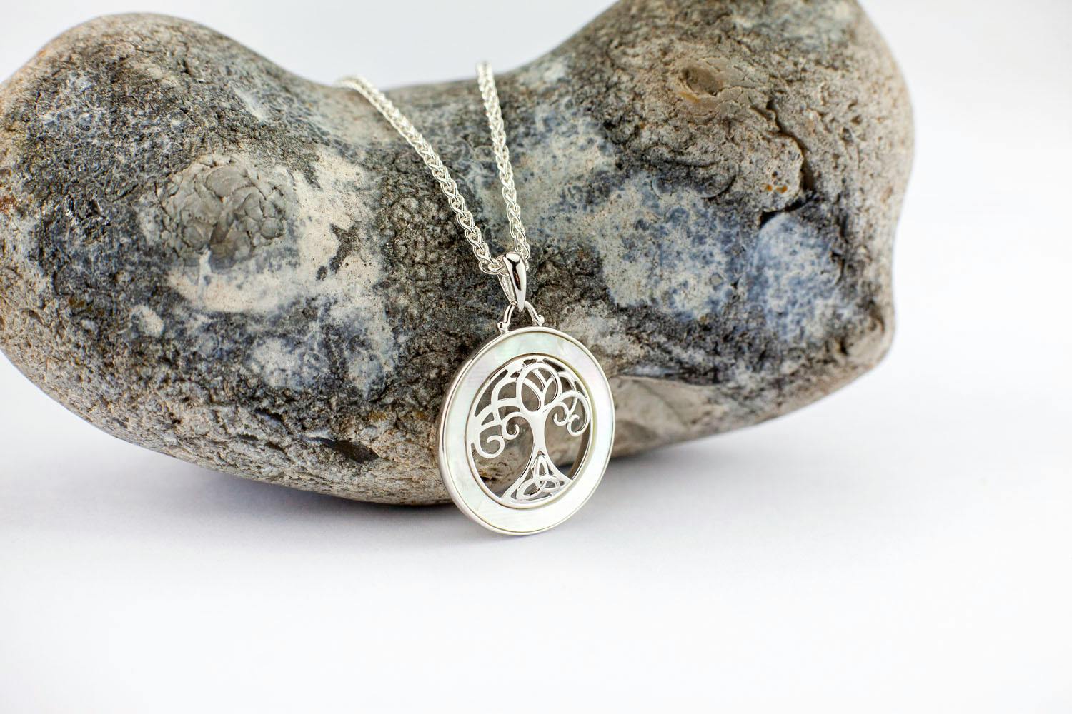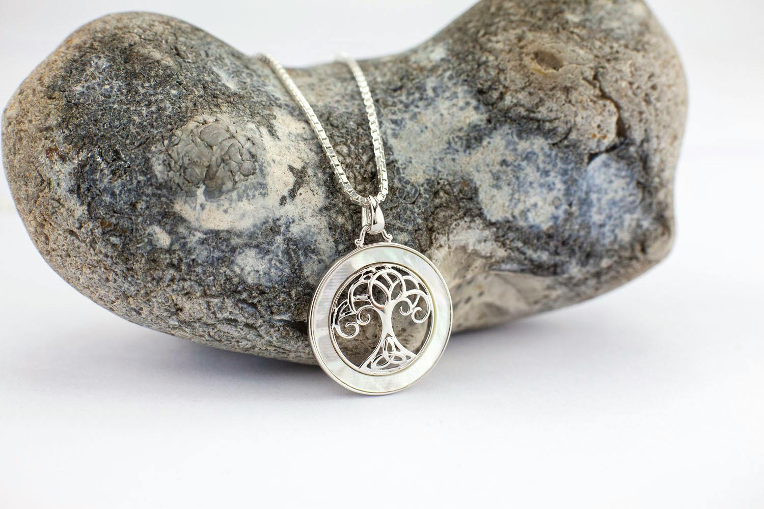 This captivating tree of life necklace is inlaid with mother of pearl, for a piece with a magical shimmer. Mother of pearl has a long history of use in jewelry and is prized for its beautiful iridescent glow. Associated with good luck and prosperity, Mother of Pearl is a wonderful match for the symbolism of the Celtic Tree of Life.