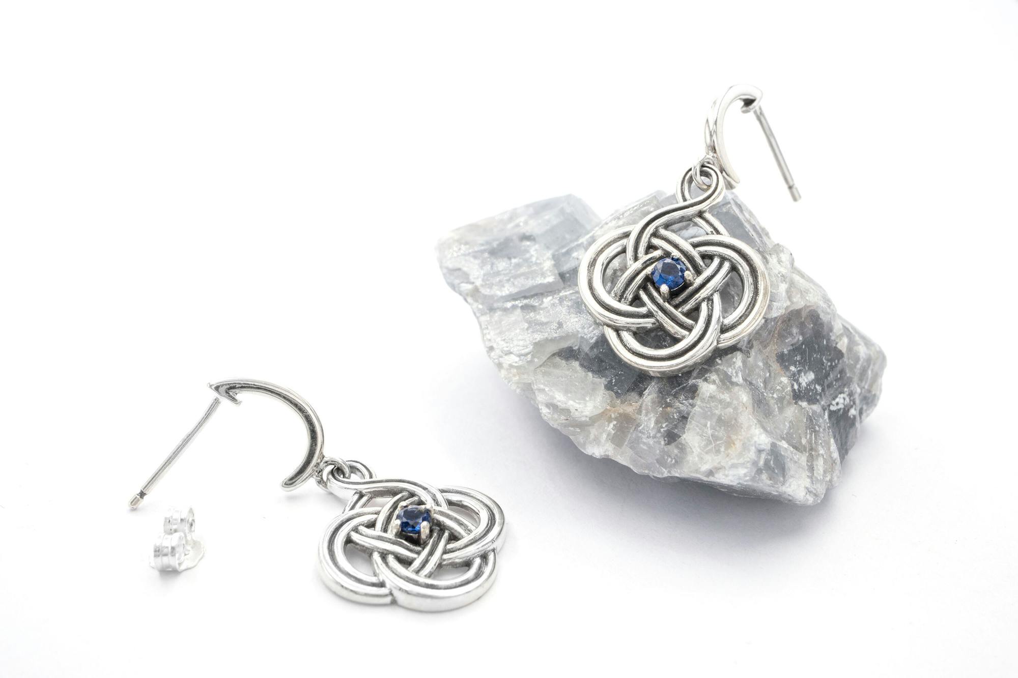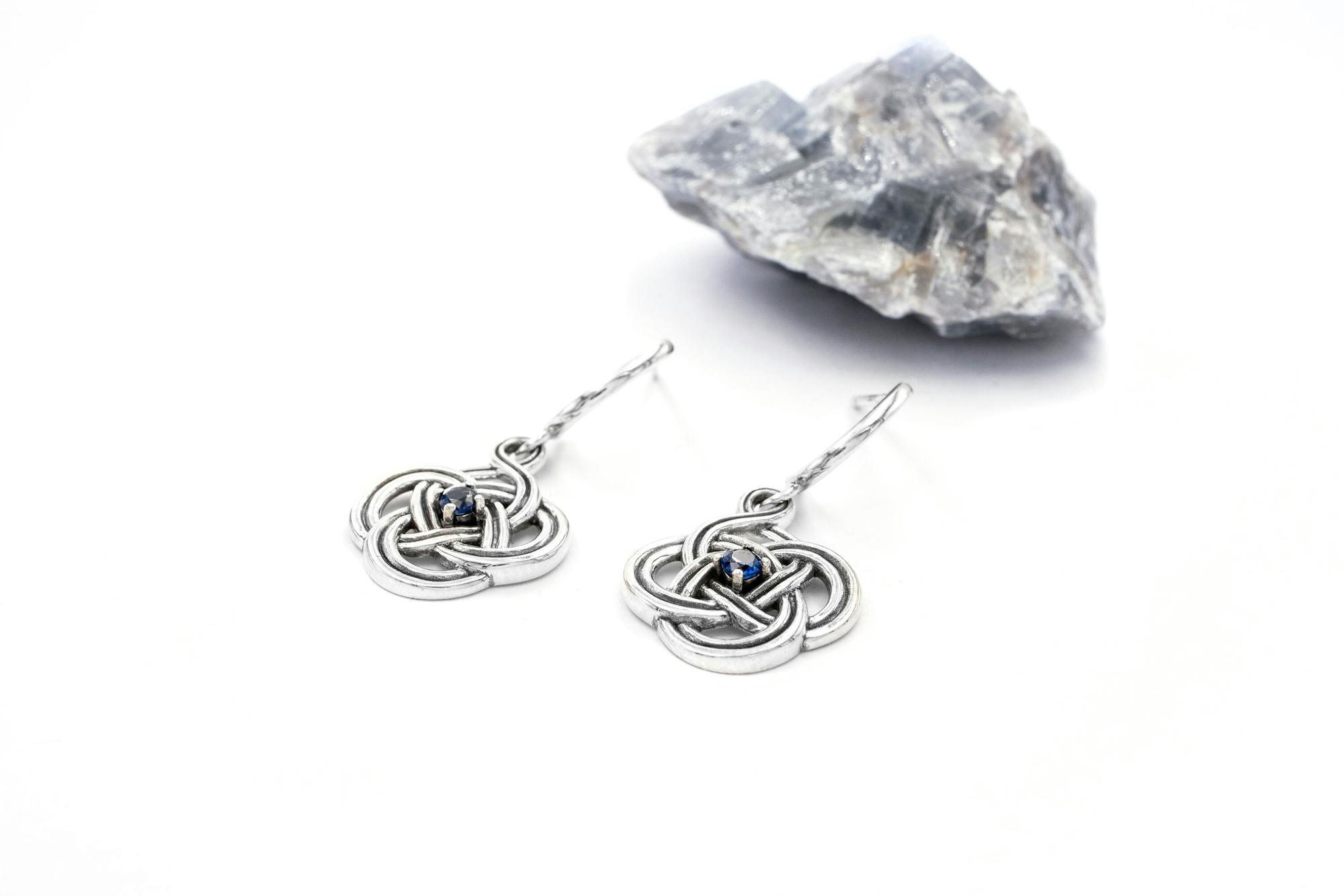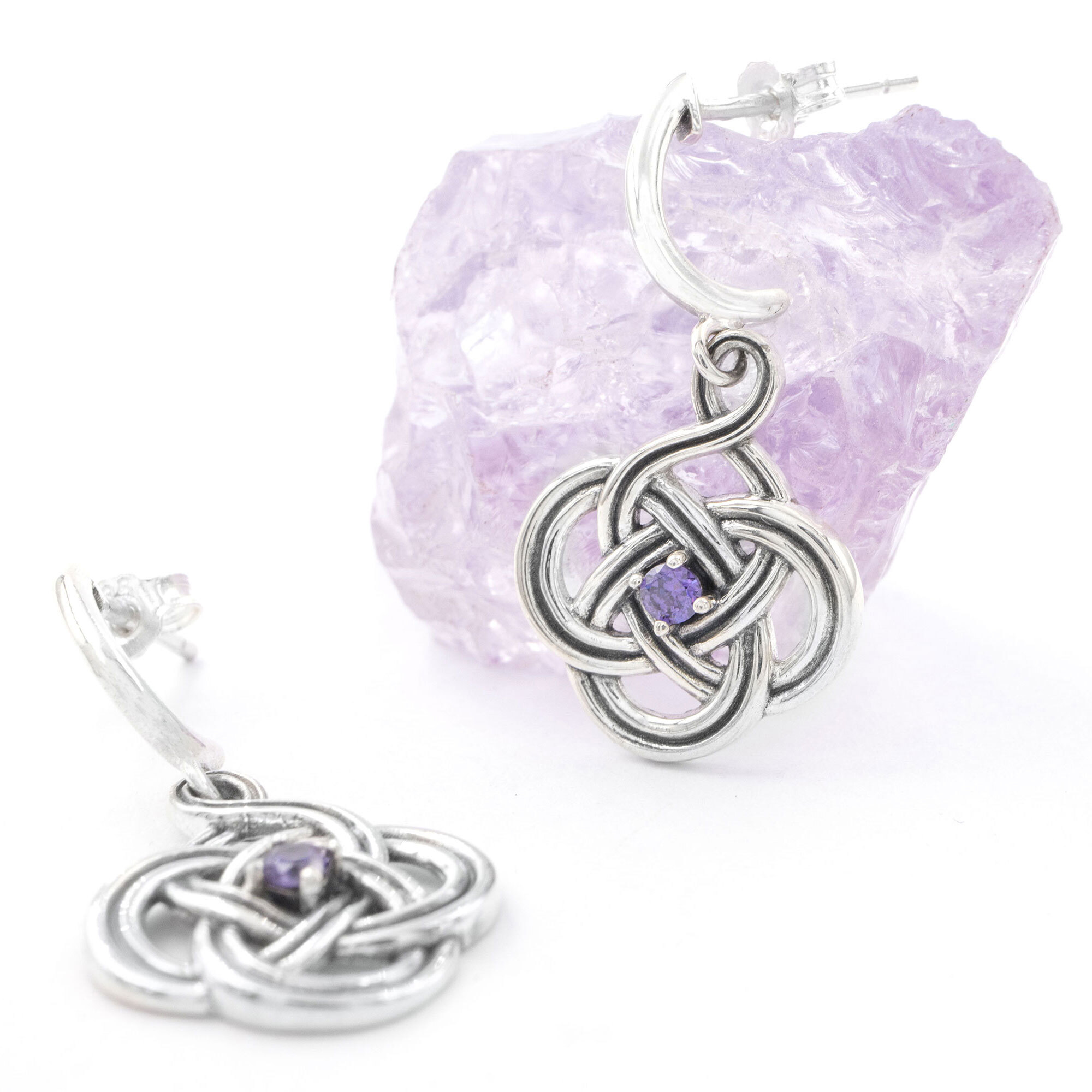 These striking drop earrings use a combination of black oxidation and polished sterling silver for an elegant look. The inner frame is decorated with a sparkling cz stone. The intricate Celtic knot work embodies themes of love, loyalty and eternity.