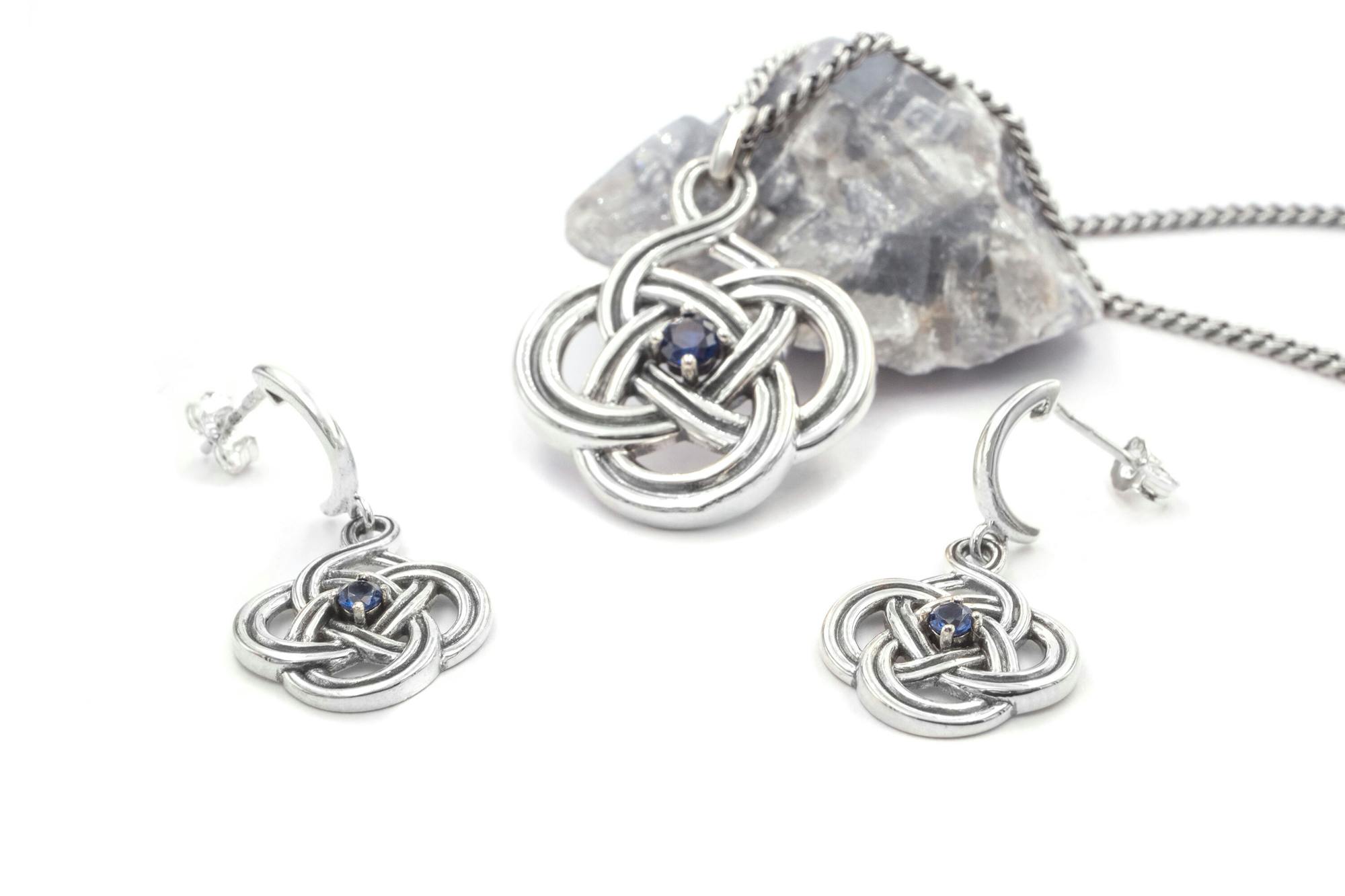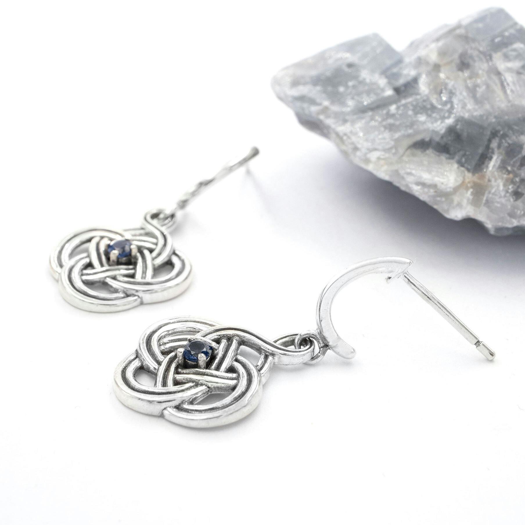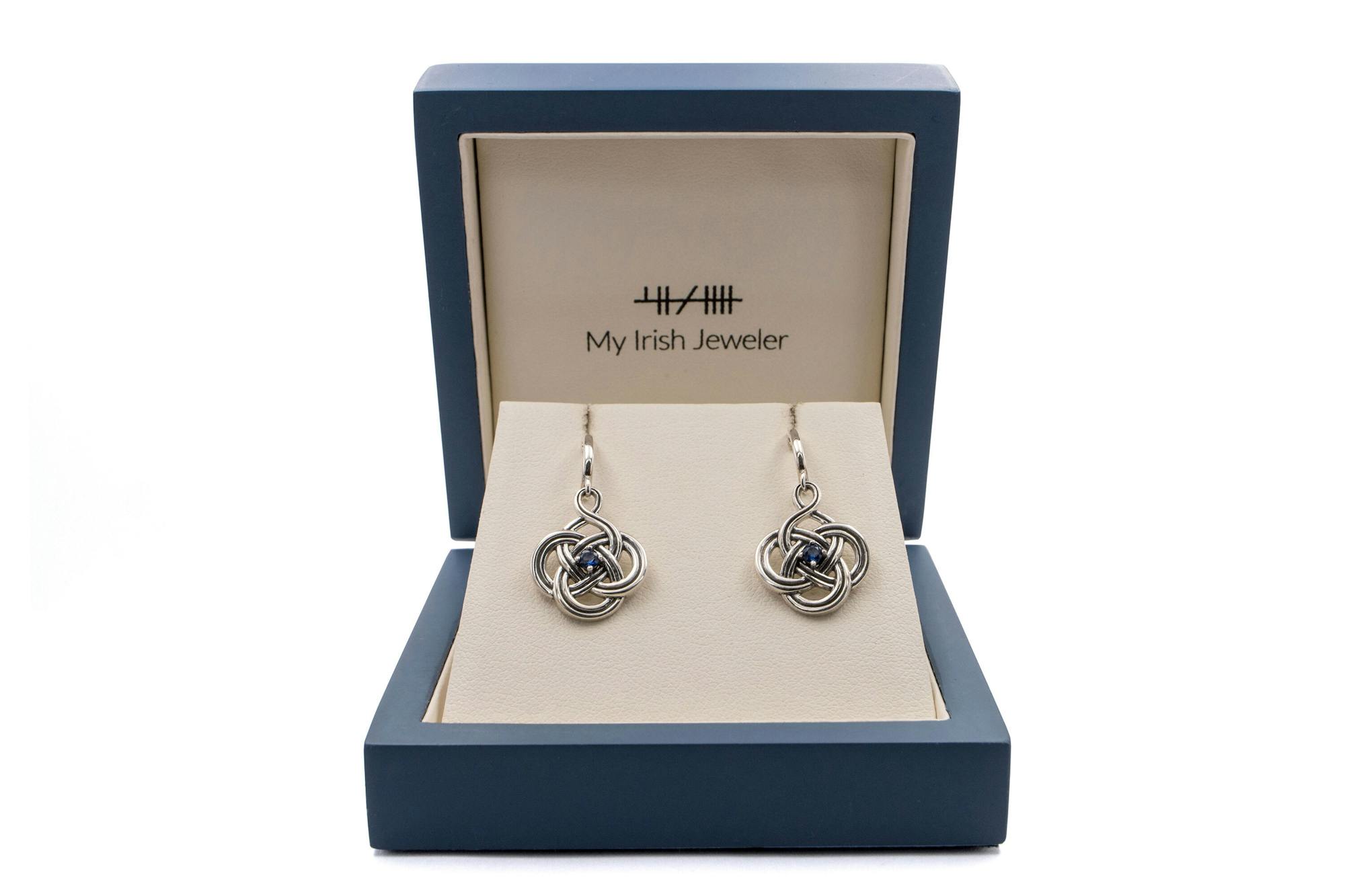 These striking drop earrings use a combination of black oxidation and polished sterling silver for an elegant look. The inner frame is decorated with a sparkling cz stone. The intricate Celtic knot work embodies themes of love, loyalty and eternity.