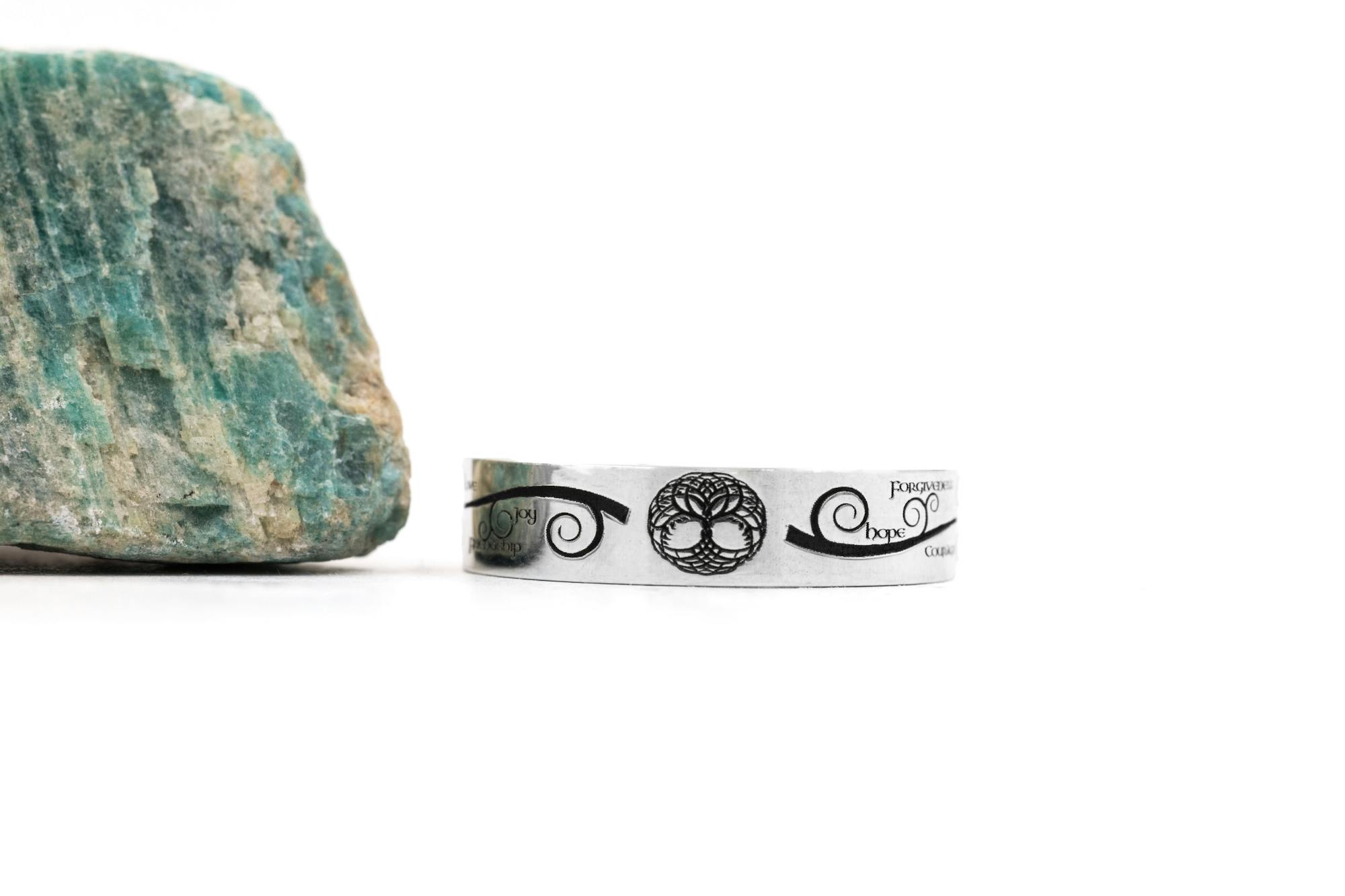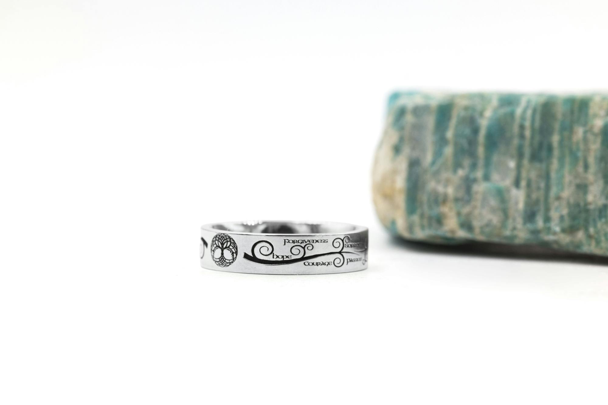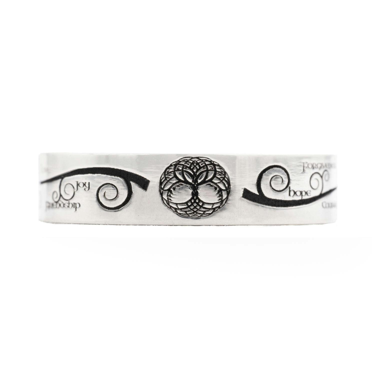 Branching out from the tree of life in this ring are words of intention for a life well lived: hope, courage, forgiveness, sorrow, passion, faith, acceptance, life, regret, devotion, pride, trust, live, love, friendship, and joy.