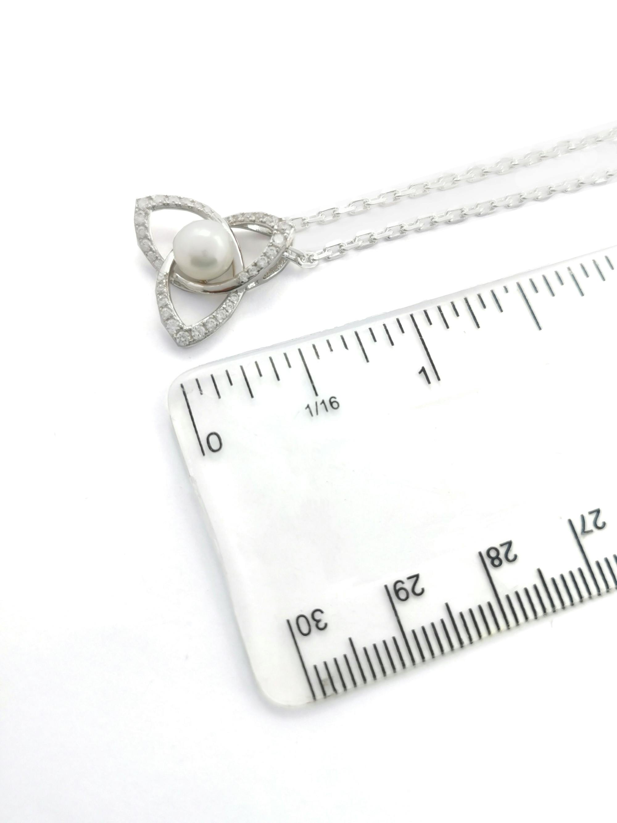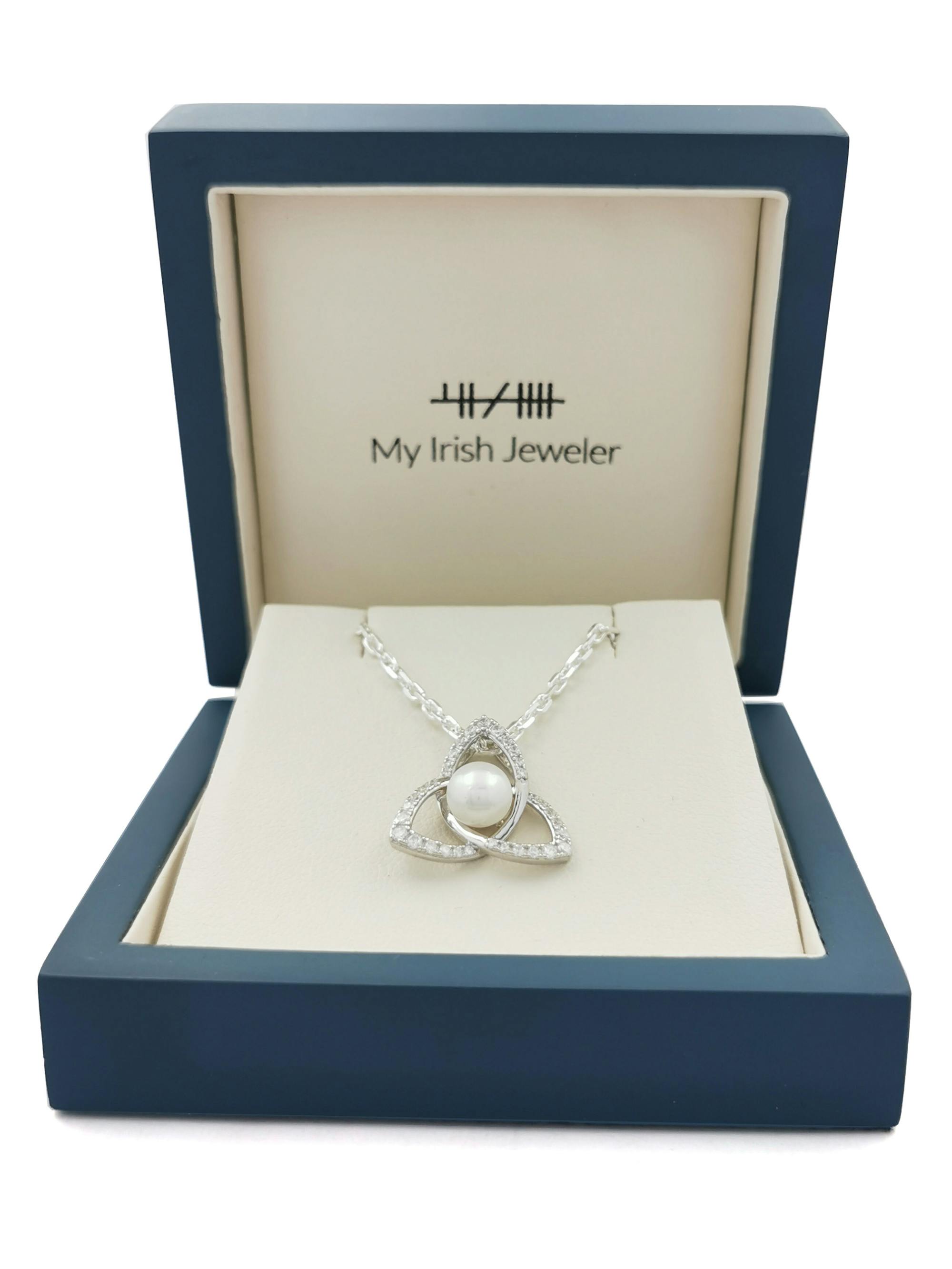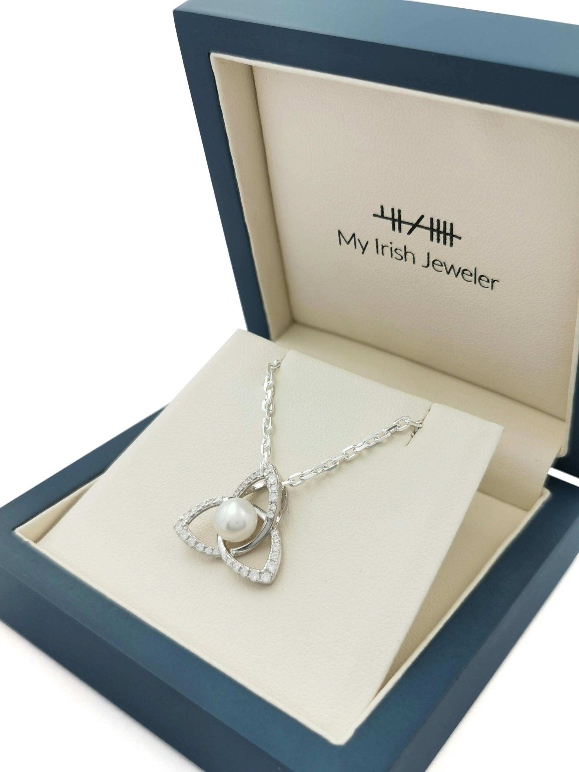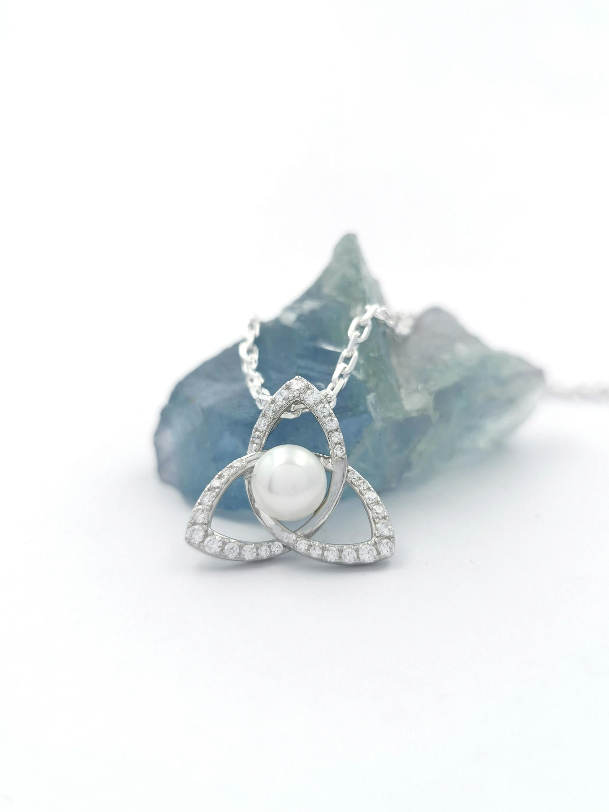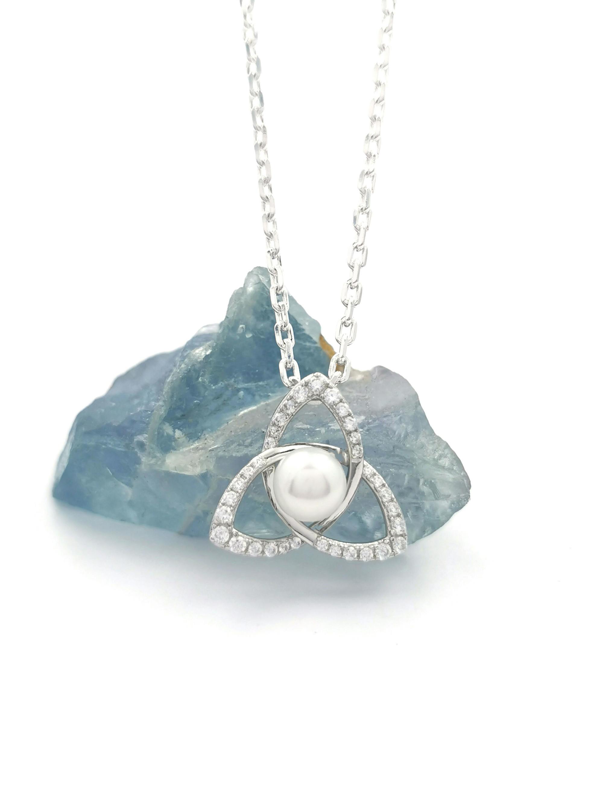 Stylish and sophisticated this gorgeous trinity knot necklace is adorned with a synthetic pearl in the center. The graceful curves of the trinity knots are studded in abundance with sparking white crystals that glisten and catch the light with every movement.