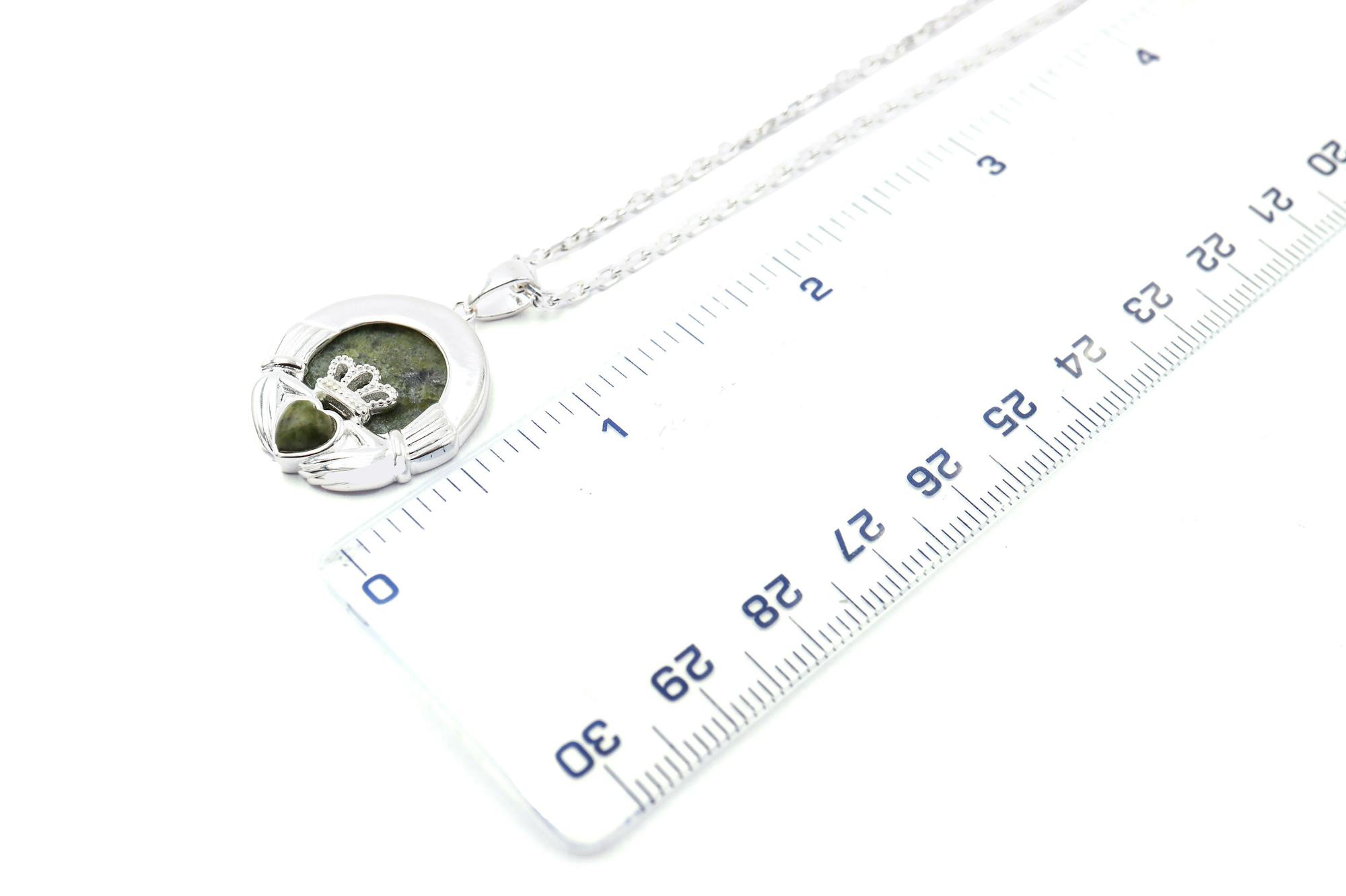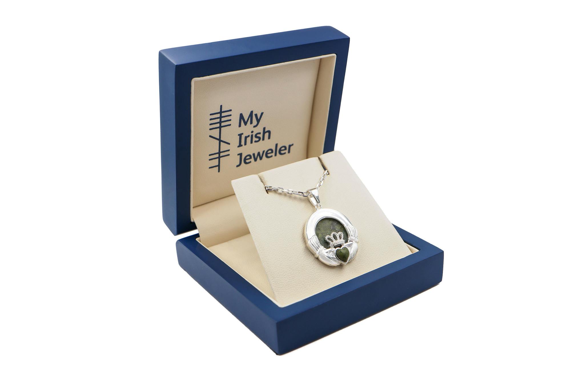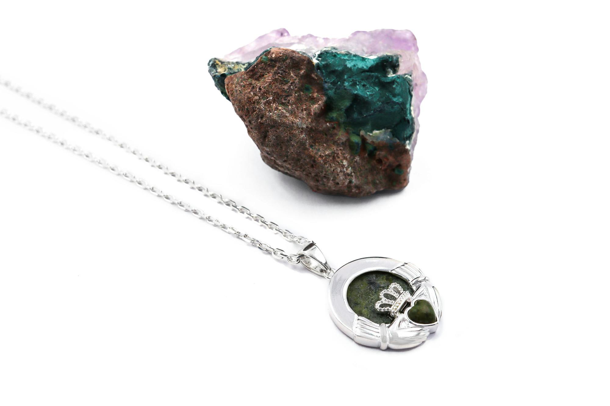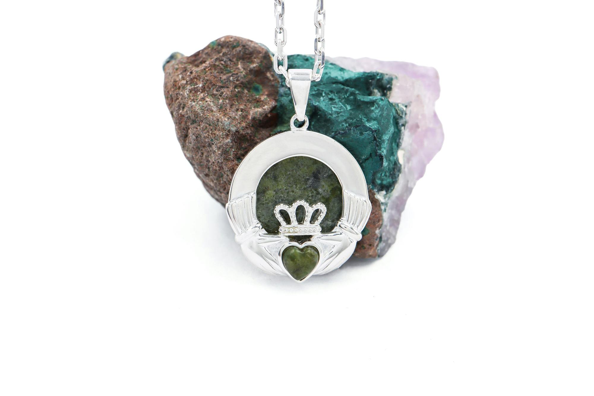This weighty sterling silver claddagh necklace is inlaid with Ireland's famous natural stone, Connemara Marble. Found exclusively on the wild Atlantic west of Ireland, varied shades of green make this beautiful marble truly unique, with no two pieces the same.