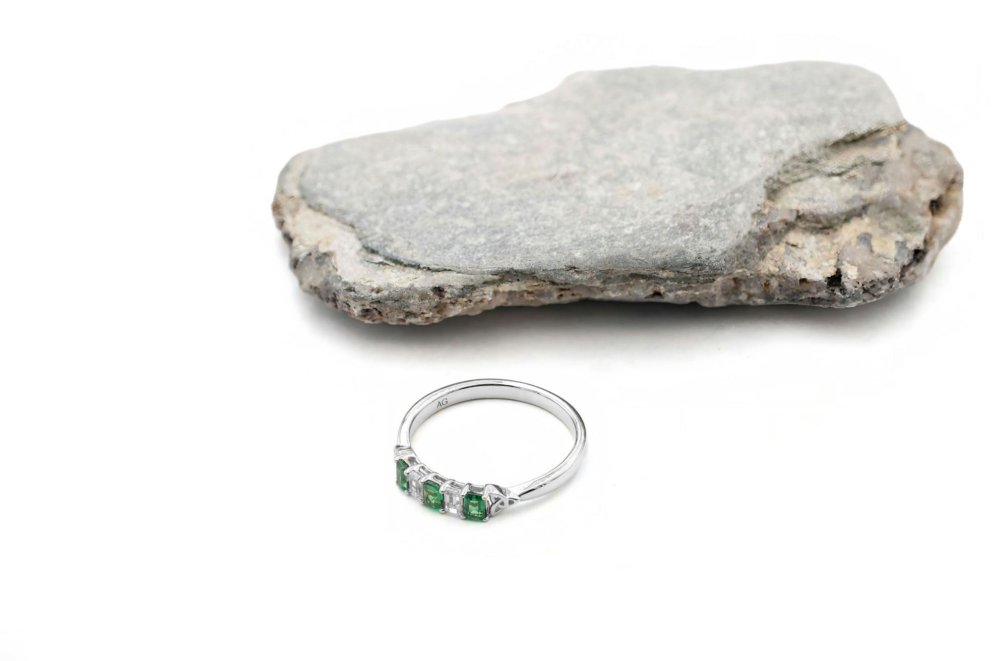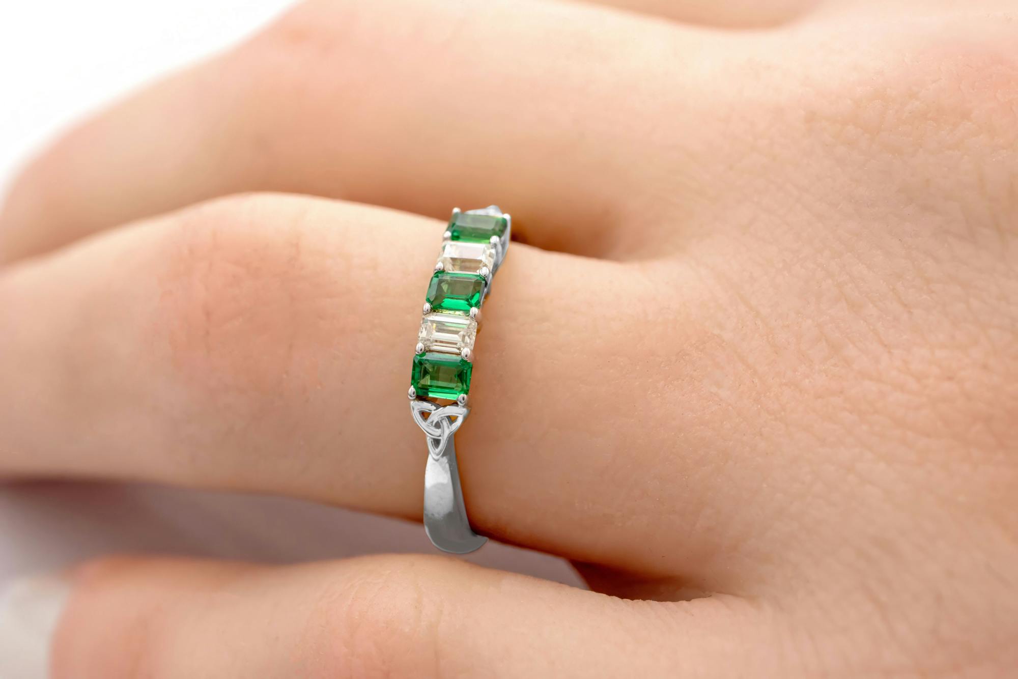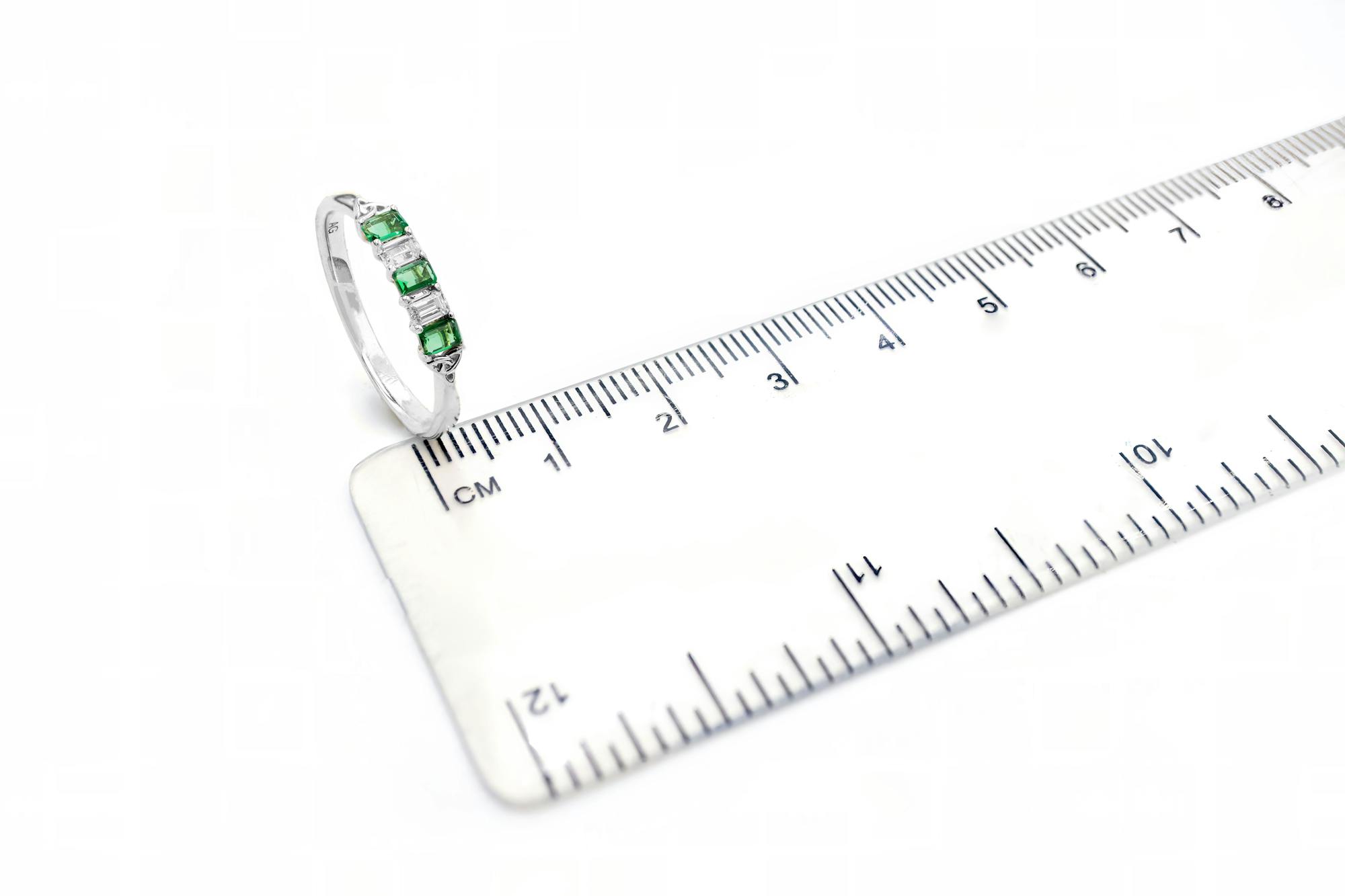 The 0.5 TCW ring is set with two 0.10ct G/H SI emerald cut diamonds and three 3mm emeralds.