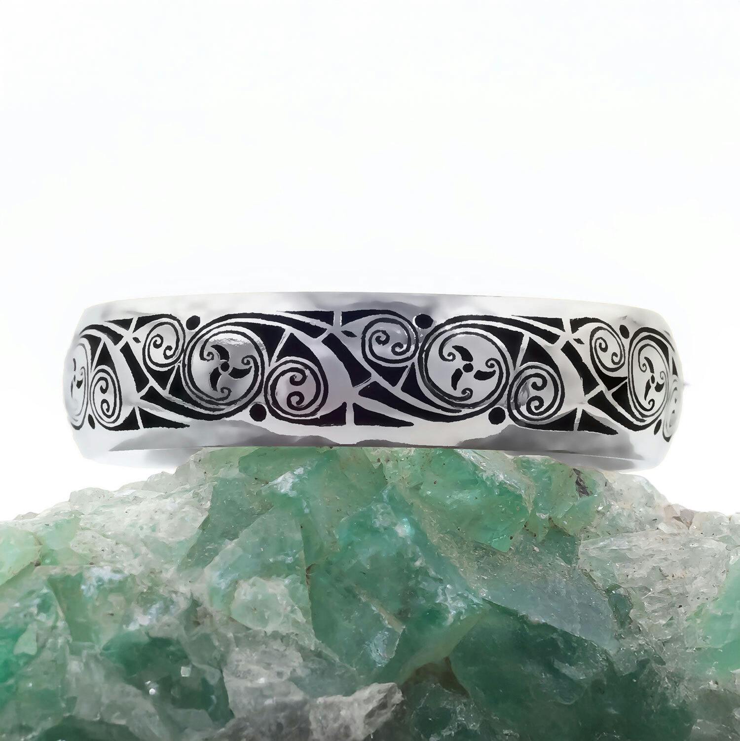 This is a superior quality ring, made in your choice of metal and band width. The wider bands in particular, allow the exquisite detailing on this ring to shine. Flourishes associated with Celtic La Tené design flow around the entire band. The black cerin enamel finish picks out the design beautifully, making this a stunning dramatic Celtic ring.