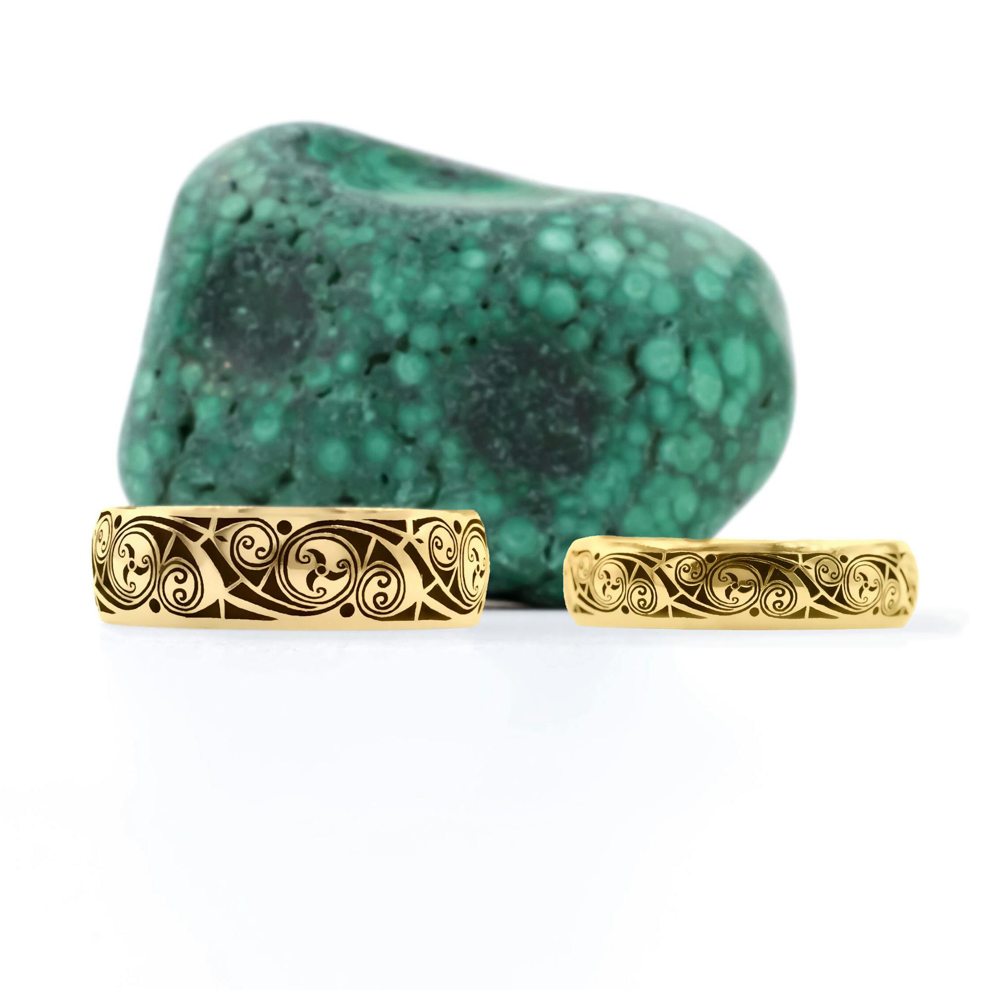 These premium quality rings are made to order in your choice of precious metal. The wider bands allow the exquisite detailing on these rings to shine. Celtic La Tené design flourishes flow around the entire band - picked out with a black cerin enamel finish.