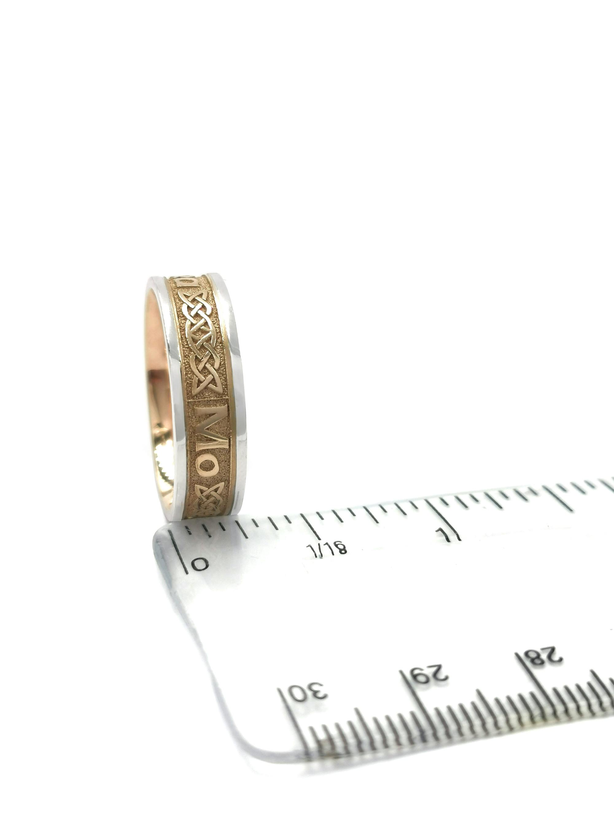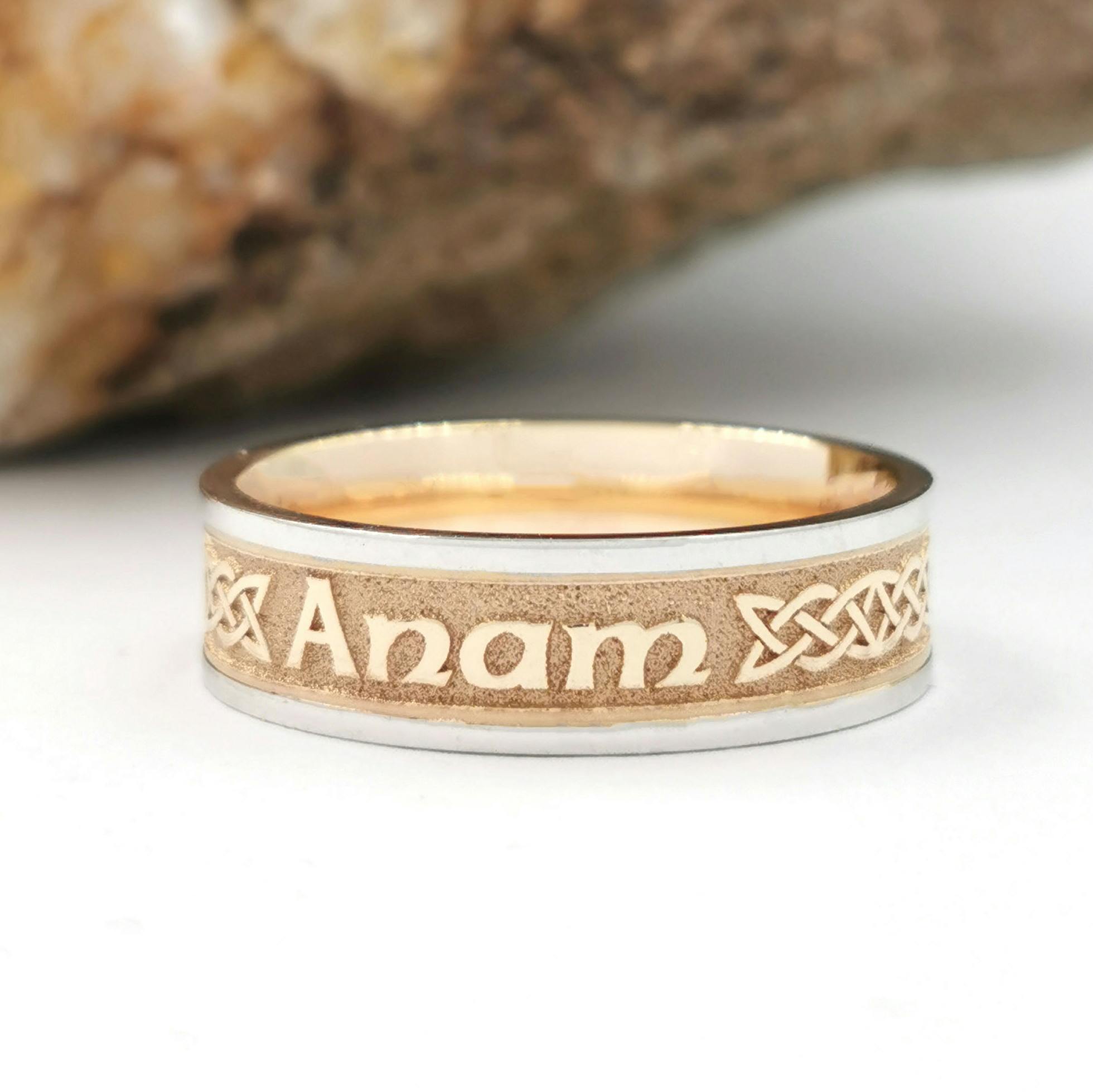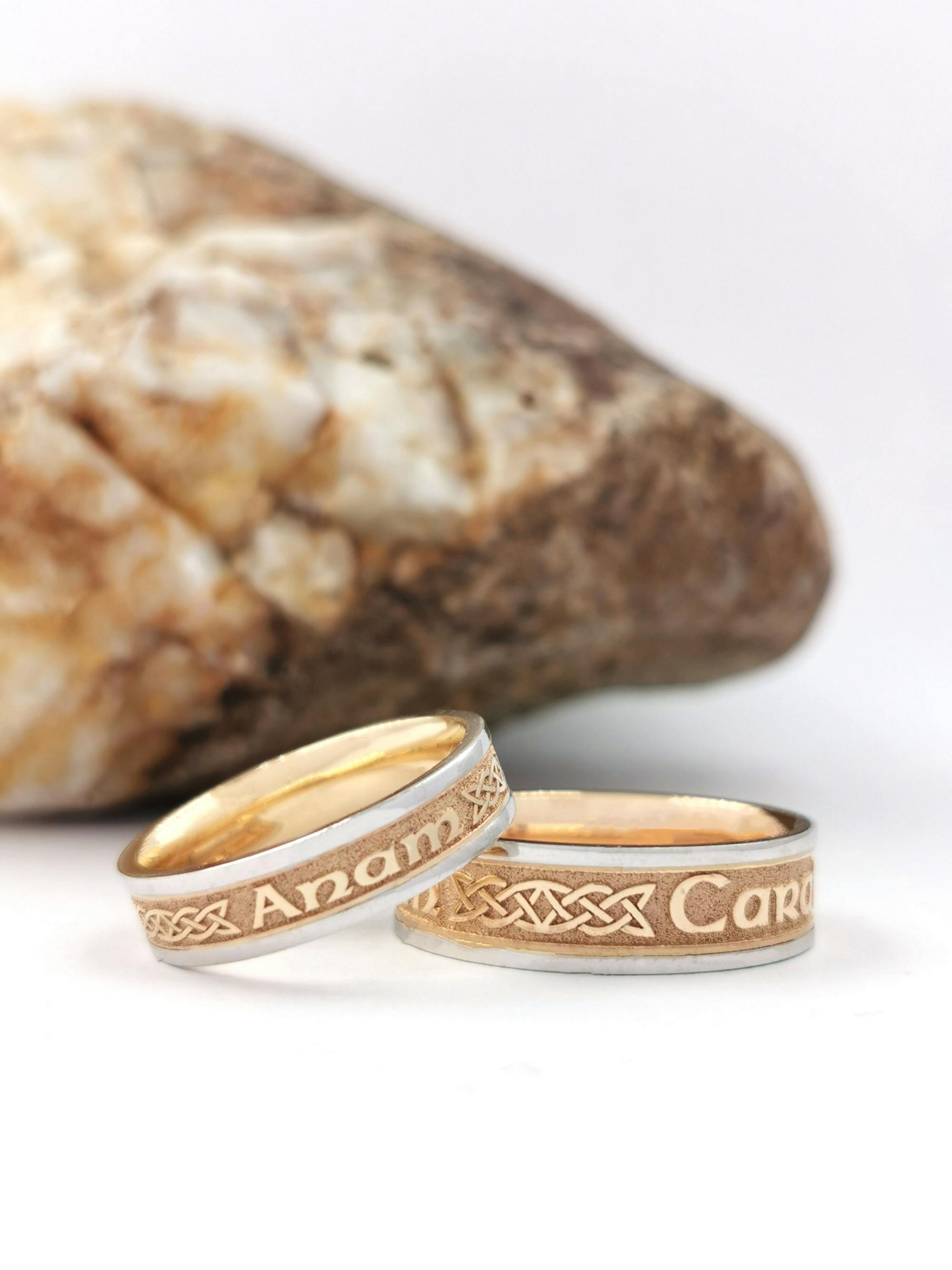The bands are embossed with gaelic script which reads "Mo Anam Cara", a phrase we know today as "My Soul Mate". The ancient Celts believed that when two individuals formed a deep and lasting bond their souls would mingle. Each person had found their "Anam Cara", or soul friend. This lovely sentiment is enhanced by embossed Celtic love knots that punctuate the script. An ancient symbol of unbroken and eternal love. Beautiful details that stand out against a matte background finish, framed by polished contrasting trims.