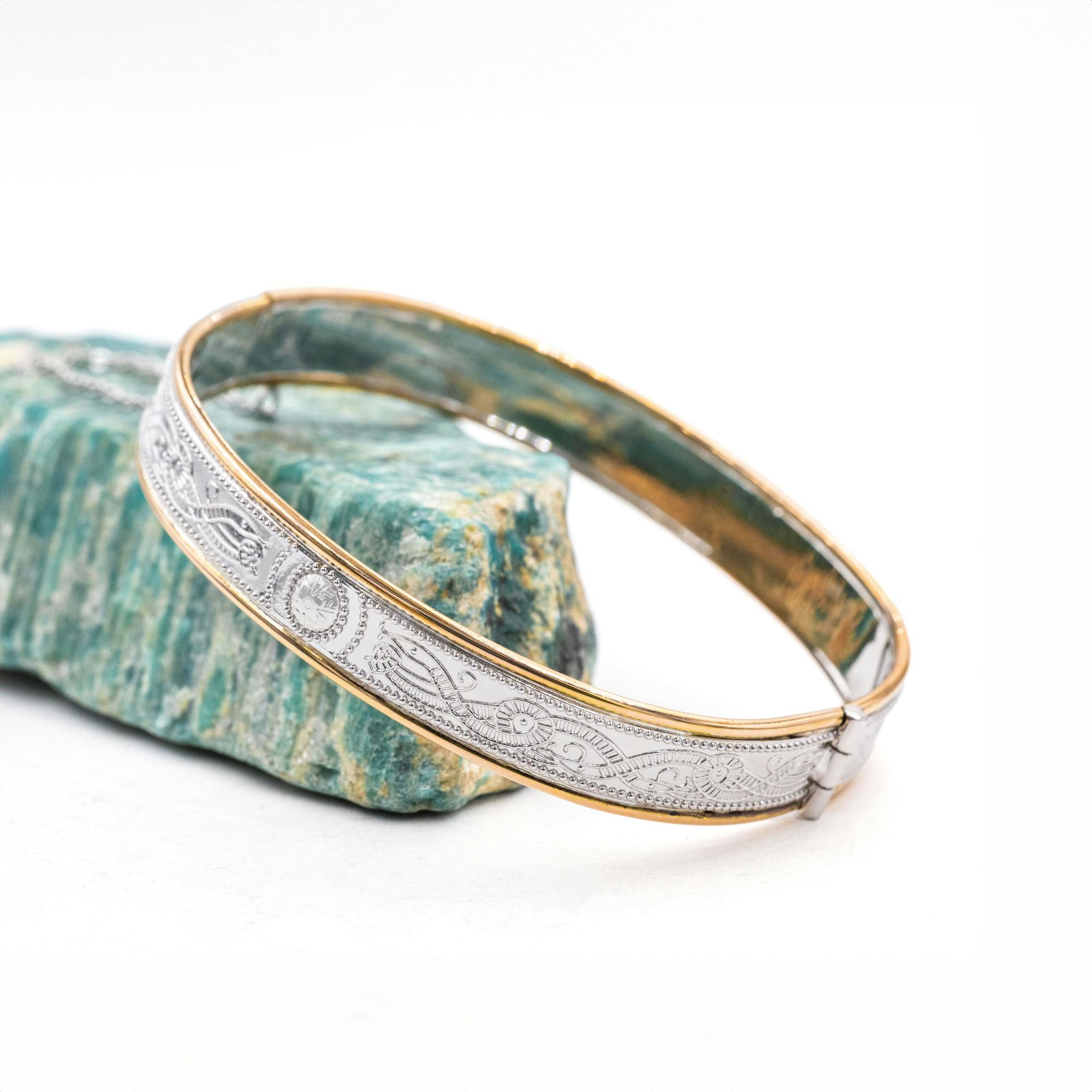 Inspired by ancient Irish treasure, this exquisite bangle is an exceptional piece of jewelry that is both wearable and attention grabbing.