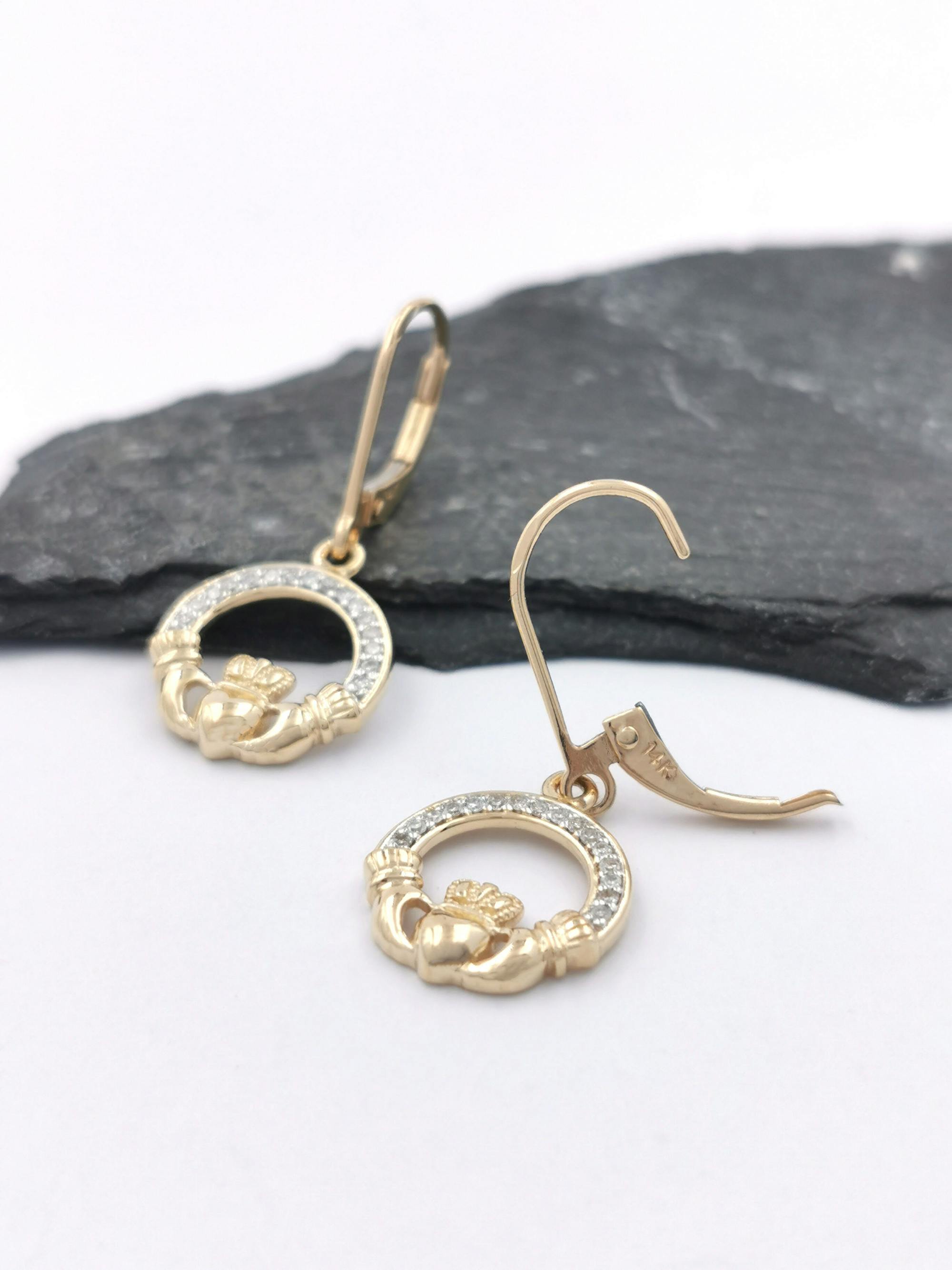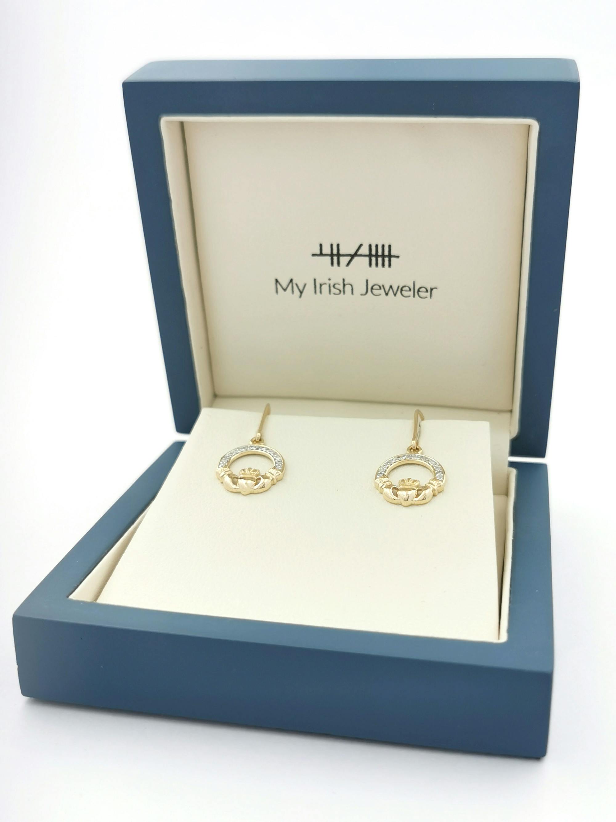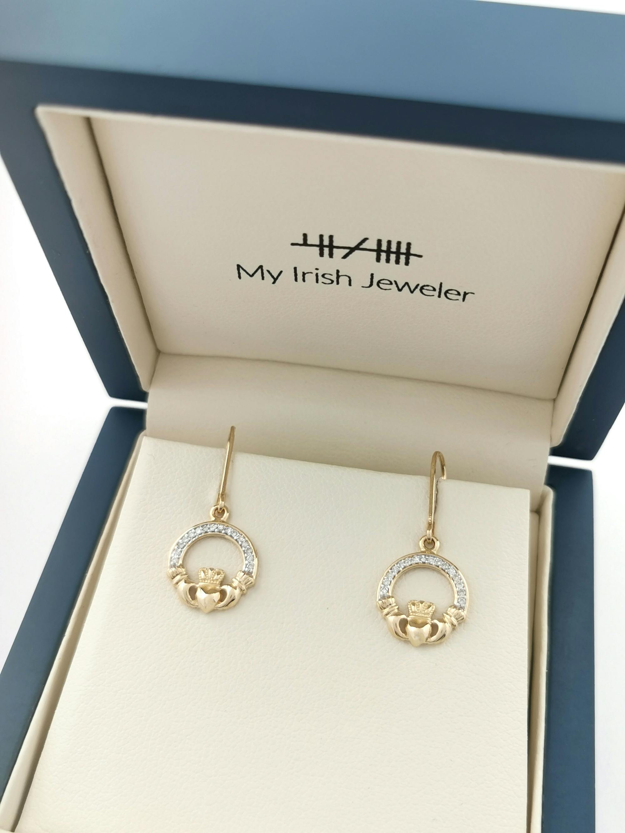 Love the combination of 14K yellow gold, diamond and the claddagh? Why not complete the set with our matching 14K yellow gold diamond set claddagh necklace?