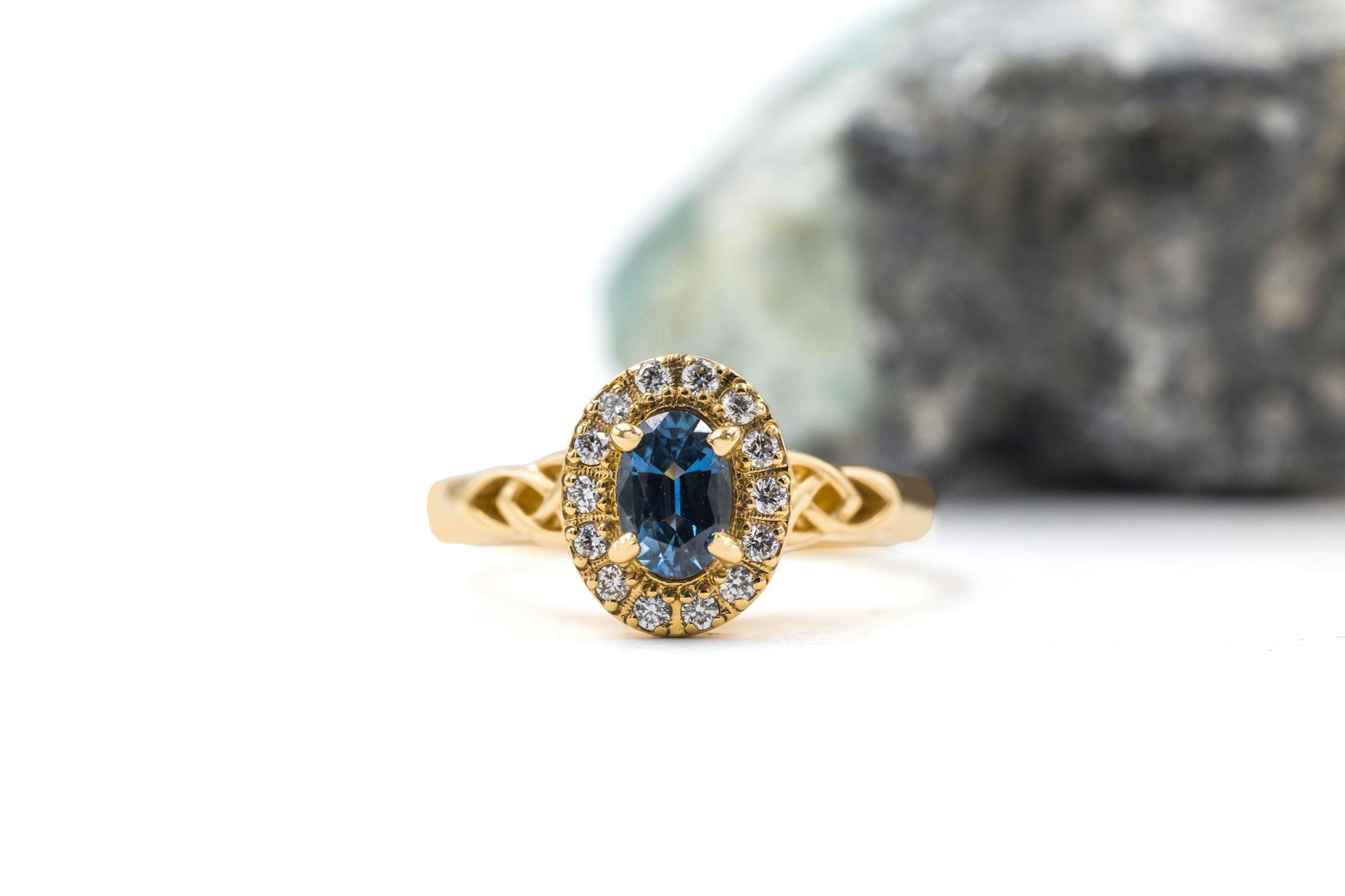 This elegant and timeless gemstone set, half carat, oval halo ring combines beauty and depth of meaning. Make this ring your own with your choice of a stunning sapphire, vibrant emerald, radiant ruby, or dazzling diamond at the centre of this stunning design. Your choice will be surrounded by a halo of glittering diamonds adding sparkle and drama and making for a very flattering oval profile on the hand.