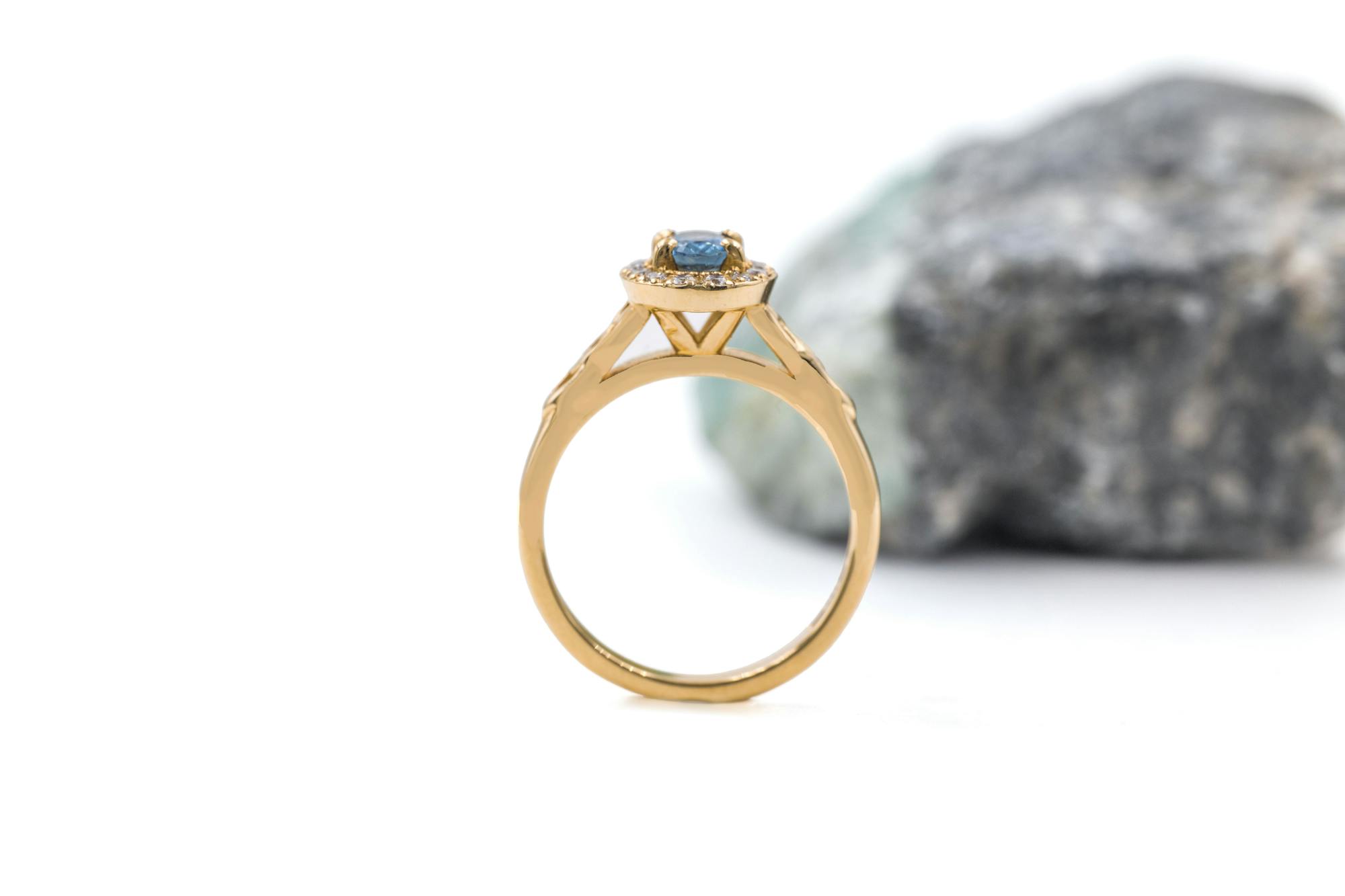 This Ring is set with a 0.50ct Oval shaped Natural Sapphire, with 14 Accent Stones.