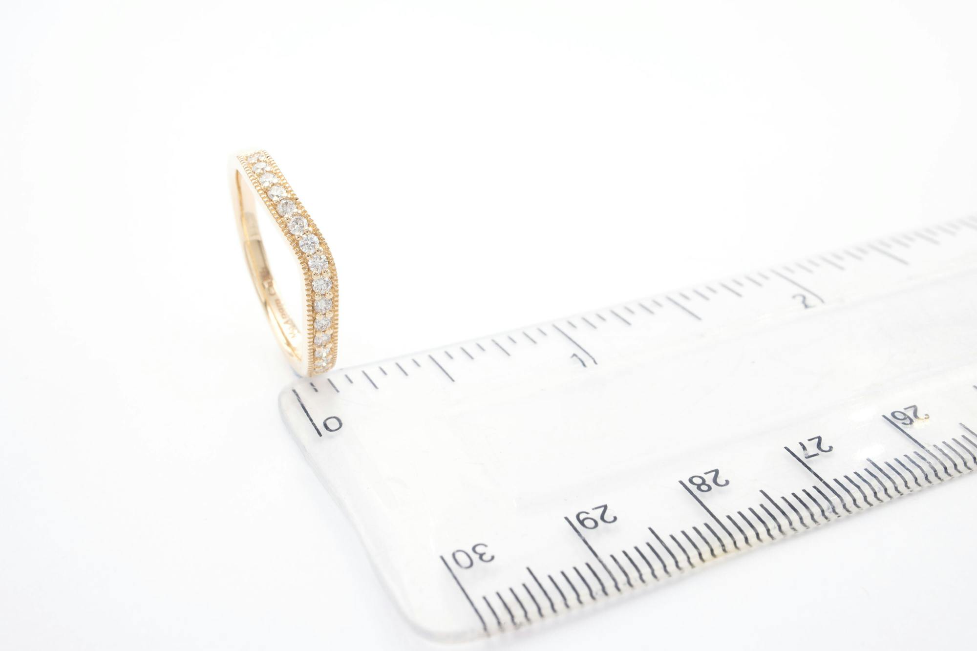 Expertly crafted in fine 14k gold, the millgrain detailing adds a touch of vintage glamour to this beautiful and romantic ring. Set with 0.20 cts G colour, S1 pave diamonds, this band will also add serious sparkle and shine to the bridal look or can be added to a ring "stack" to mark an important anniversary. Narrowing from 3mm to 2mm, this ring sits very comfortably on the hand to be worn proudly every day.