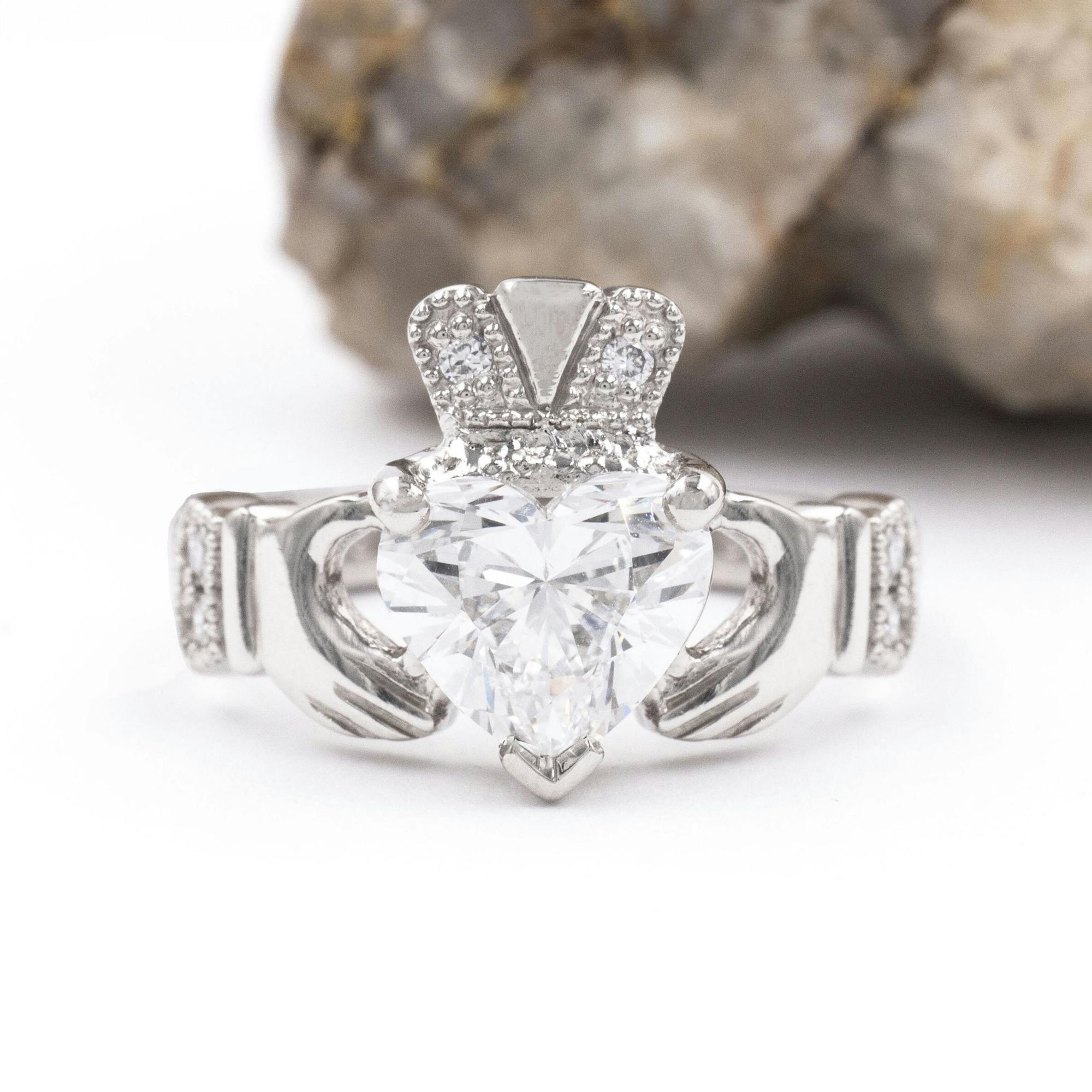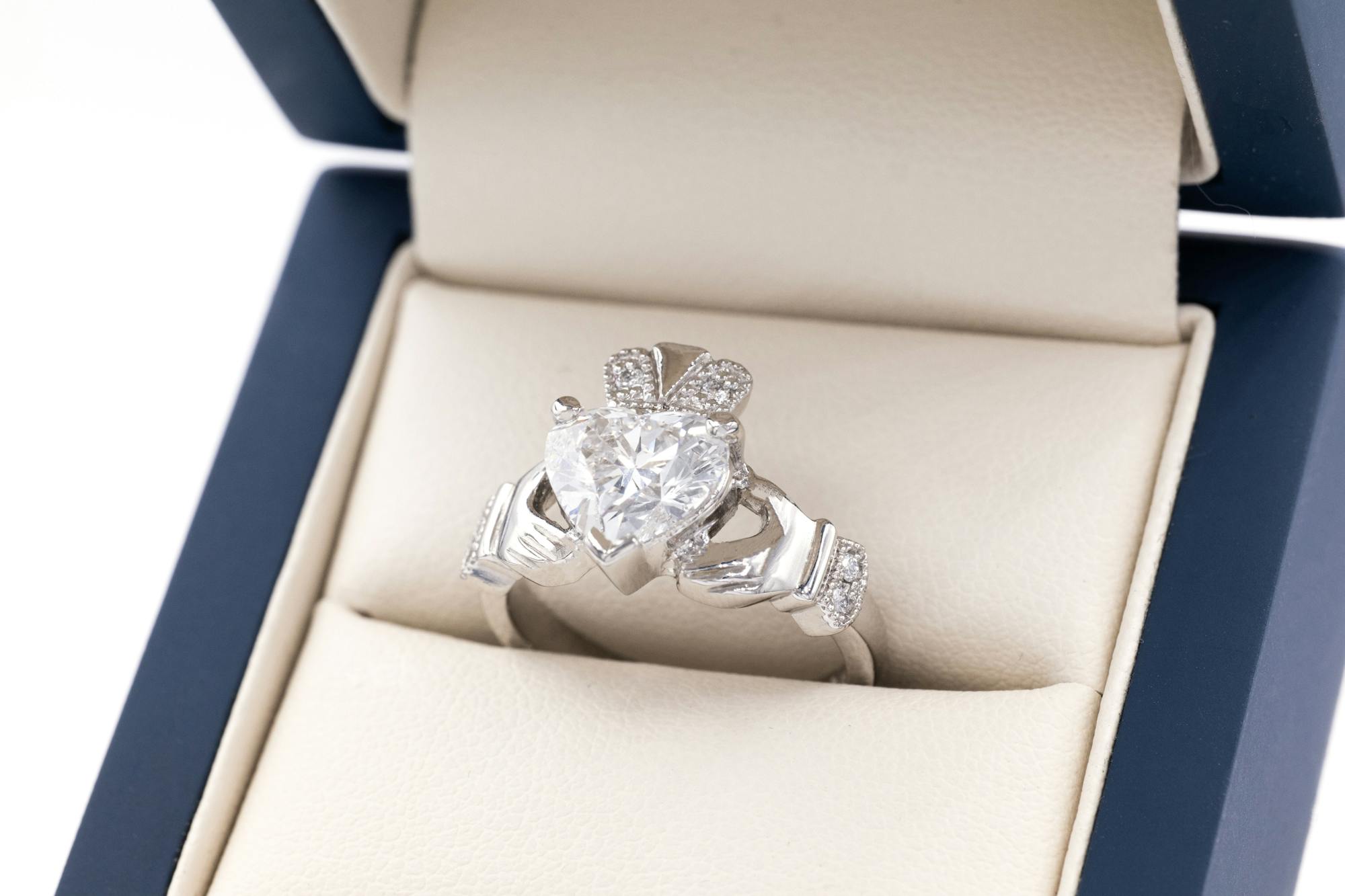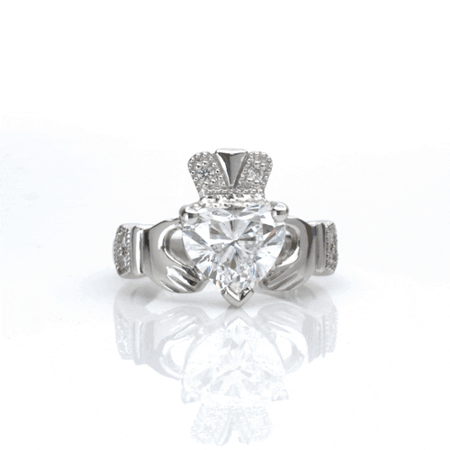 Romantic sentiment combines with dazzling beauty in this top-of-the-range, 2 carat diamond Claddagh ring. It is a promise of love, loyalty and friendship and a centuries old Irish tradition where each elegant element has meaning. The dazzling lab diamond heart represents love, the crown is loyalty and finally the graceful hands of friendship. Perfect symbolism for a ring to move even the most romantic heart.