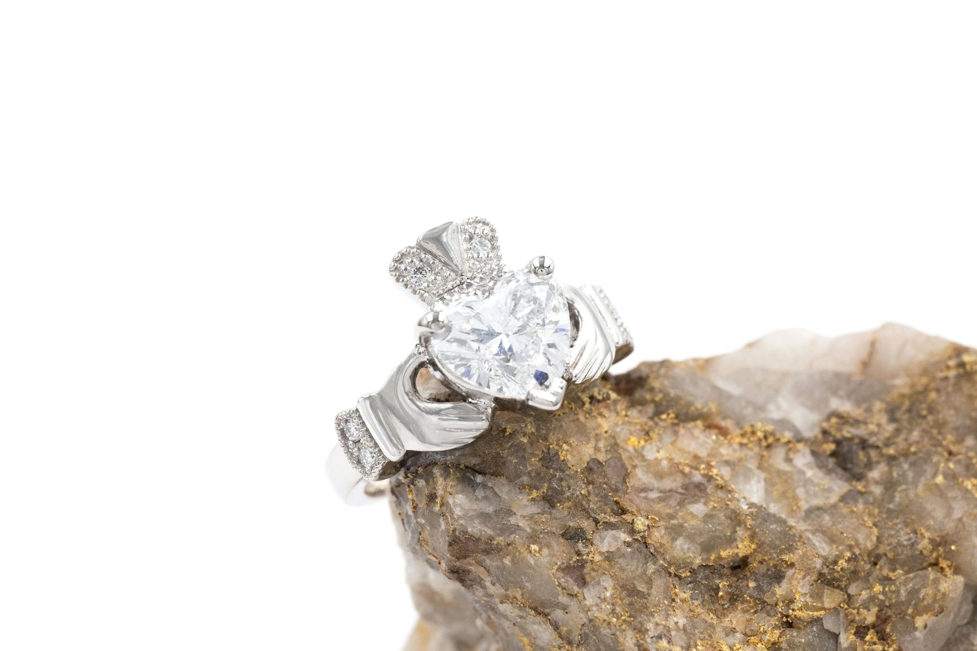 Crafted in premium precious metals, the ring as a pleasing weight and presence on the hand. For all that drama, and substantial carat weight, the Claddagh setting has quite a streamlined profile, making this a surprisingly wearable and comfortable ring on the hand. The setting also provides protection for that stunning diamond, ensuring it will look beautiful throughout every day of your lifetime and can be passed on as a cherished heirloom. Look no further for a romantic ring with style and a beautiful history to compliment your own unique love story.