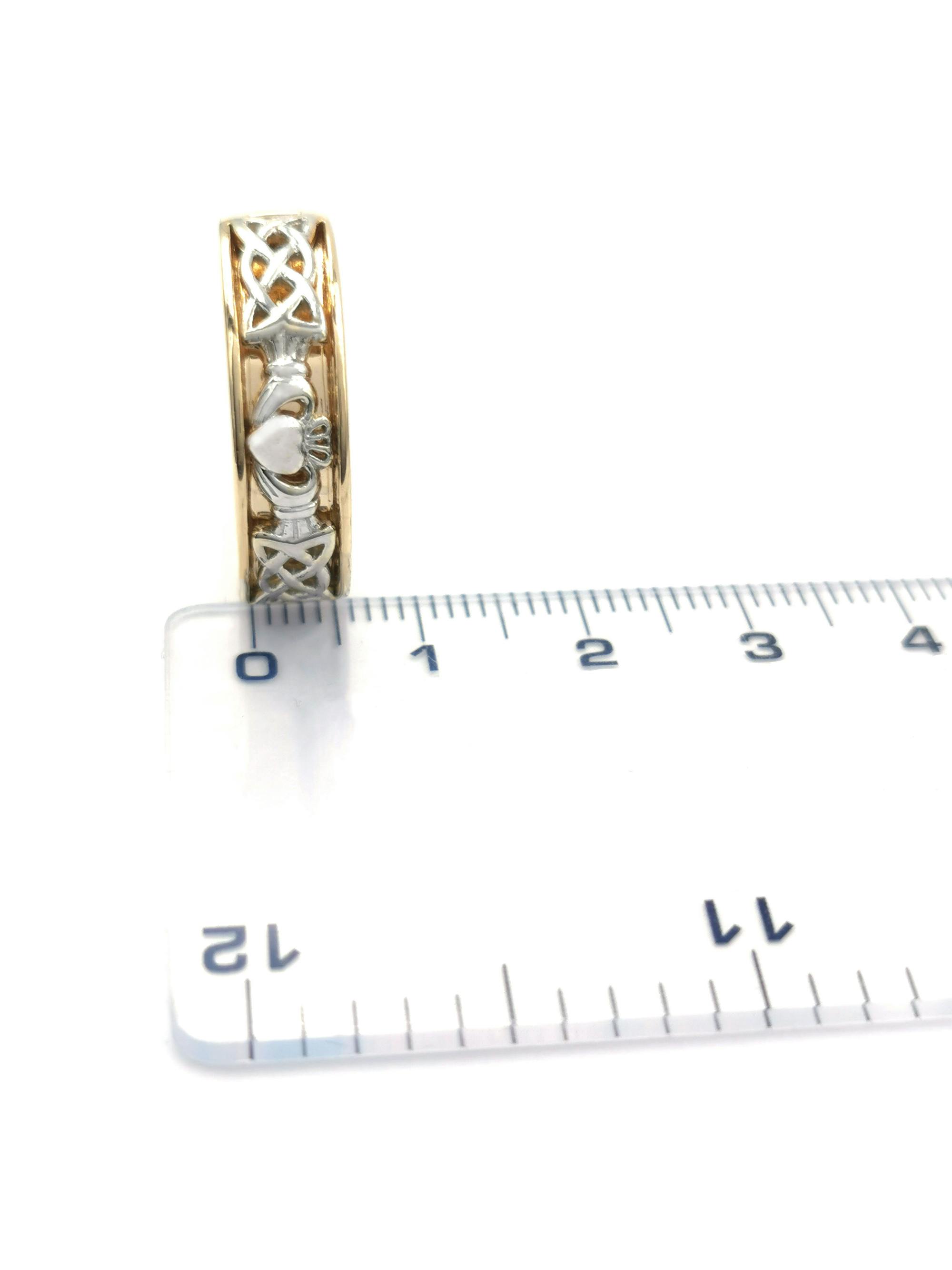 The front of the band features a Claddagh symbol between two Celtic Love Knots. The reverse of the band is plain polished gold.