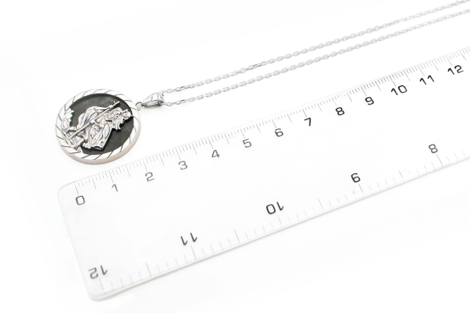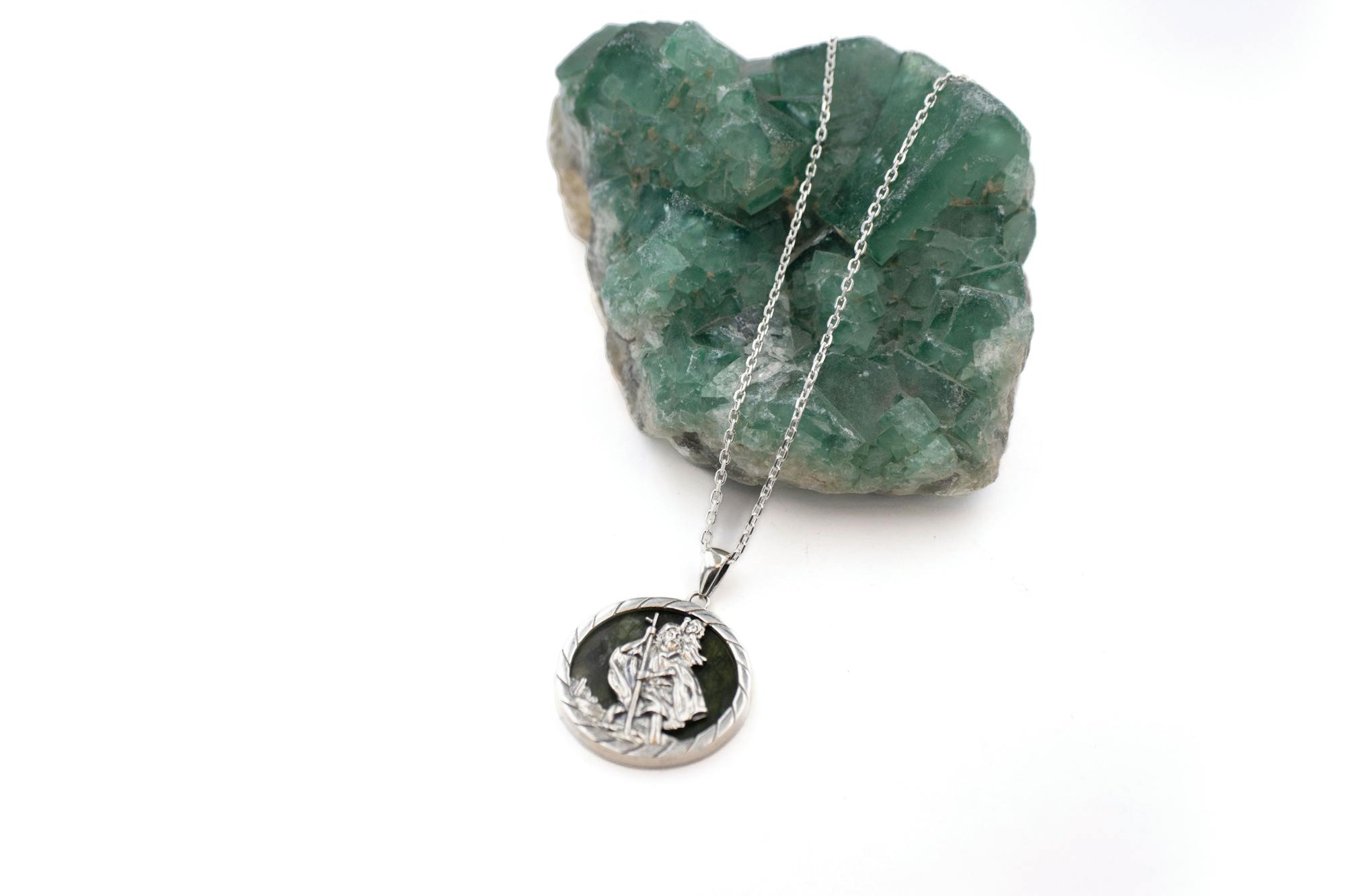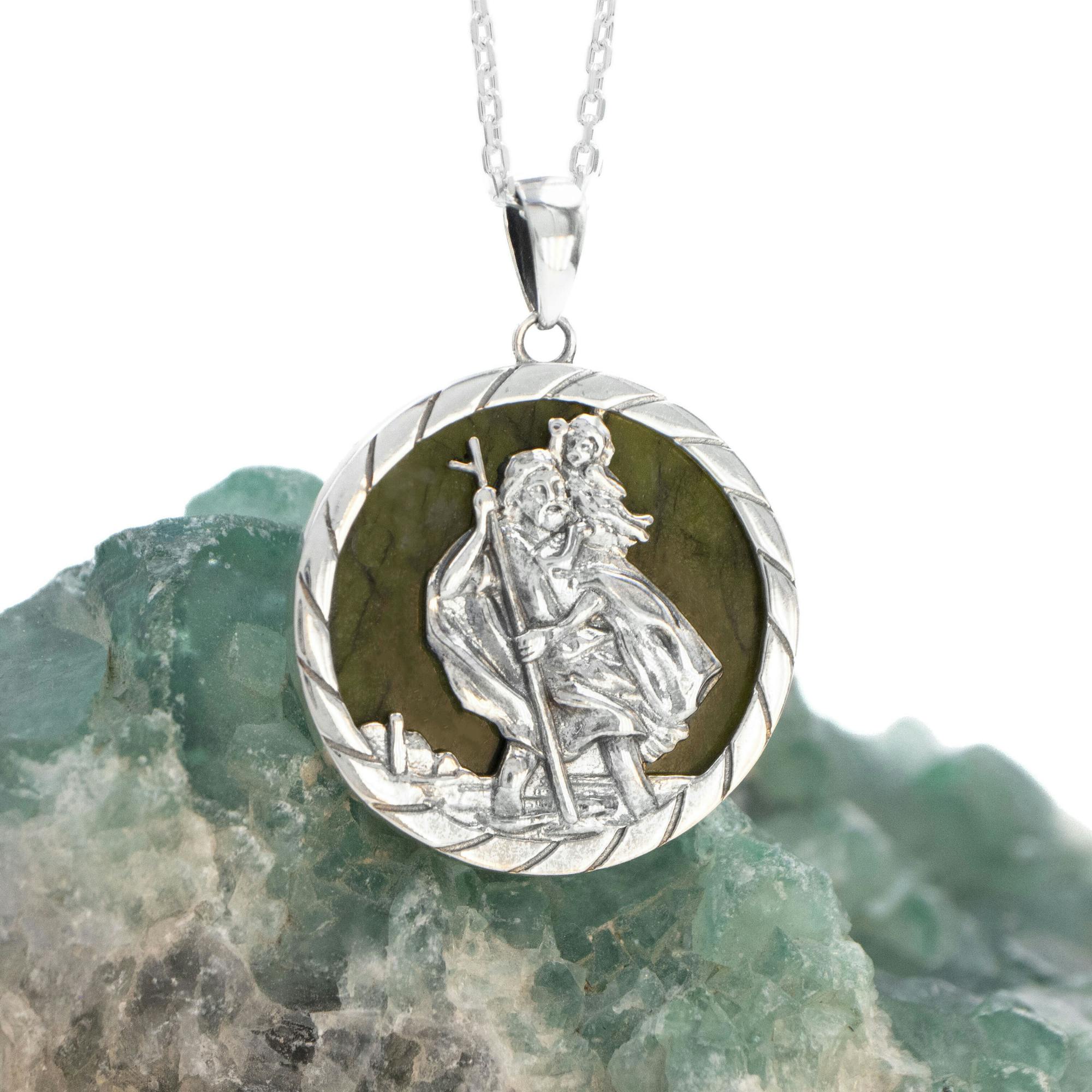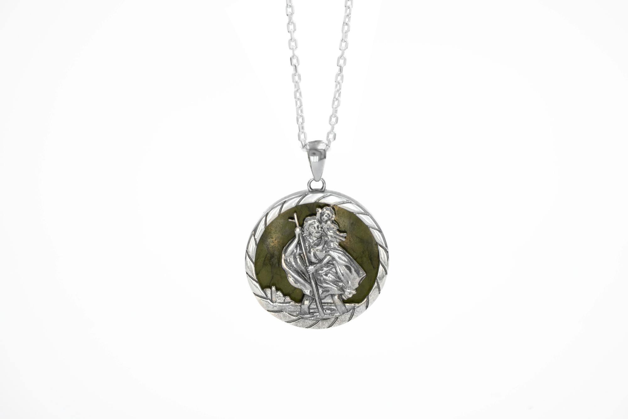 Expertly crafted, this medal depicts St. Christopher carrying a child safely across a river on his shoulder, staff in hand, silhouetted against the rich and varied green tones of Ireland's gemstone, Connemara marble.