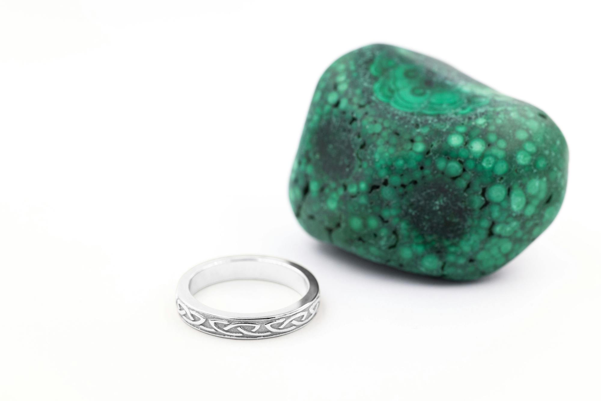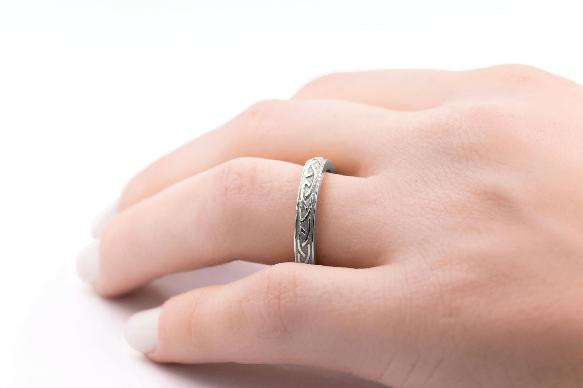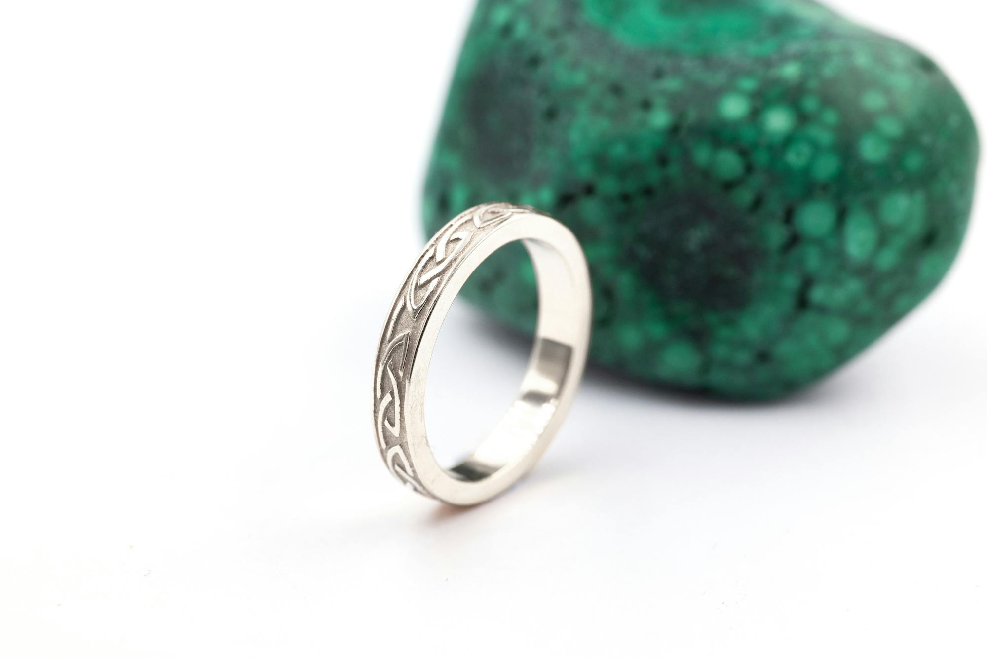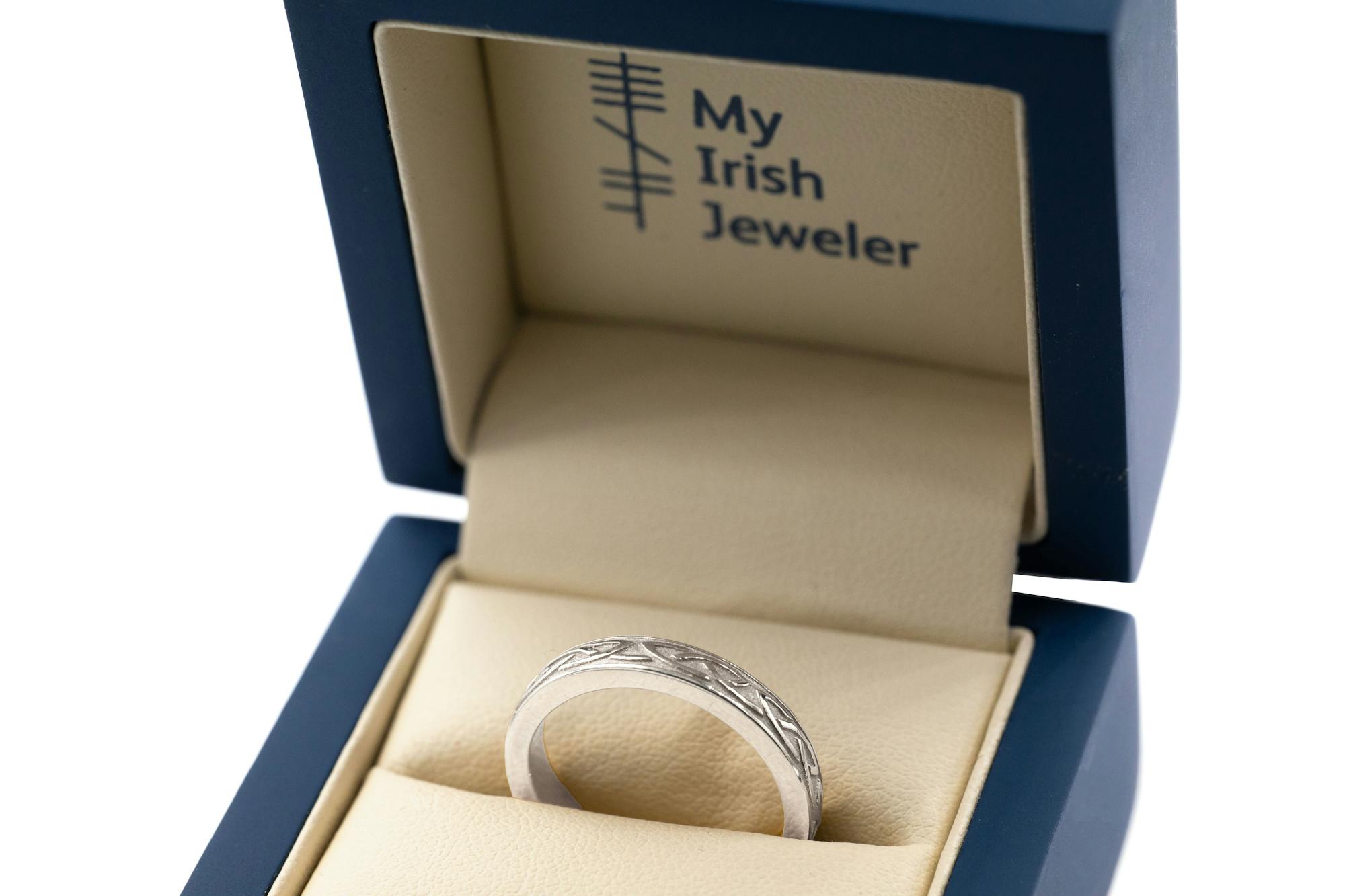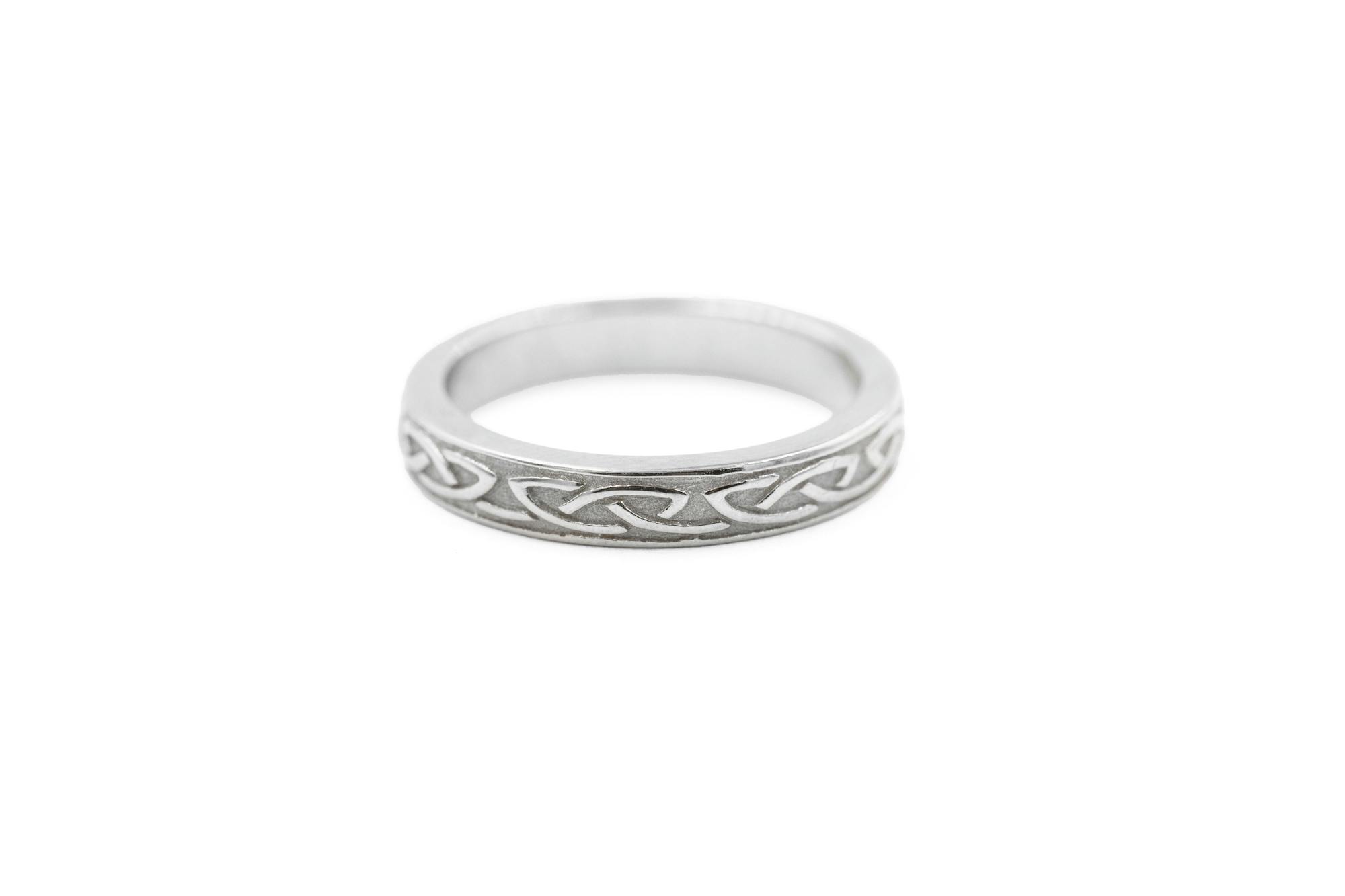 This ring features a polished & embossed Celtic Knot design where the pattern repeats all the way round the band. The area behind the design has a lovely satin or brushed finish which really makes the pattern stand out.