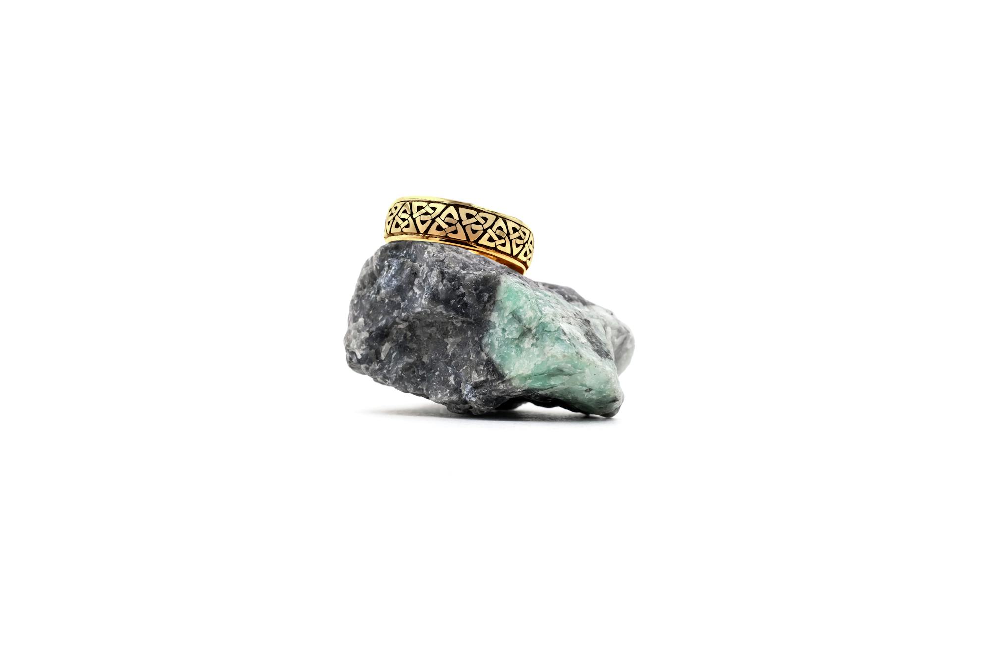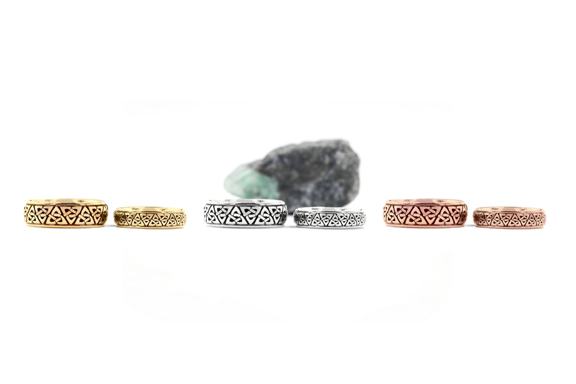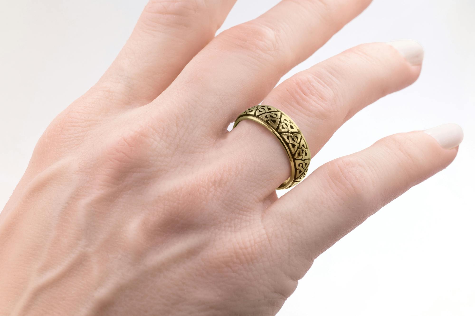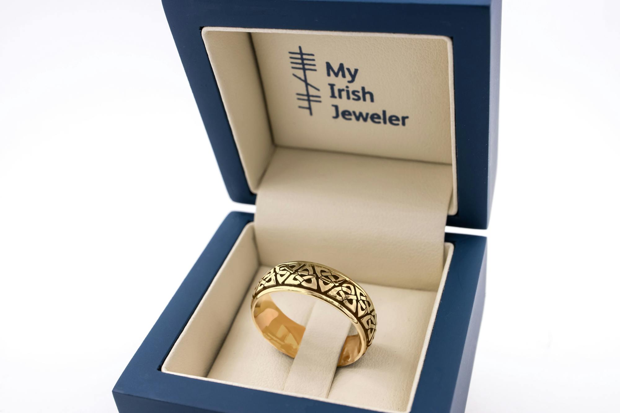 With a repeating motif around the entire band, this ring is expertly made and crafted to the highest standard. The Trinity Knots are crisp and eye catching against a dark, antique style finish. With a comfort fit, this ring has style and substance with a beautiful weight and feel on the hand. With a choice of metals and band width, it is the perfect unisex rings, ideal for couples looking for matching bands.