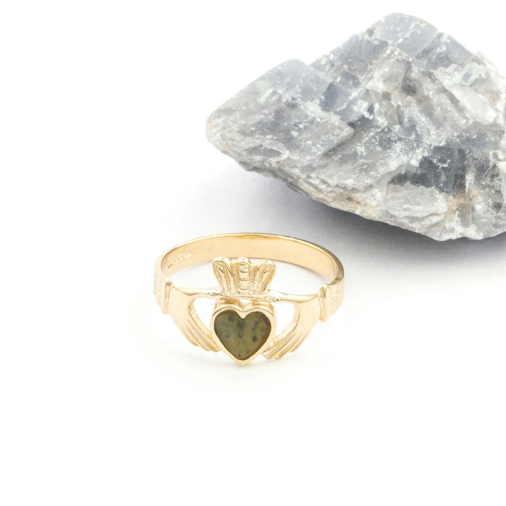 This 10K gold Claddagh ring has been set with a heart of Connemara Marble. Found exclusively on the West Coast of Ireland, Connemara Marble is known to many as the Irish gemstone. This stone adds a beautiful flourish to the iconic hands, heart and crown of the Claddagh design.