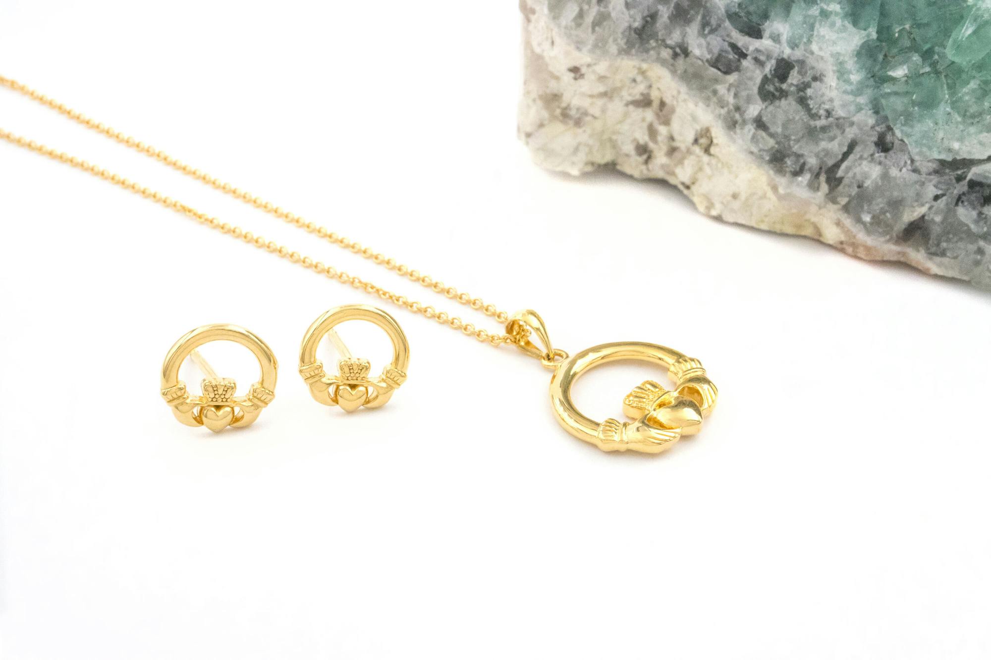 With a detailed crown, heart and hands of the iconic Claddagh joined in a graceful rounded arc, this elegant gold vermeil necklace and earring set has historic symbolism to rival its beauty.
