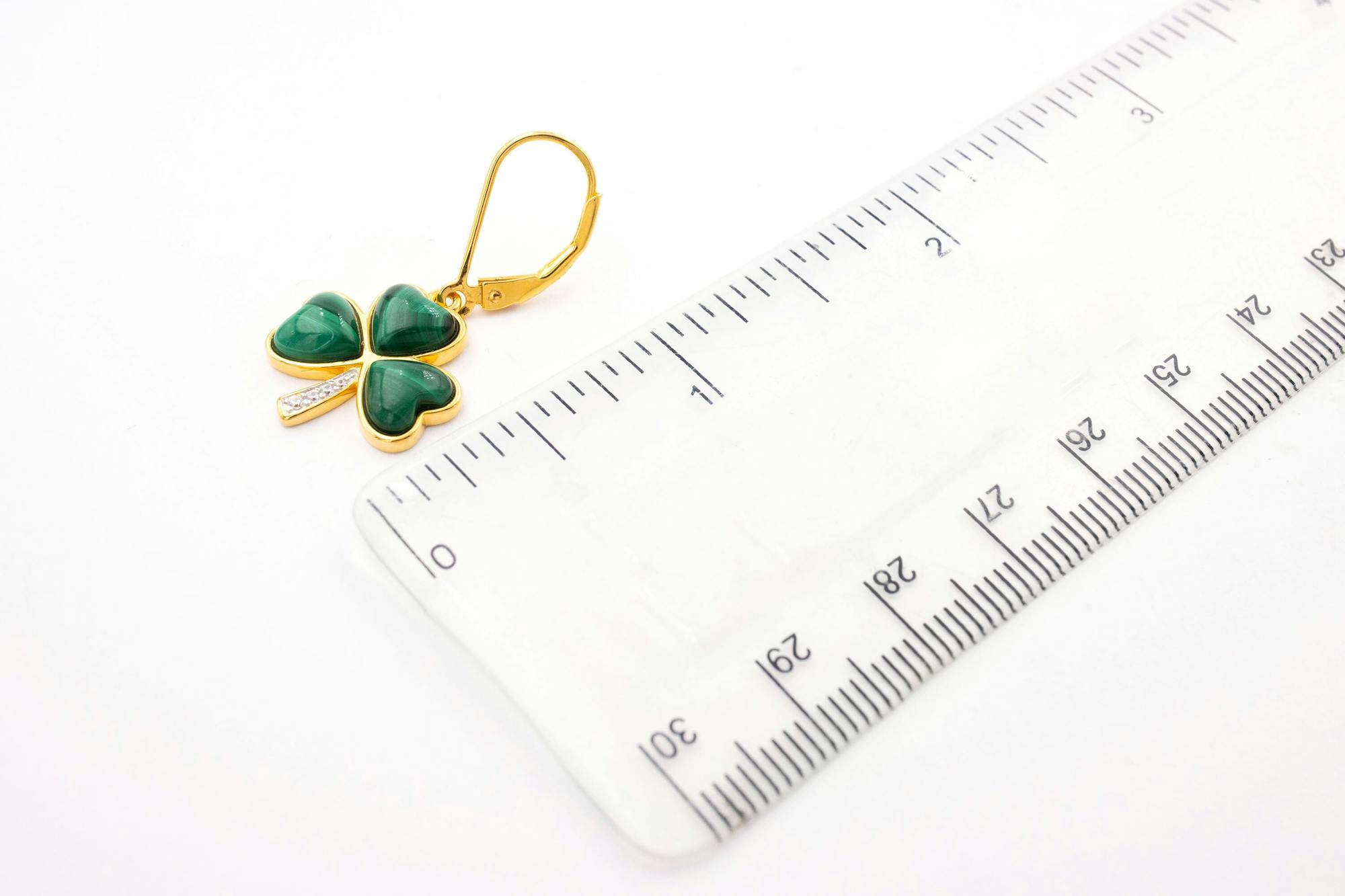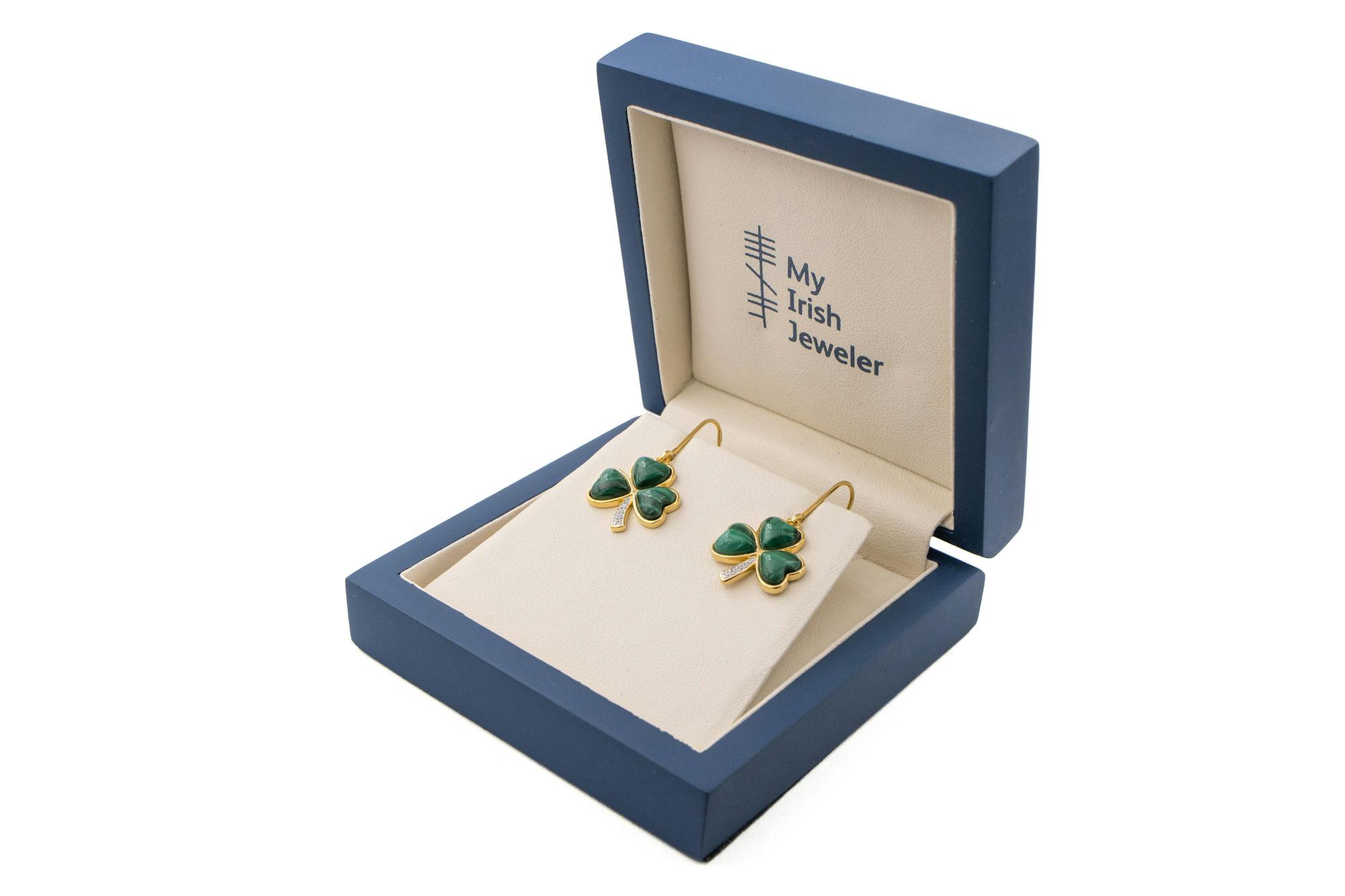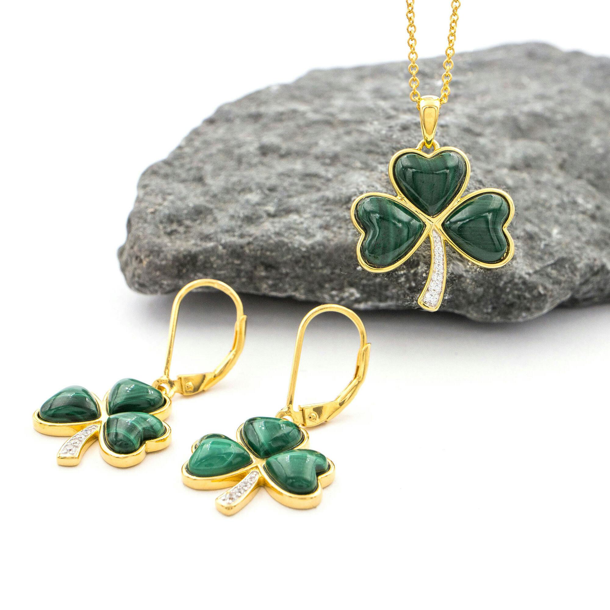The striking pairing of warm gold vermeil and vibrant green malachite as well as this lovely symbolism makes this set a wonderful gift. The sparkling cubic zirconia in the stem of the shamrock add a playful touch of sparkle.