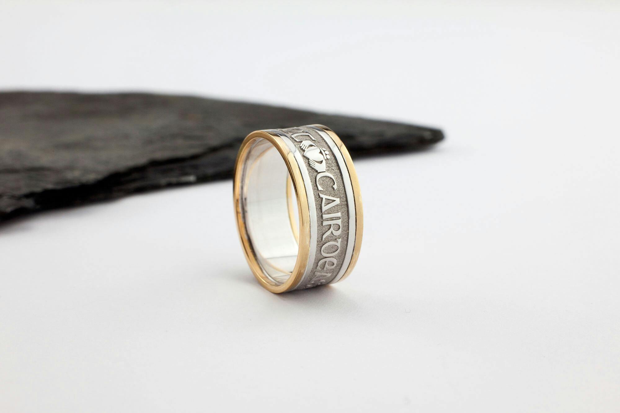 This ring has been inscribed with the words "Gra Dilseacht Cairdeas" in the Irish language. This translates to 'Love Loyalty and Friendship. The ultimate Love symbol to wear that signifies the eternal promise of the marriage vow or serious commitment. In-between the wording, Claddagh symbols are dispersed at intermittent spaces around the band.