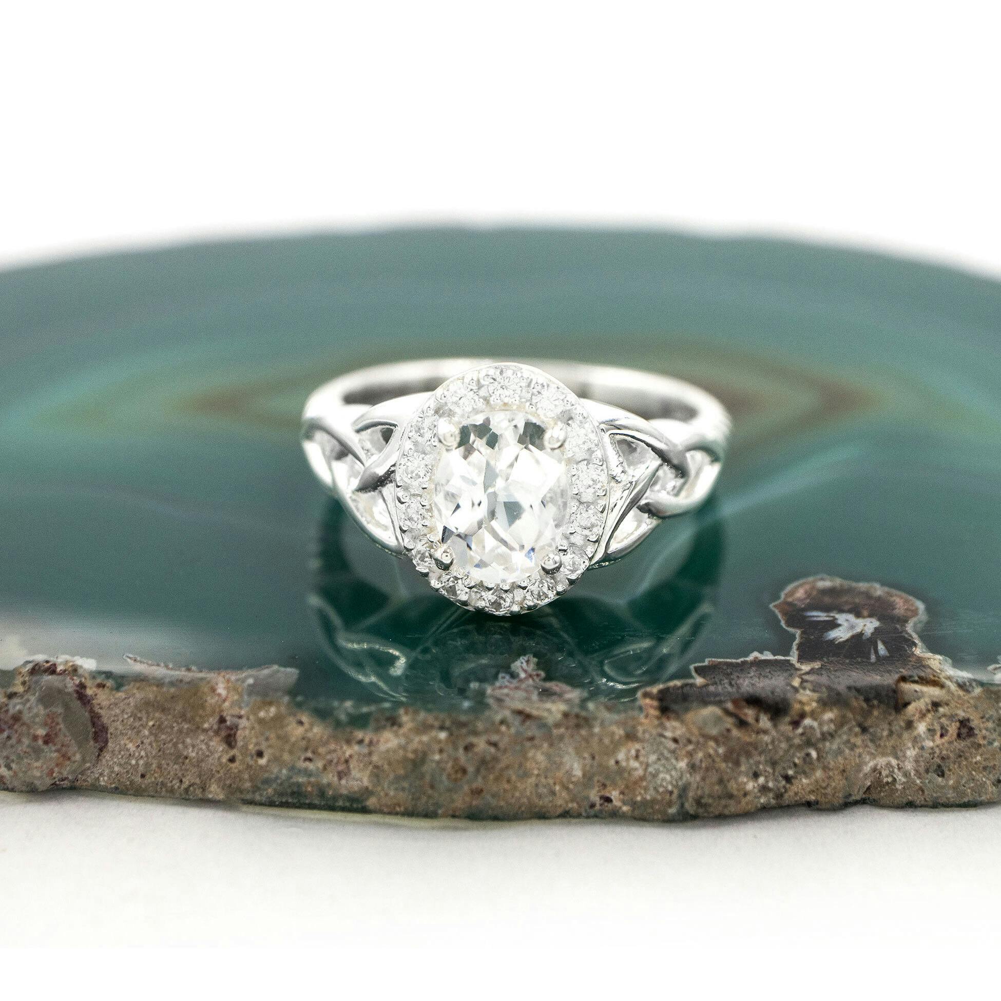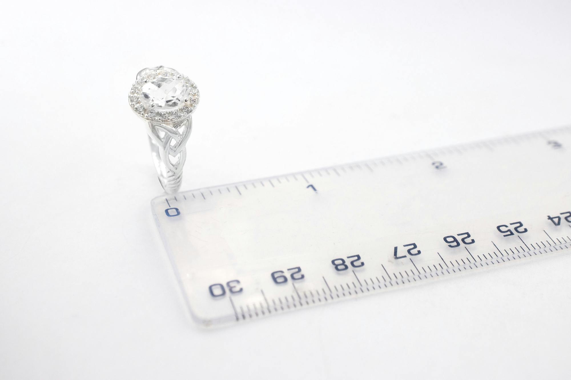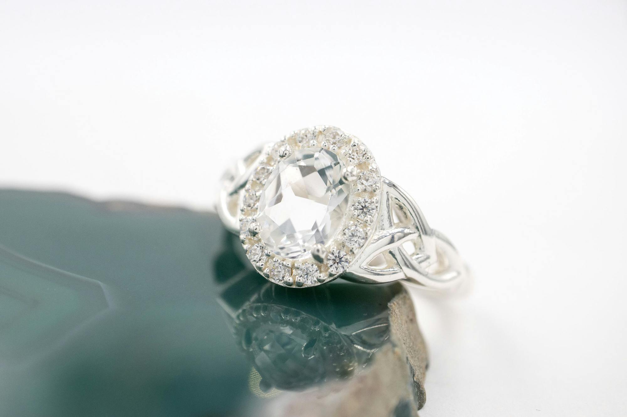 An expertly cut and polished oval gemstone in a four-prong setting is the focal point of the stunning Sterling silver Halo Trinity Knot Ring. The faceted checkerboard cut adds scintillation, increasing the saturation and depth of colour for each carefully selected stone. With three dazzling gemstones to choose from, this ring is perfect for those seeking something unique, with a halo of pavé cubic zirconia adding sparkle and impact to a stunning design.