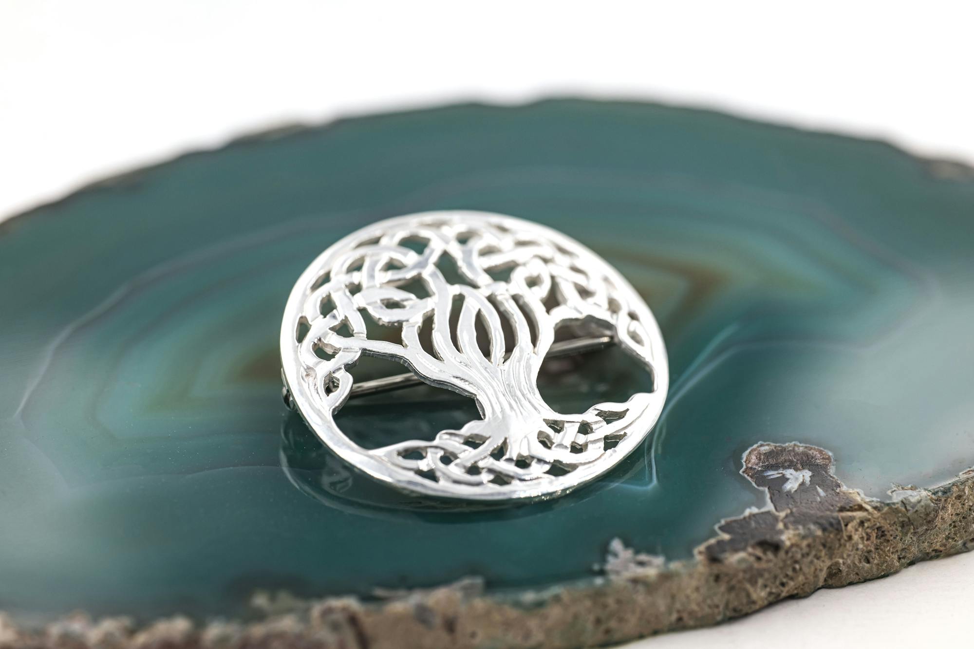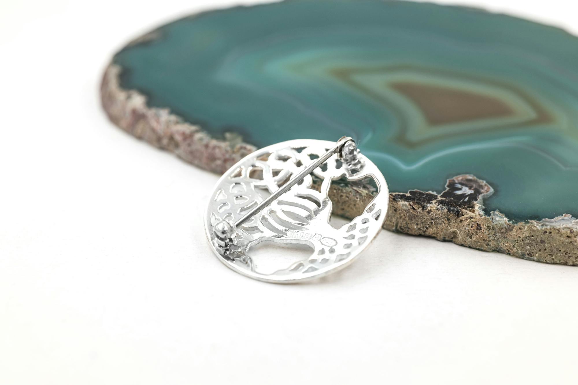 This handmade tree of life brooch is really something special. Solid, strong and robust, the tree is designed with graceful spreading branches that evoke a feeling of swaying motion. The overall impression is one of elegance with hidden strength and depth. The design has been painstakingly hand crafted with exacting precision by award winning master silversmith, Aidan Breen, for a brooch with splendid detail.