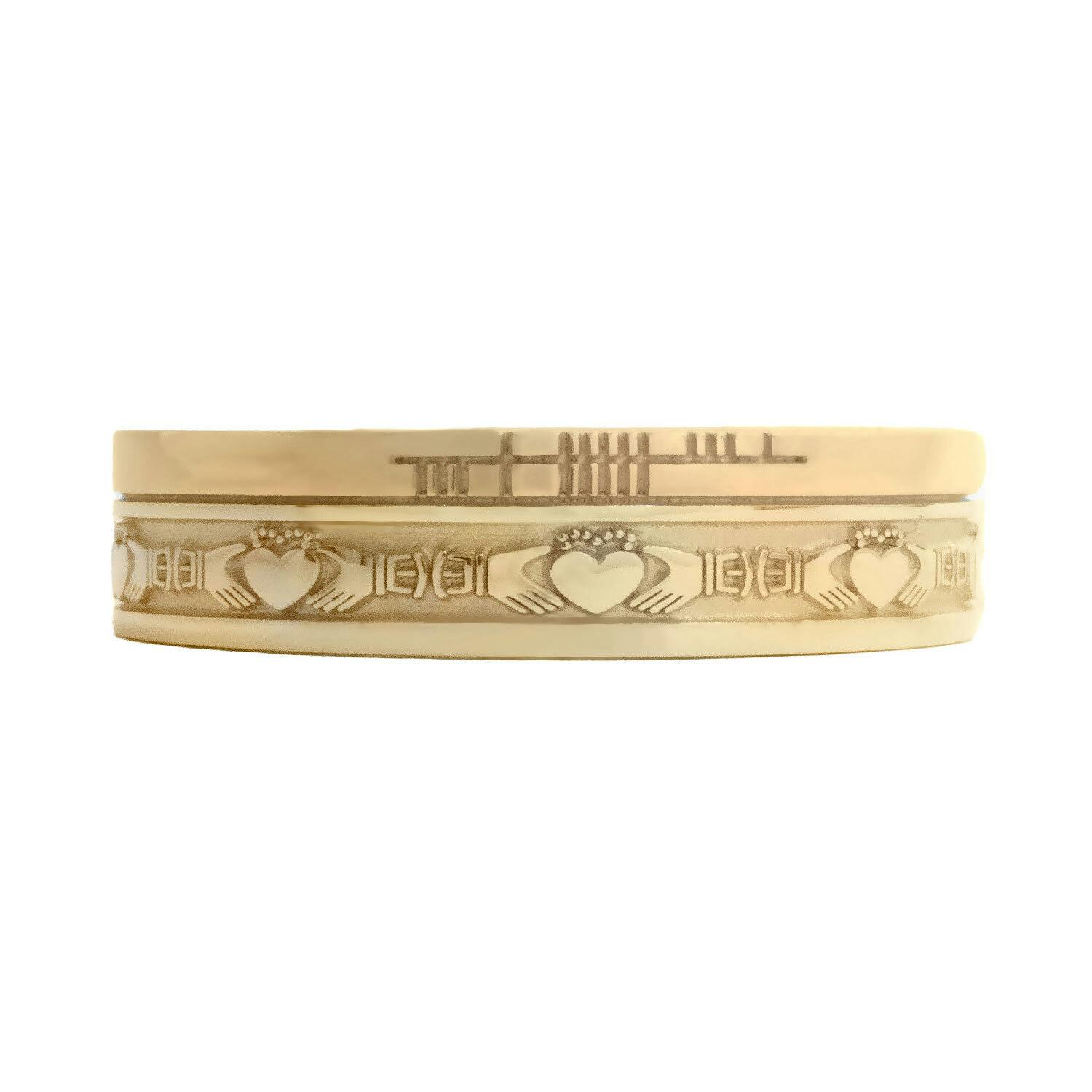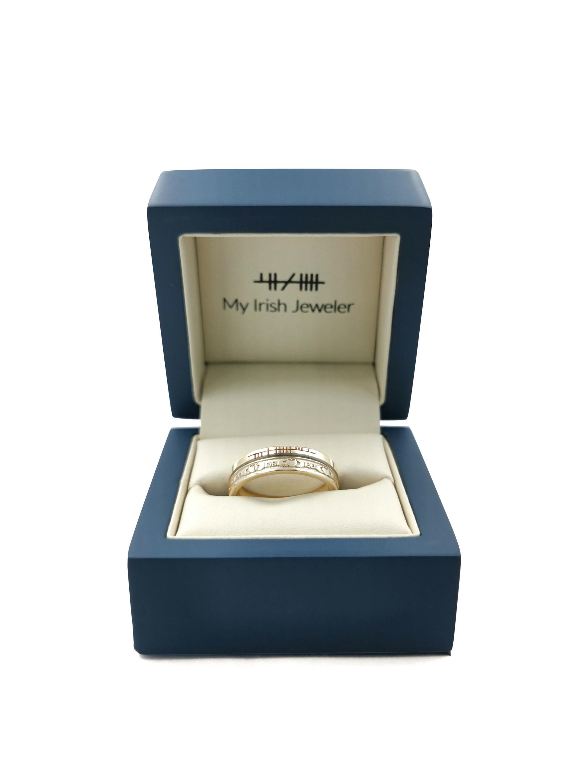 A heavyweight, comfort fit band featuring the traditional Irish Claddagh. A romantic symbol of love, loyalty and friendship, with roots that trace back to the wild atlantic coast, the Claddagh has been cherished and worn in Ireland for over 400 years.