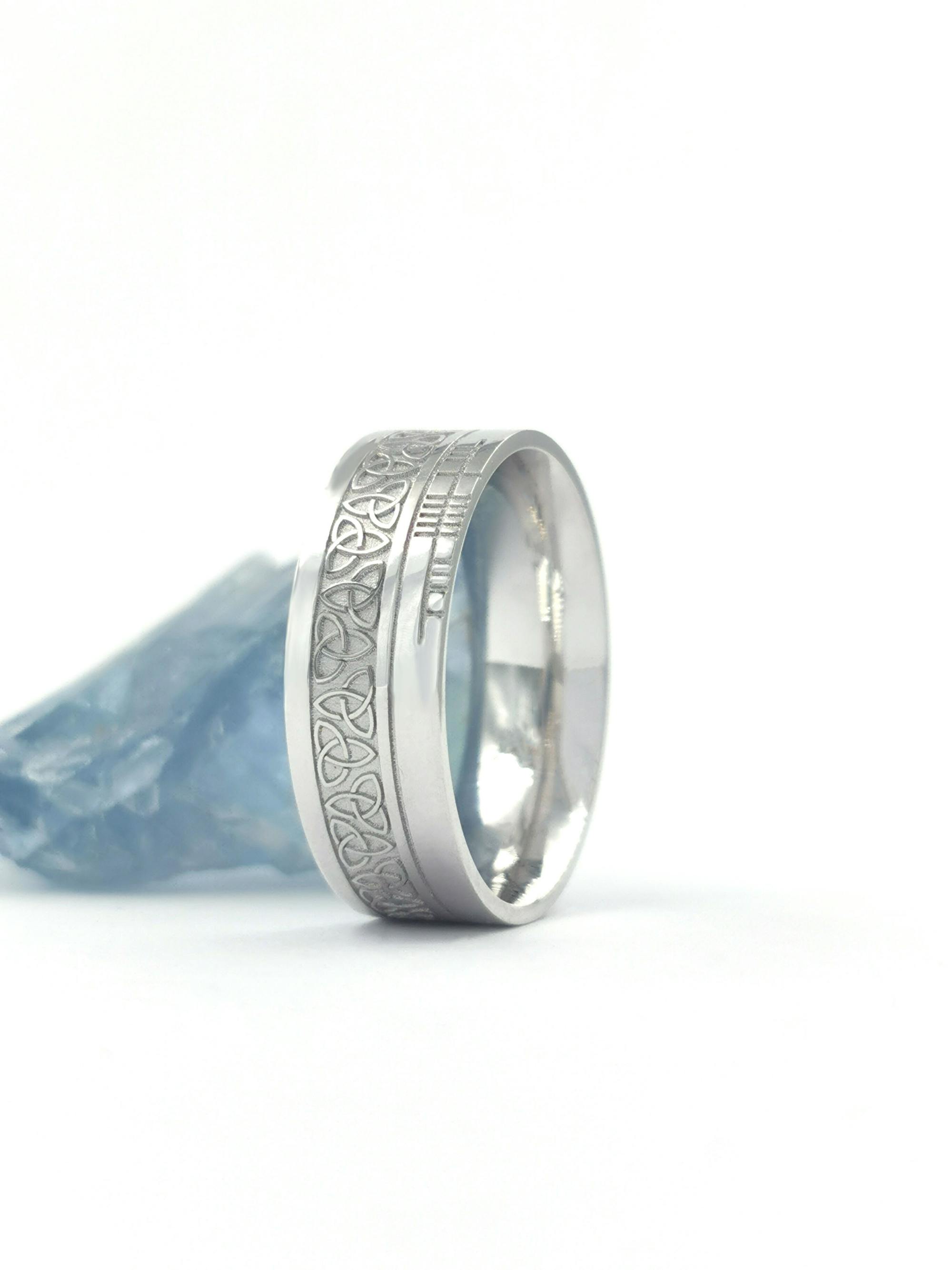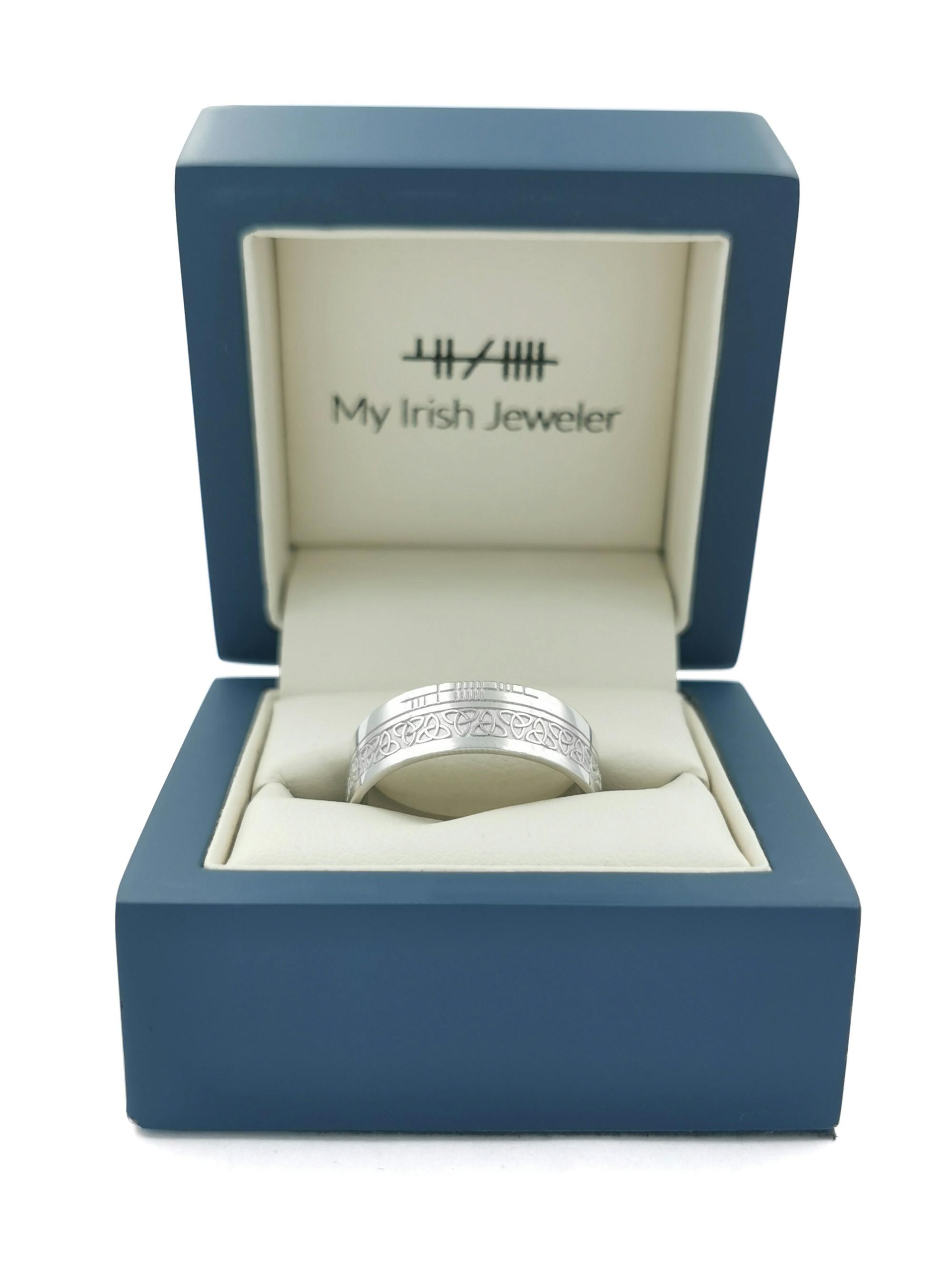 This stunning ring which incorporates both the Trinity Knot representing eternity, and the Ogham script, the alphabet of ancient Ireland. The ring is expertly made, crafted to the highest standard and has a beautiful weight and feel to it. The perfect unisex ring, ideal for couples looking for matching bands.