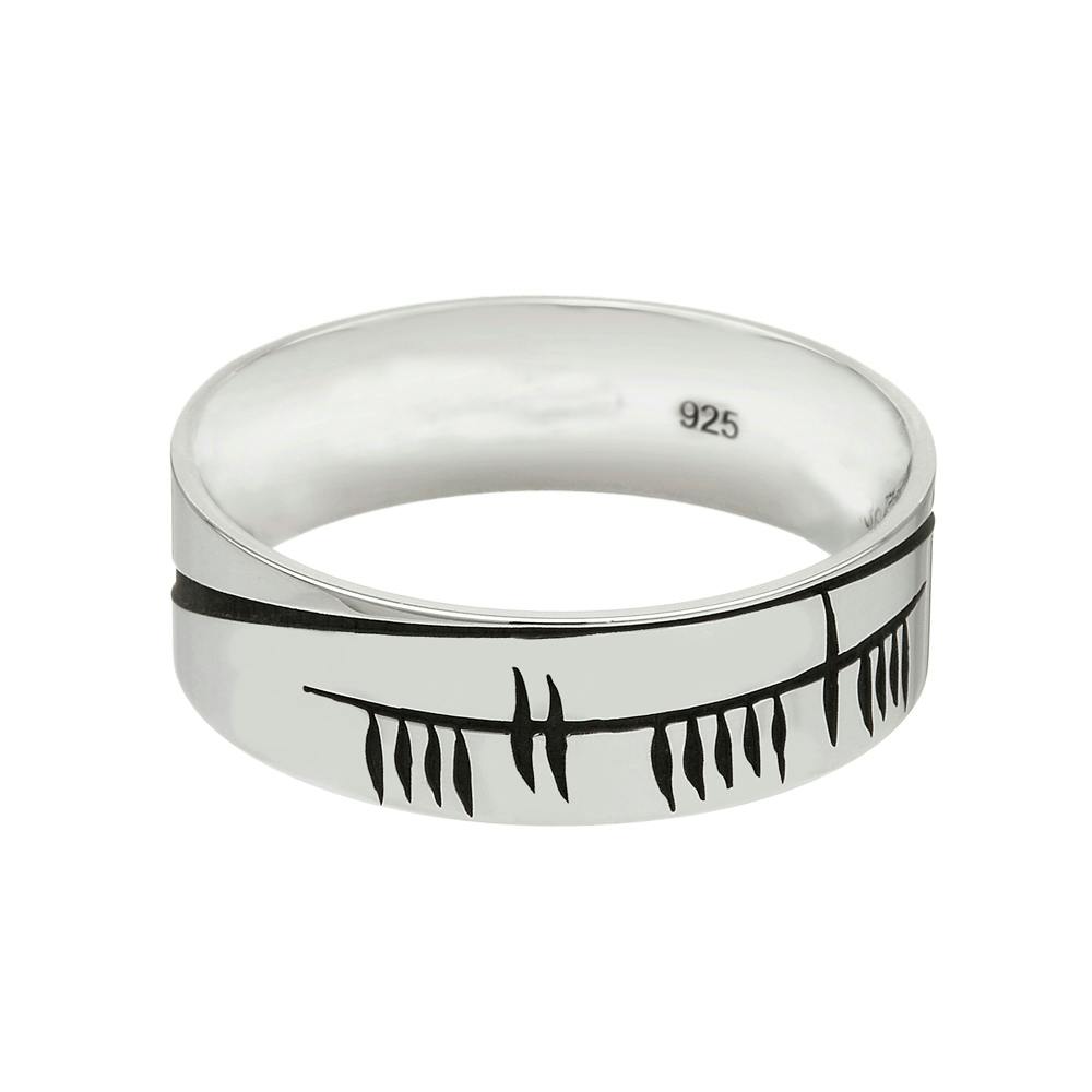 The word "Sonas" (pronounced sun-uss) is gaelic for Happiness. This ring features the word "Sonas" engraved in Ogham, the ancient Irish alphabet. The word Happiness is engraved inside in english.