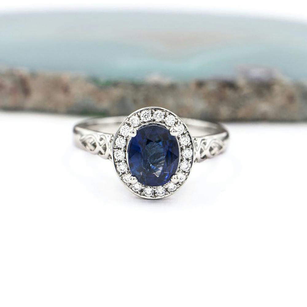 This Ring is set with a 1.03ct Oval shaped Natural Sapphire, with 18 Accent Stones.