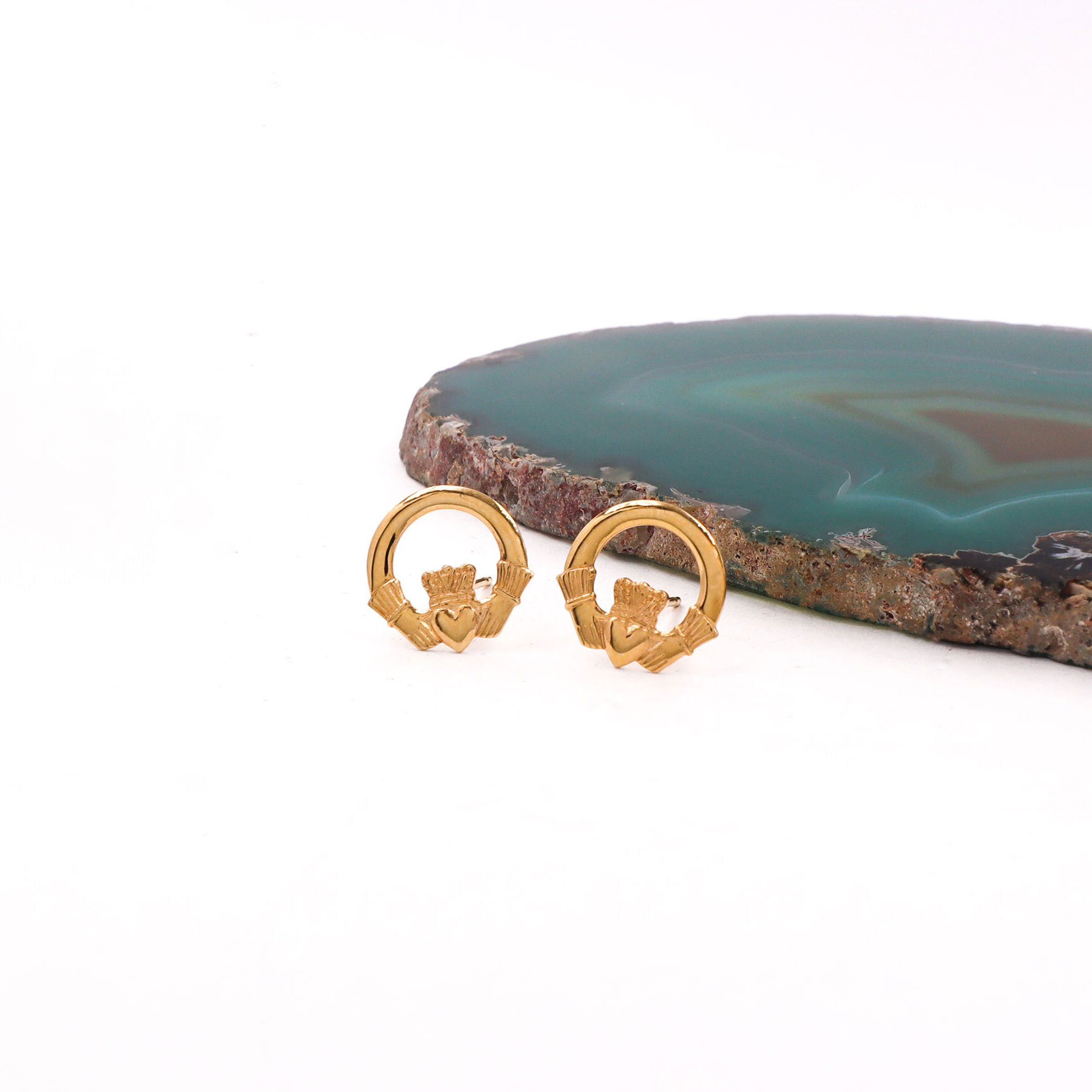 A timeless and classic pair of claddagh stud earrings in your choice of 10K or 14K yellow gold in small or medium size.