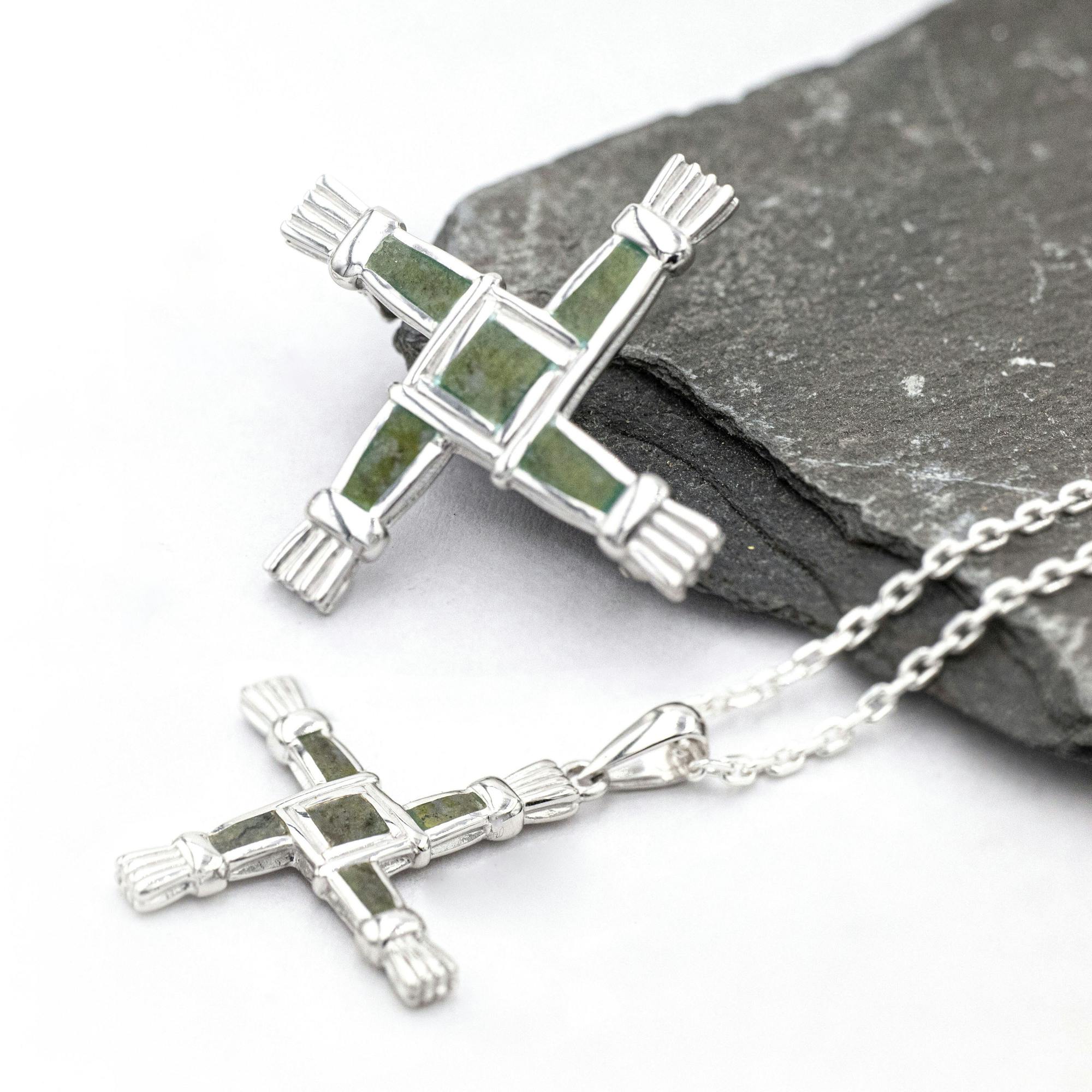 Faithful to the form of a traditional rush cross, with a textured feel, these striking matching pieces have been carefully crafted in solid sterling silver and set with iconic Irish Connemara marble. The instantly recognisable cross is an ancient design that traces its roots back hundreds of years to Ireland’s female patron saint, and beyond to the Celts and the goddess Brigid.