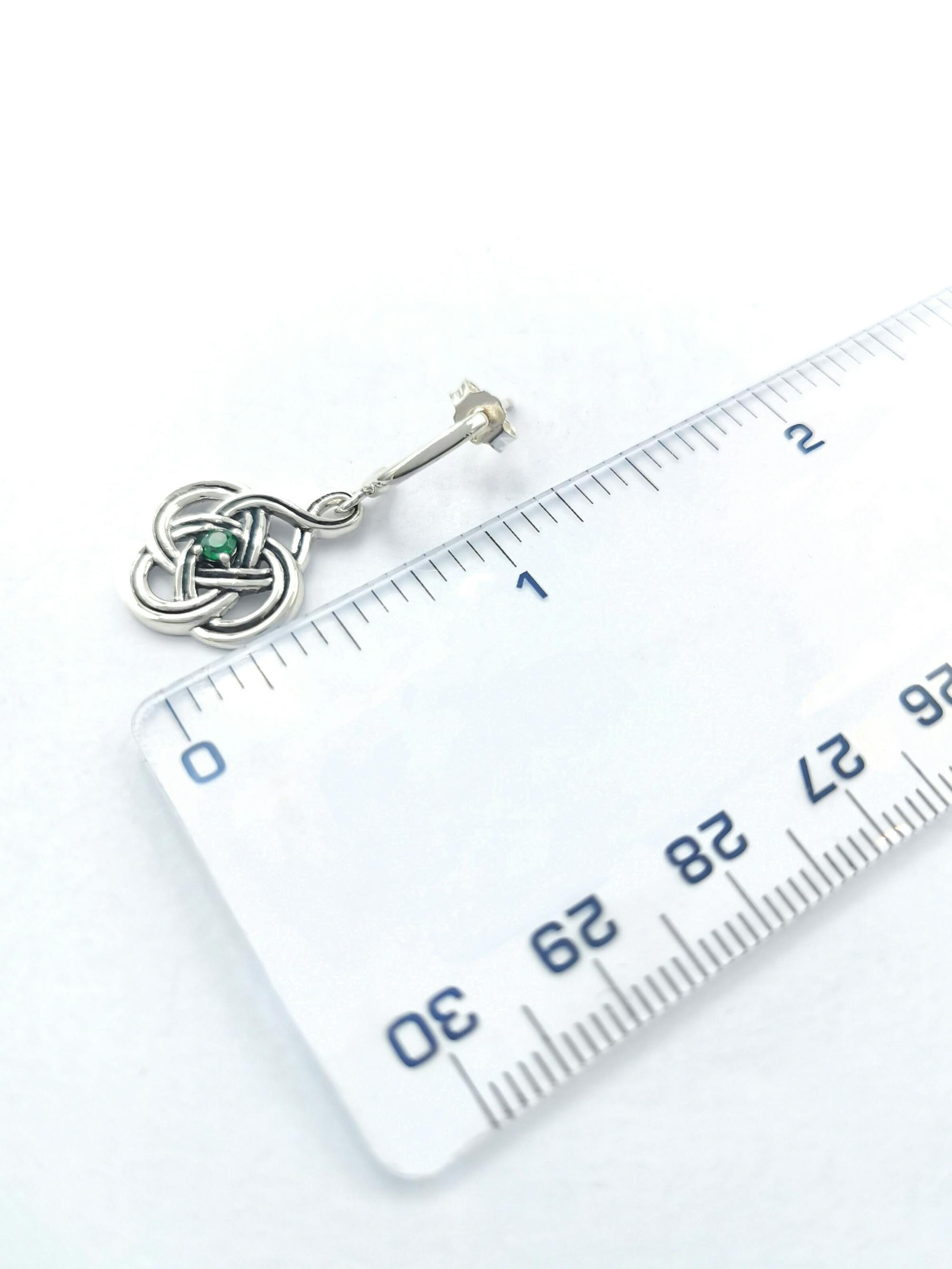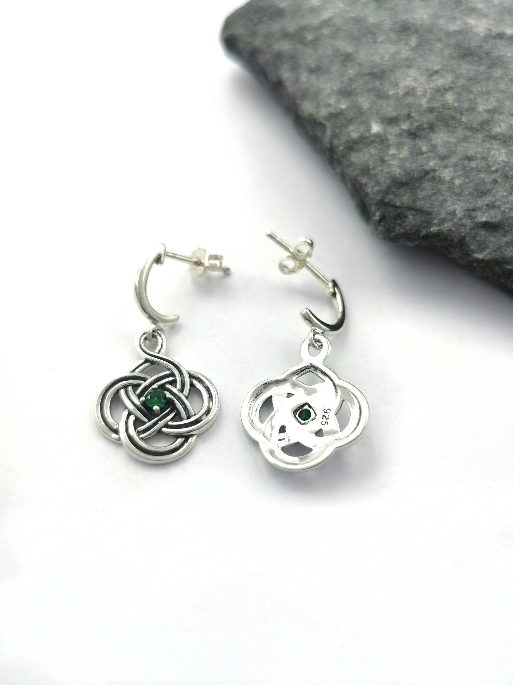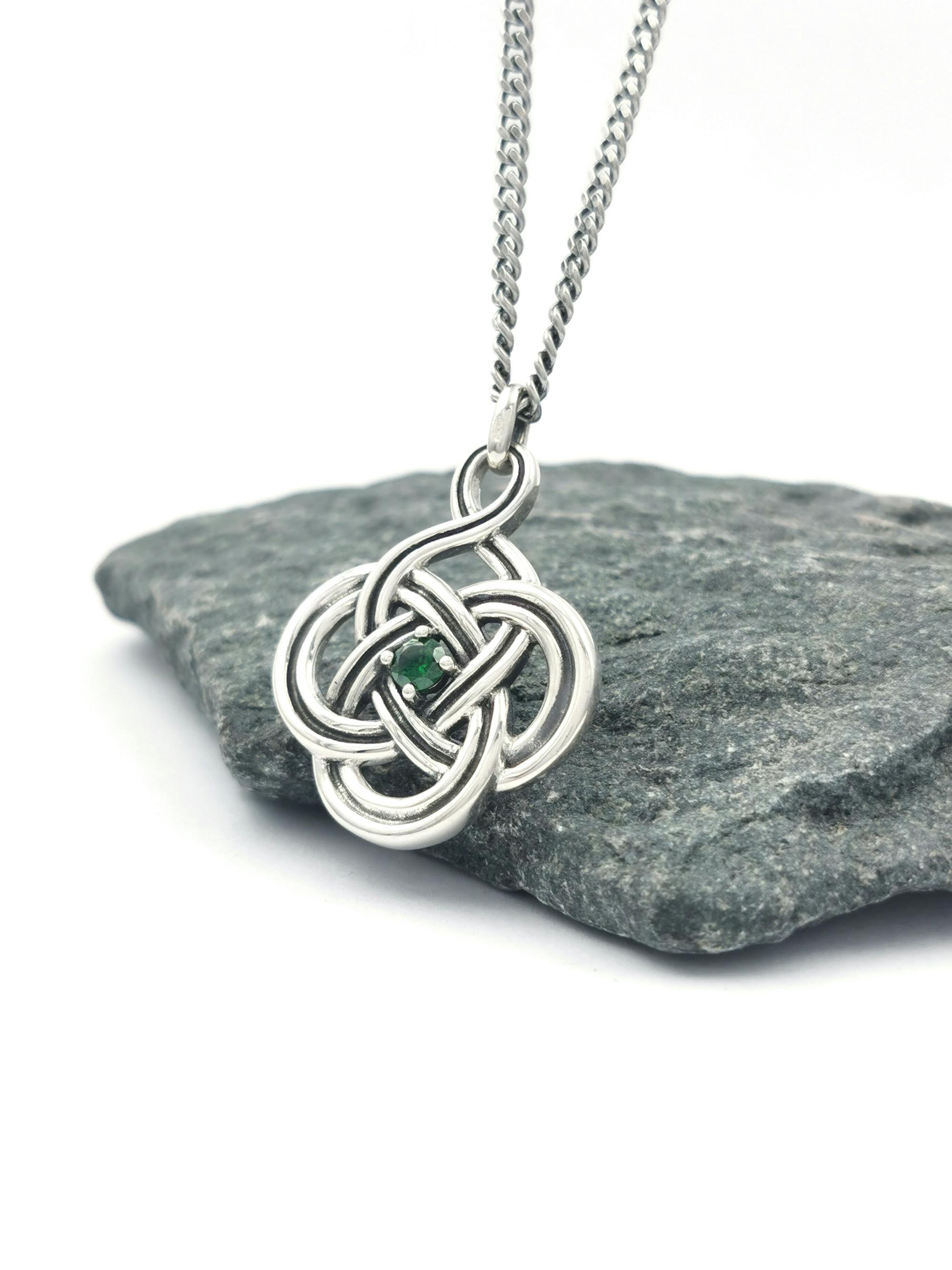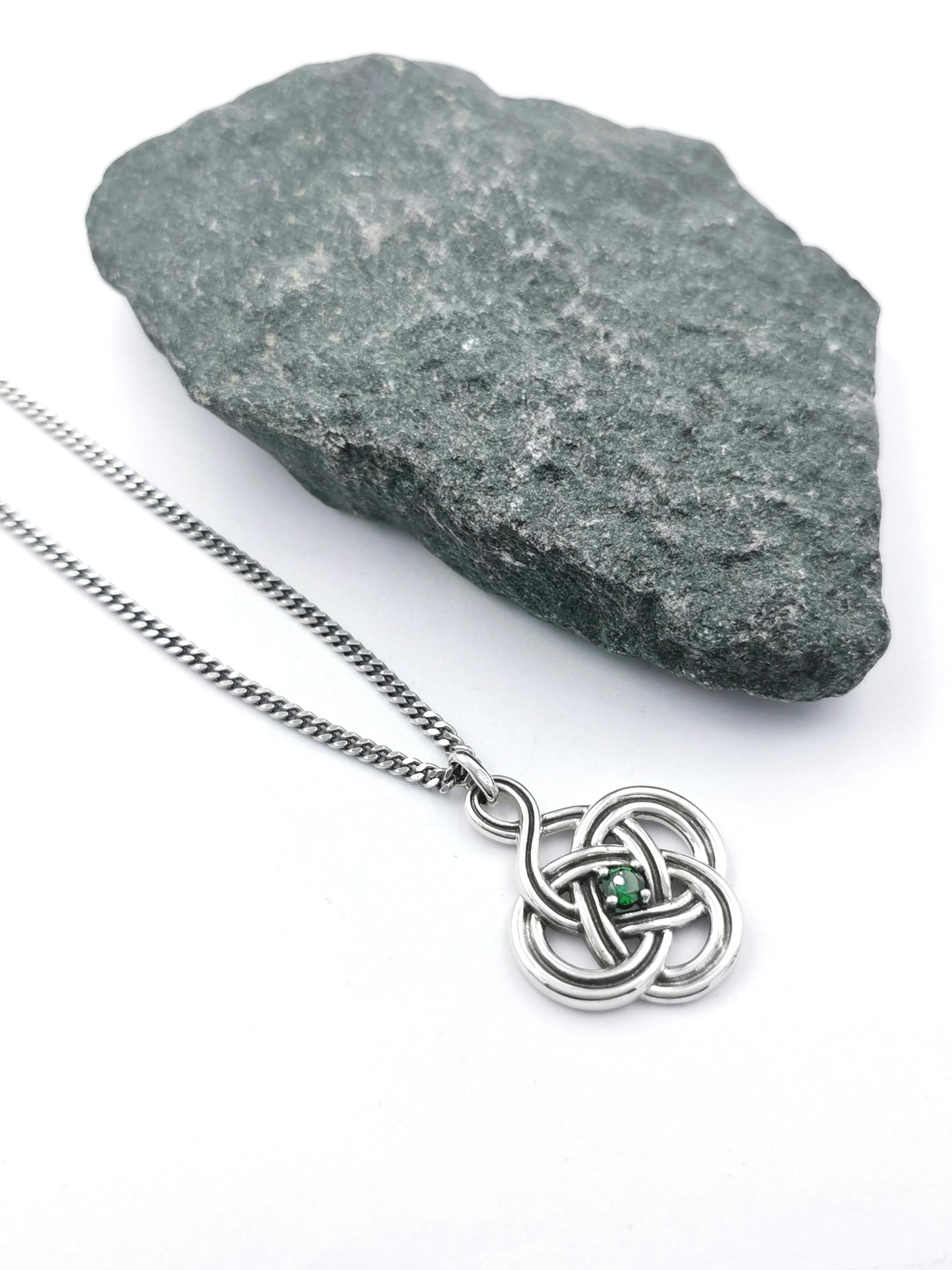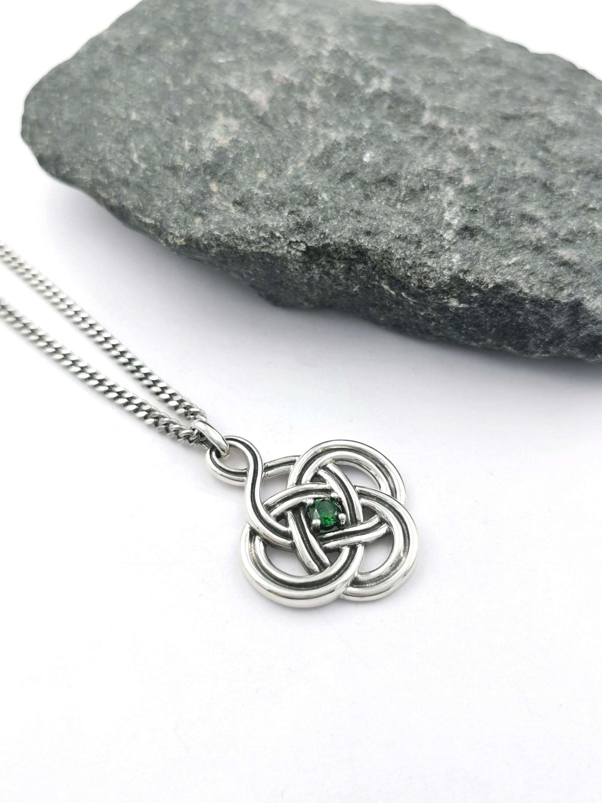 Beautiful striking necklace using a combination of black oxidation and polished sterling silver. The inner frame is decorated with a gorgeous emerald cz stone. The intricate knot work embodies themes of love, loyalty and eternal life.