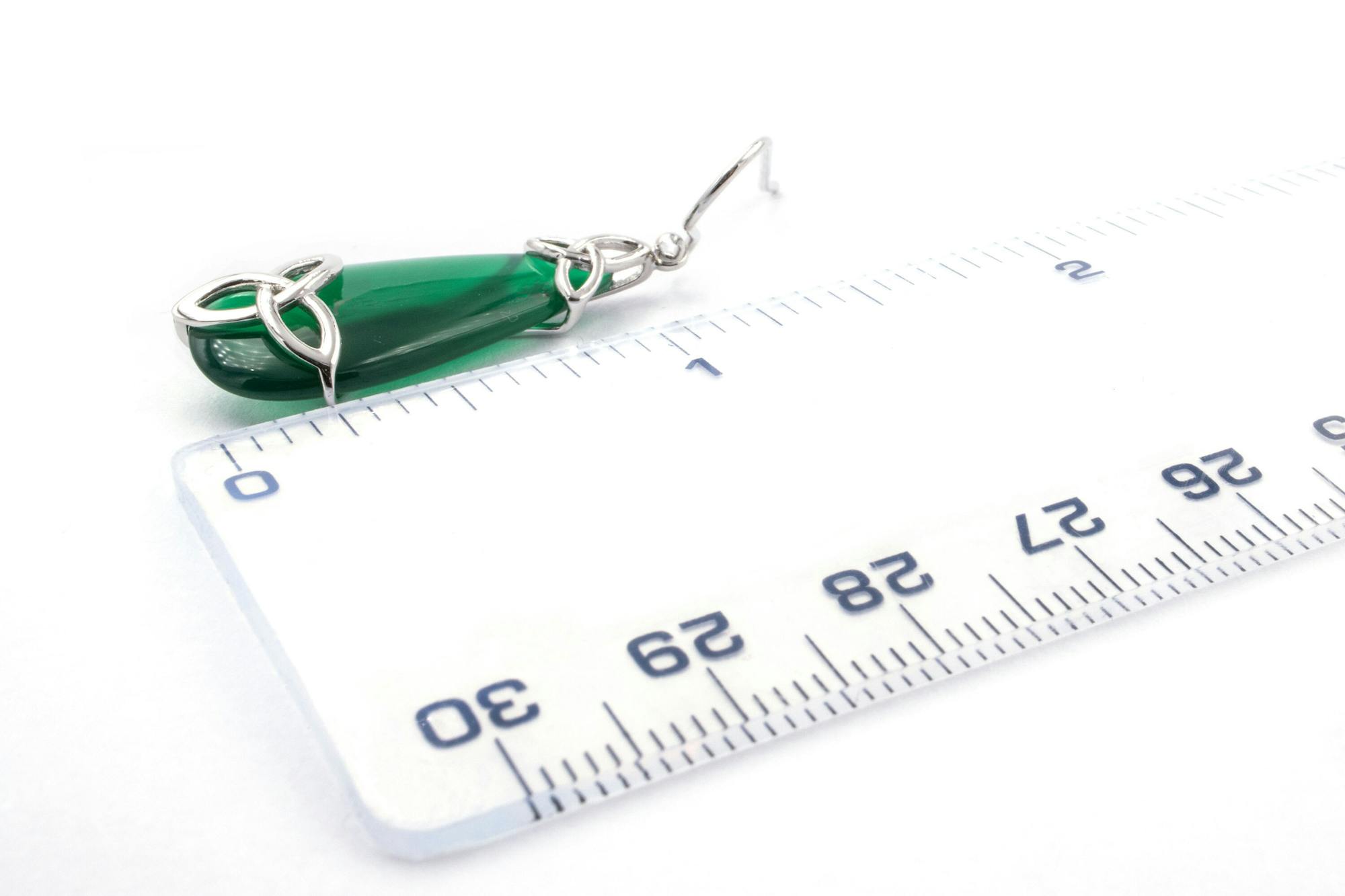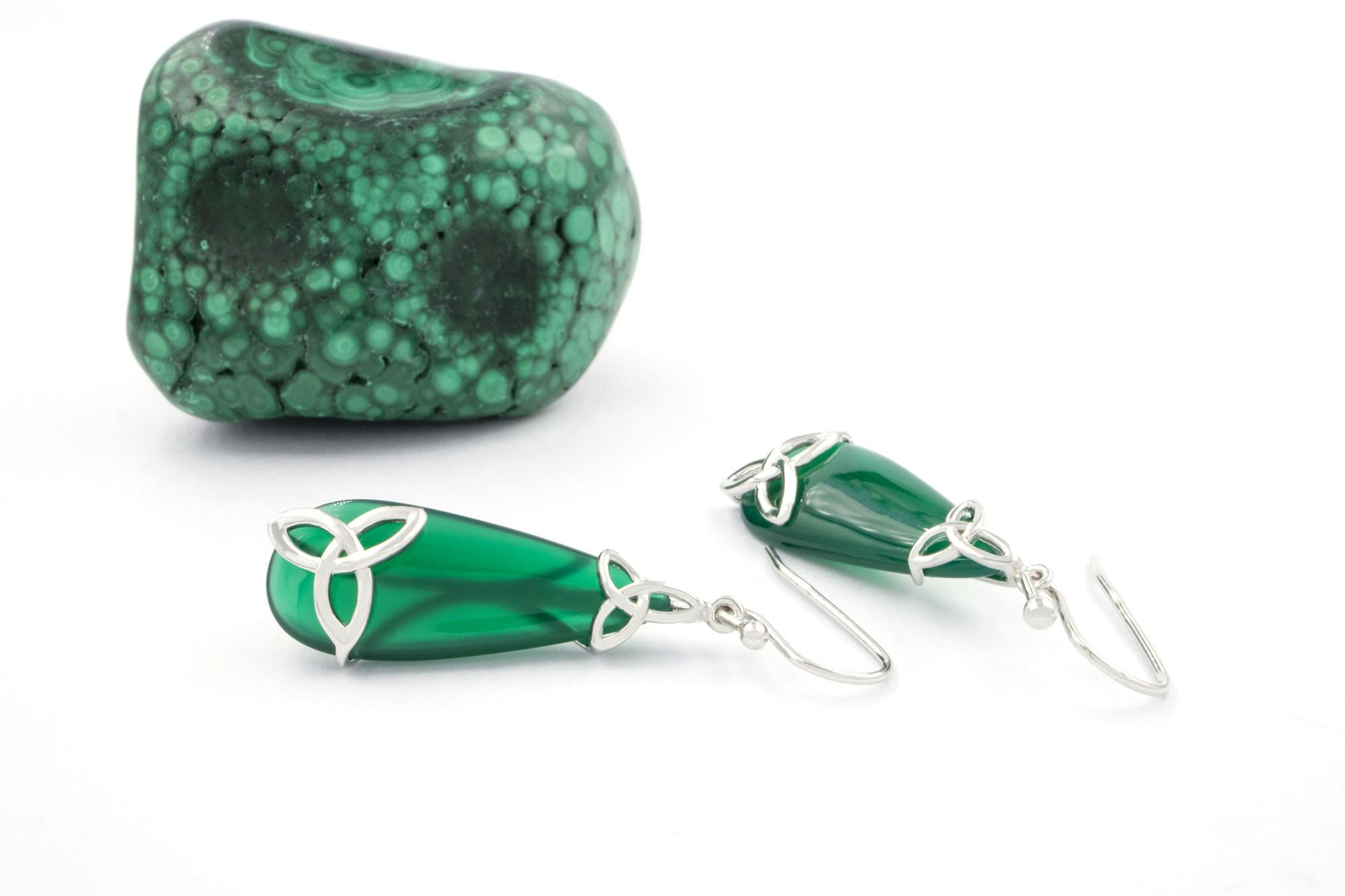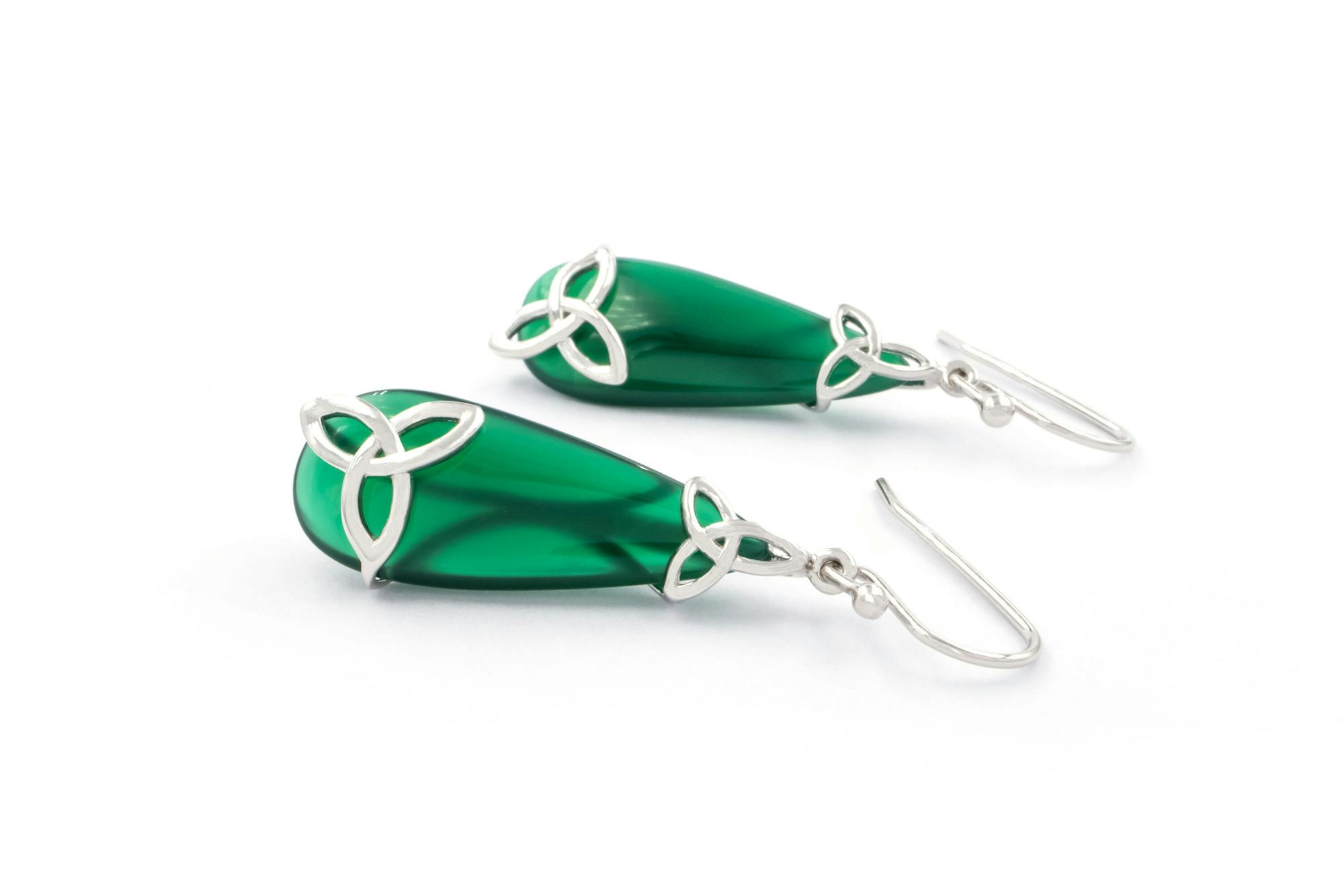 These Trinity Knot earrings are sure to turn heads. The two sterling silver Trinity Knots on each earring look striking set against the vibrant green of agate stone teardrops.