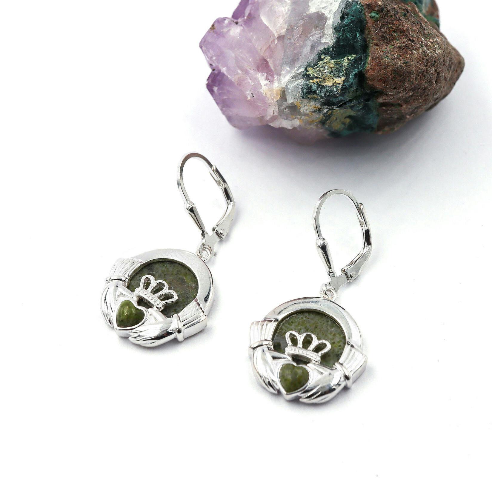 These quality sterling silver claddagh earrings are inlaid with Ireland's famous natural stone, Connemara Marble. Found exclusively on the wild Atlantic west of Ireland, varied shades of green make this beautiful marble truly unique, with no two pieces the same.