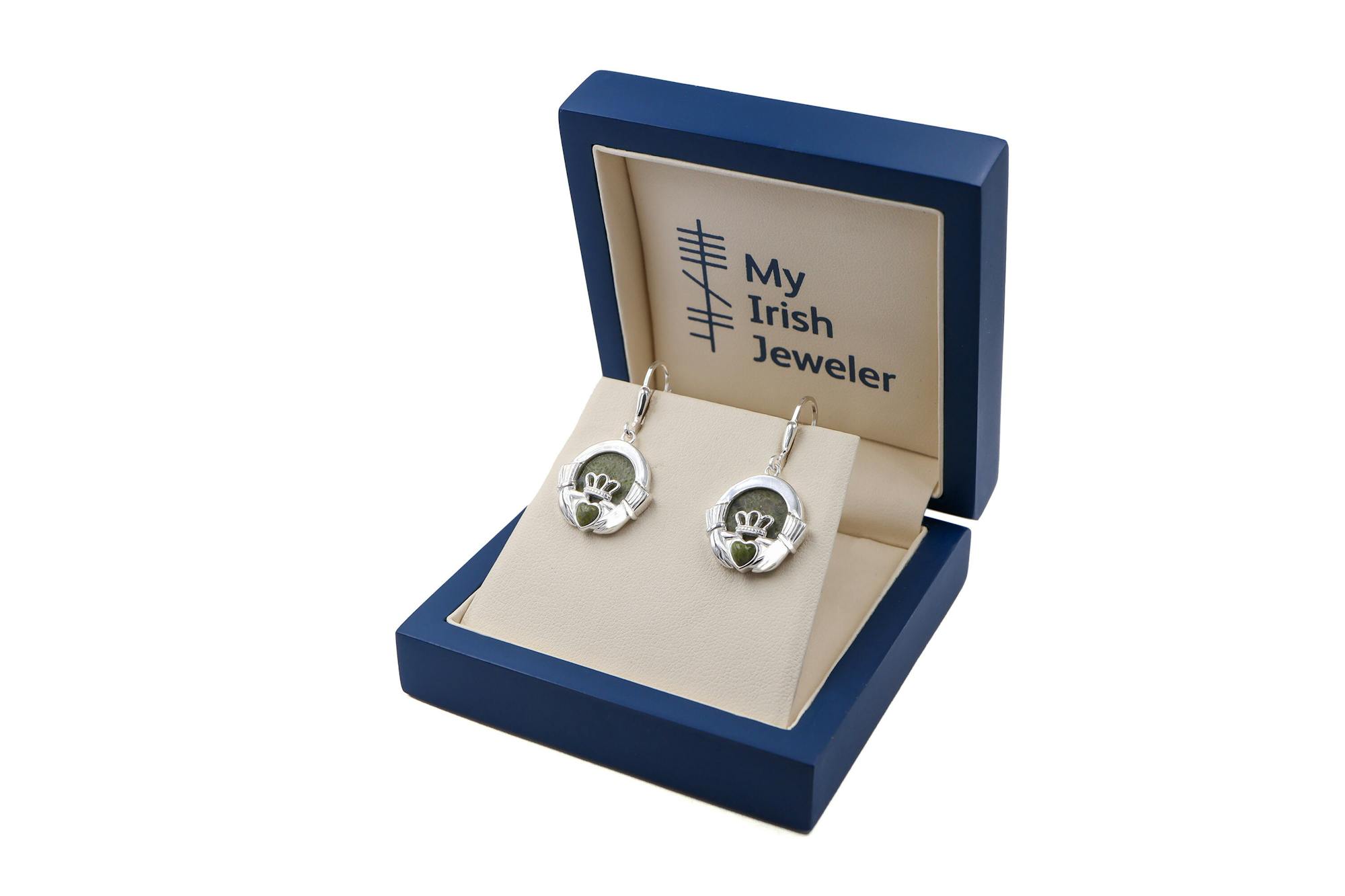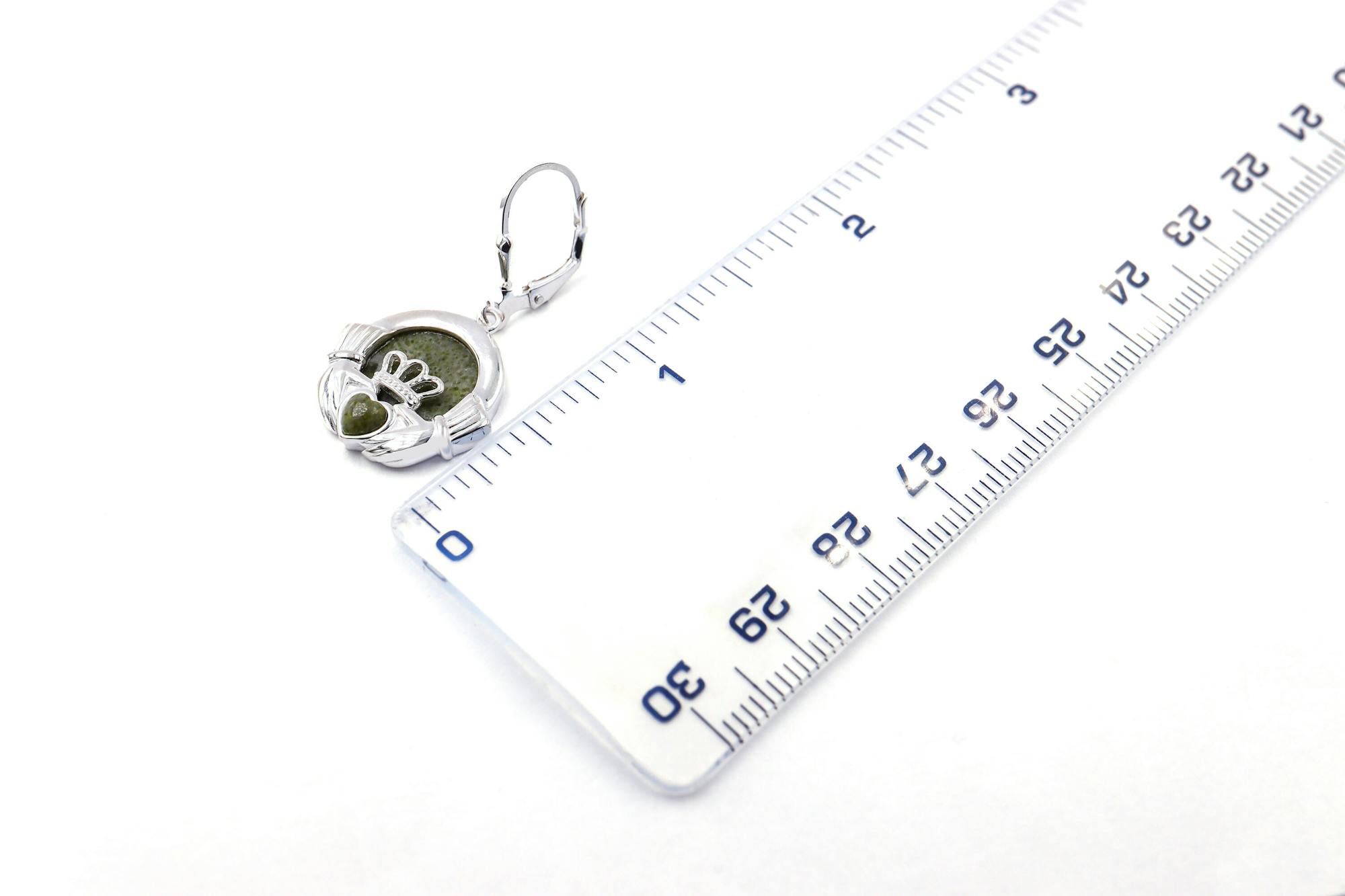 The earrings measure 0.7" wide by 1.3" high including secure lever back fittings. Pair with our Traditional Connemara Marble Claddagh necklace to complete the look.