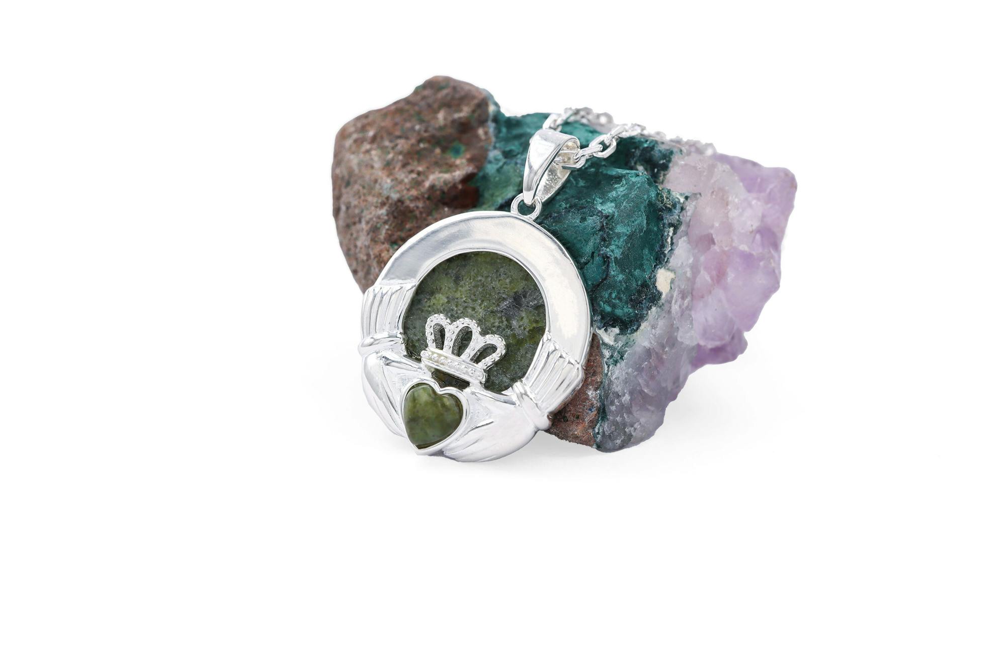 This weighty sterling silver claddagh necklace and earrings is inlaid with Ireland's famous natural stone, Connemara Marble. Found exclusively on the wild Atlantic west of Ireland, varied shades of green make this beautiful marble truly unique, with no two pieces the same.