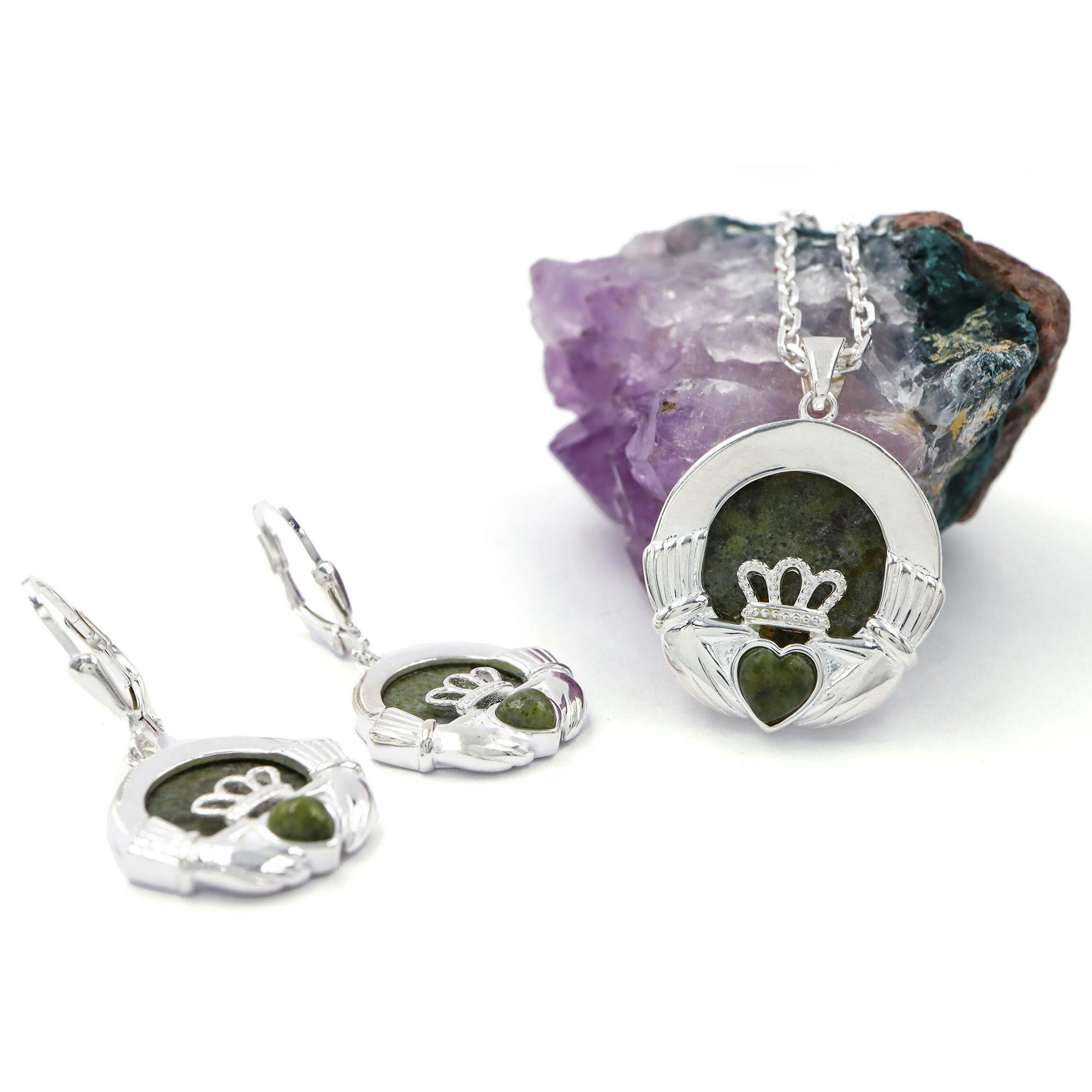 Traditional Connemara Marble Claddagh Necklace and Drop Earring Set