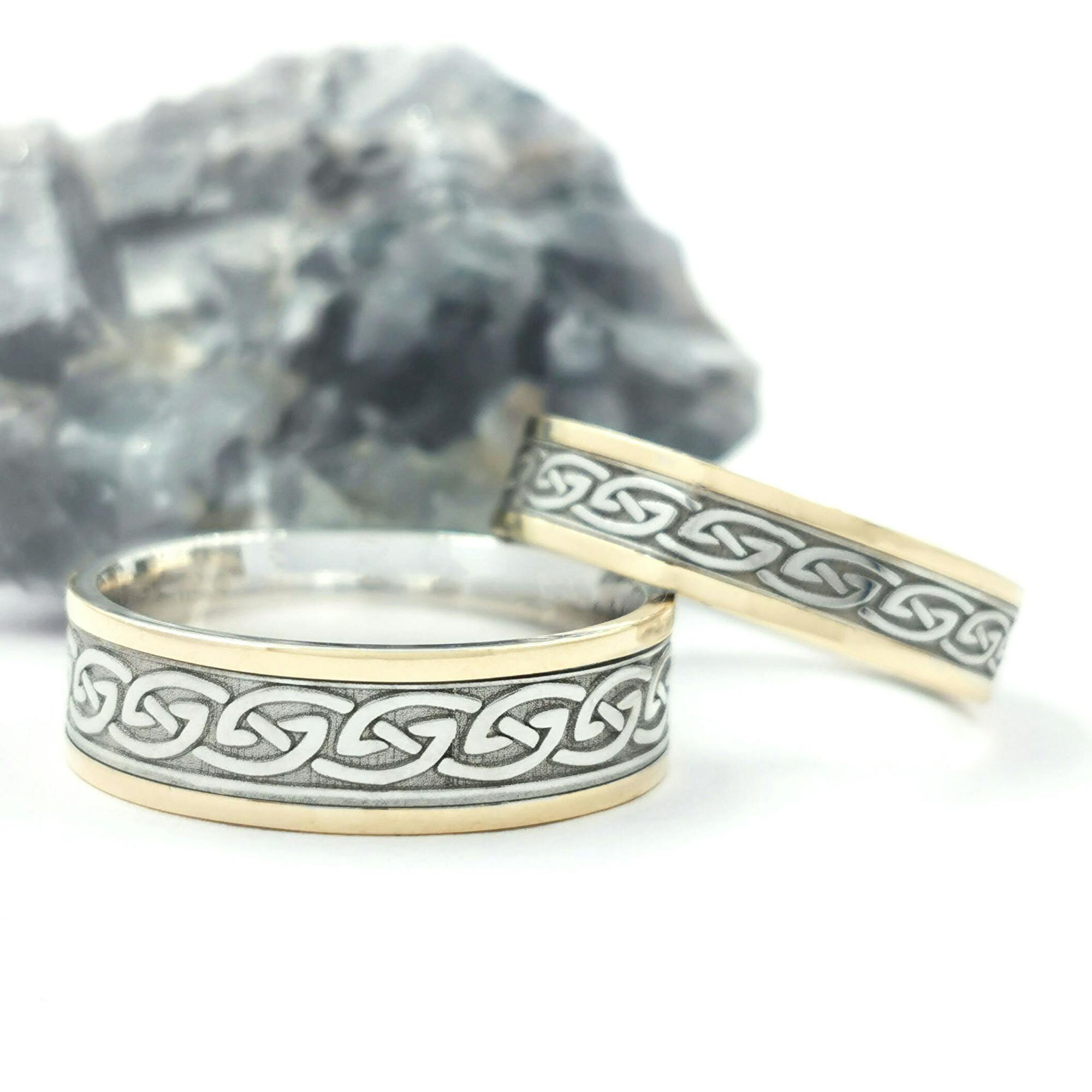 Celebrate an enduring love with these two tone, embossed Celtic rings made for you in your choice of precious metals.