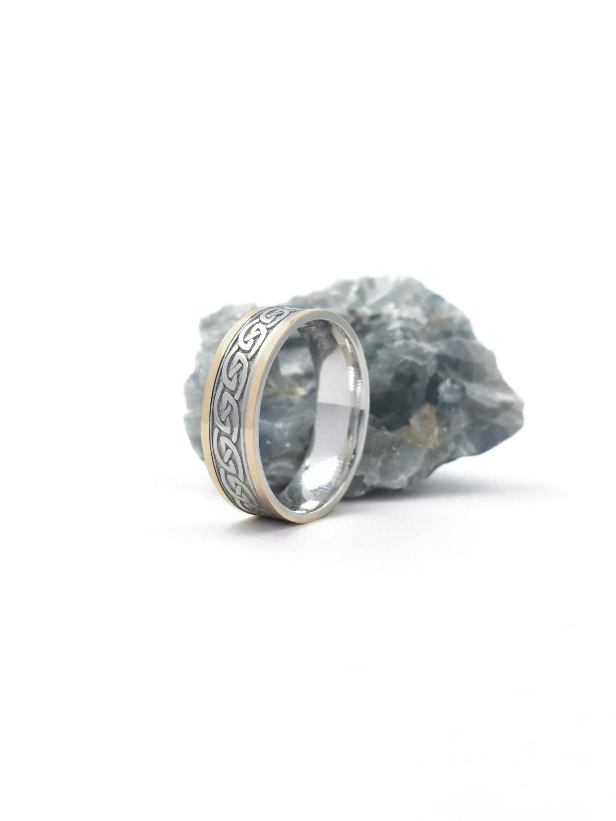 Elegant and intricate Celtic interlace weaves around the entire band. Constant like the ebb and flow of the tide, symbolising unbroken and enduring love and connection in the face of the life's inevitable ups and downs.
