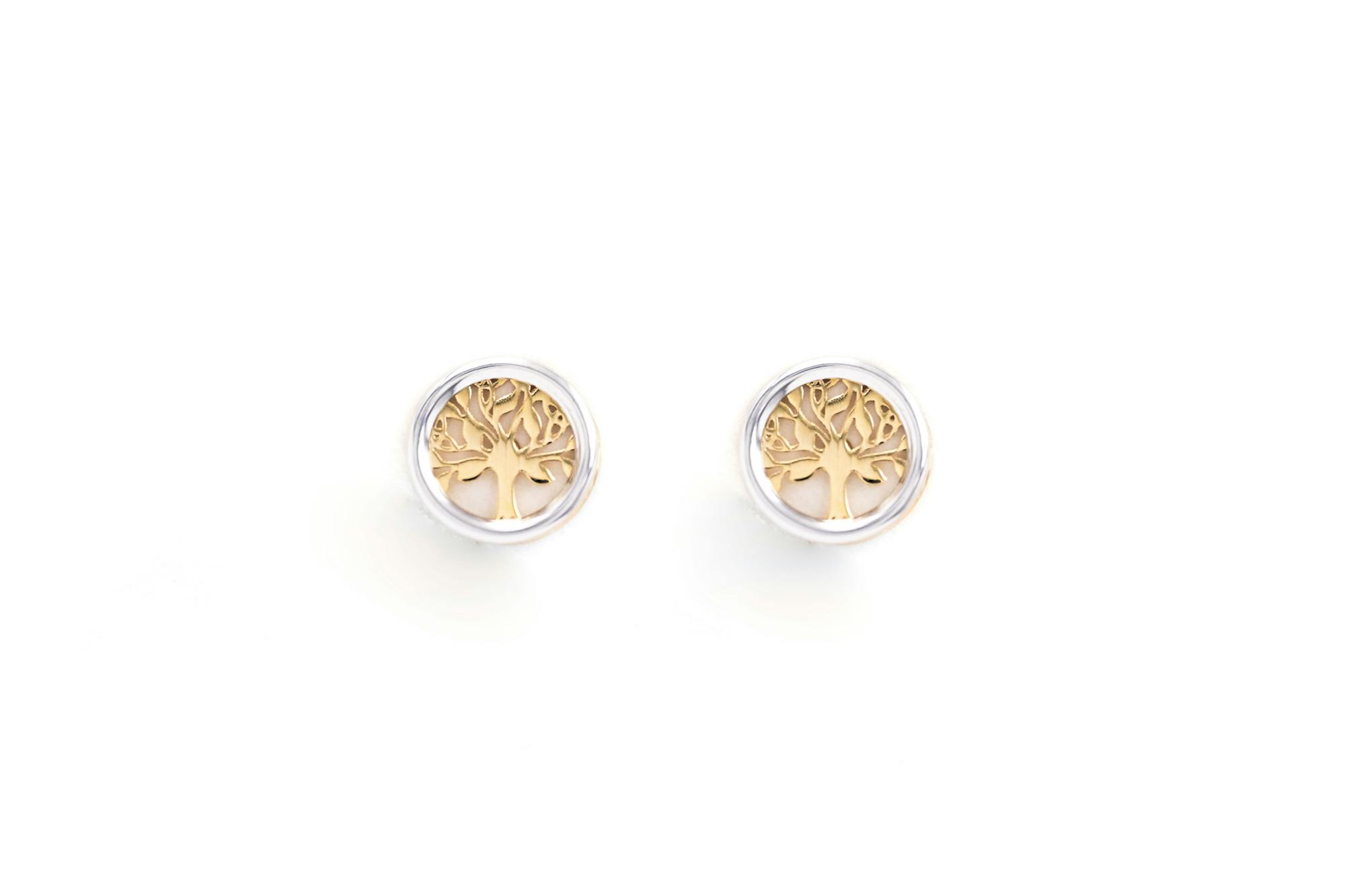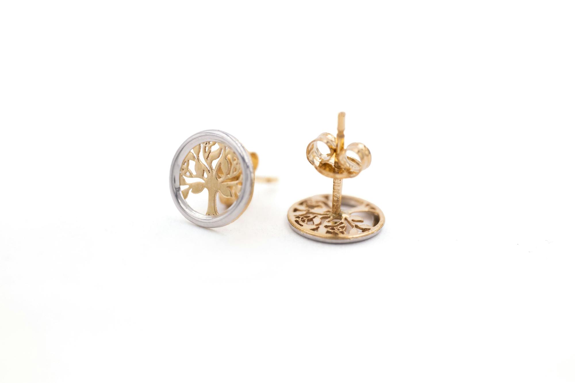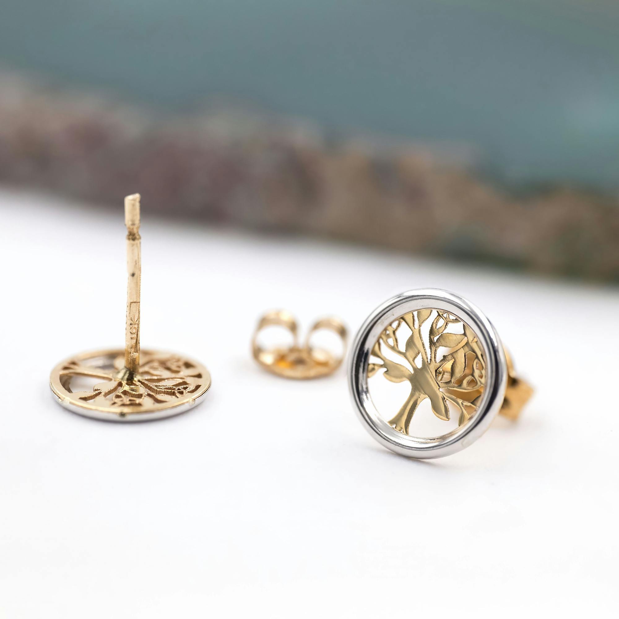 A truly magical pair of petite stud earrings, carefully crafted here in Ireland in solid 10K yellow and white gold. Each earring features a silhouetted celtic tree of life in 10K yellow gold, framed in a circle of 10K white gold.