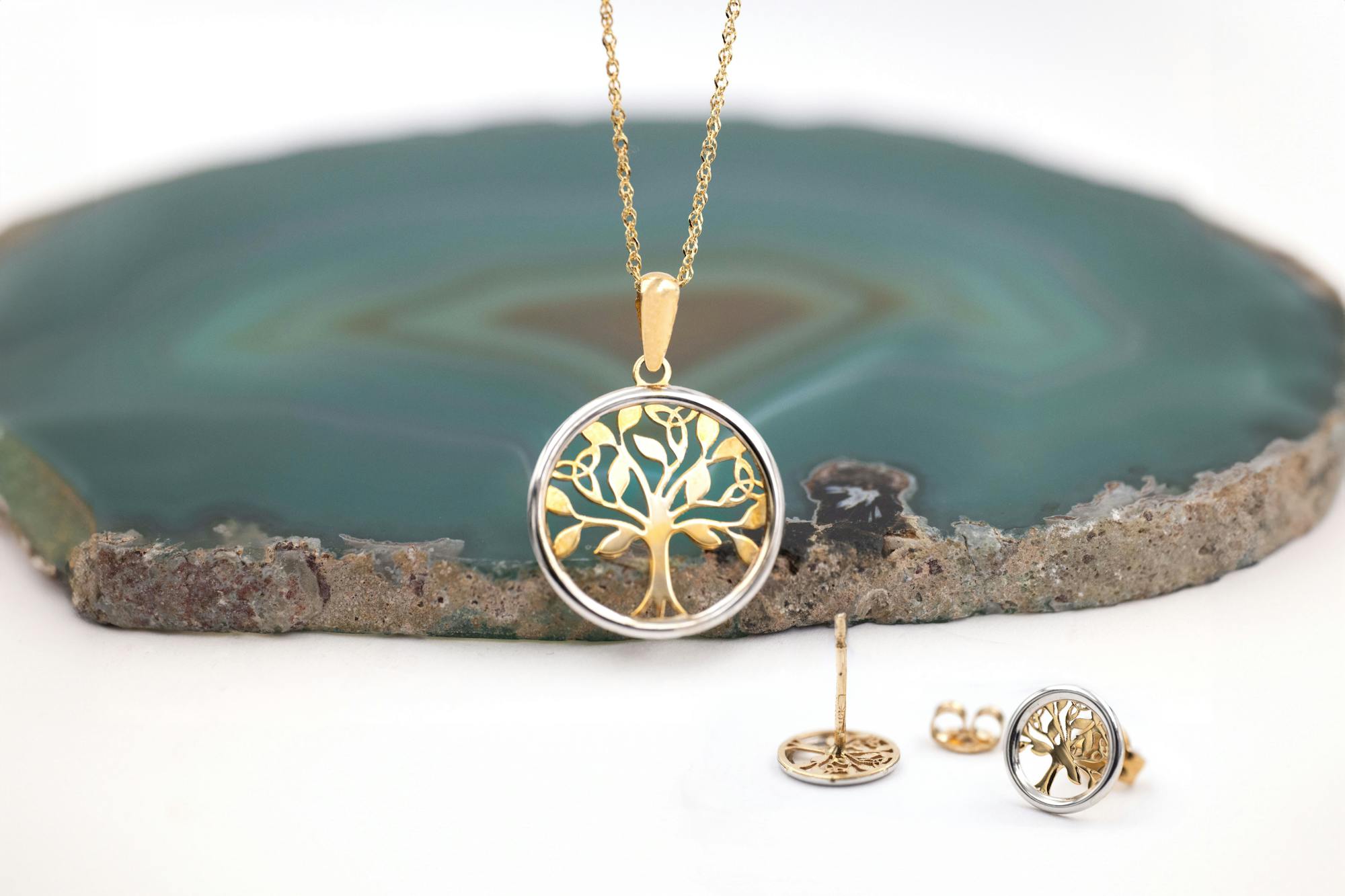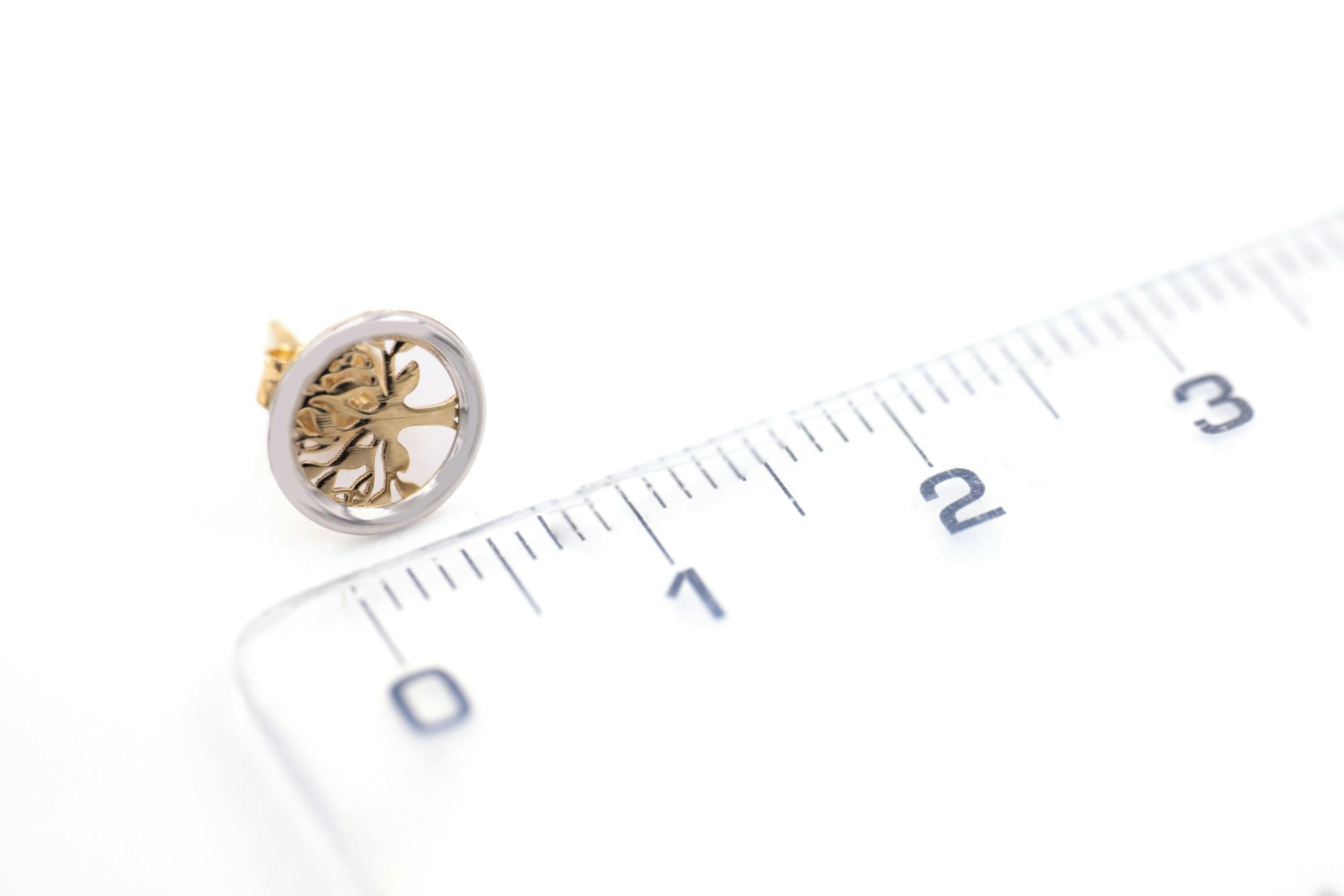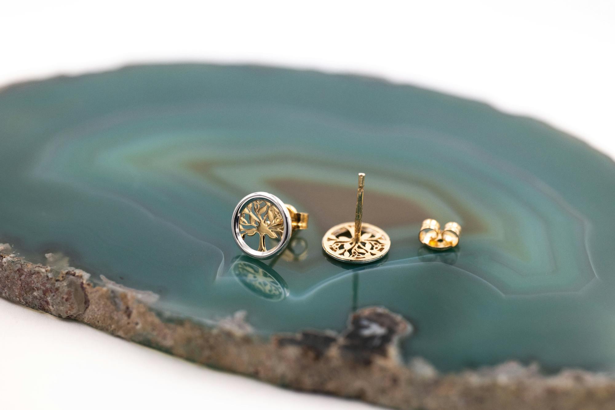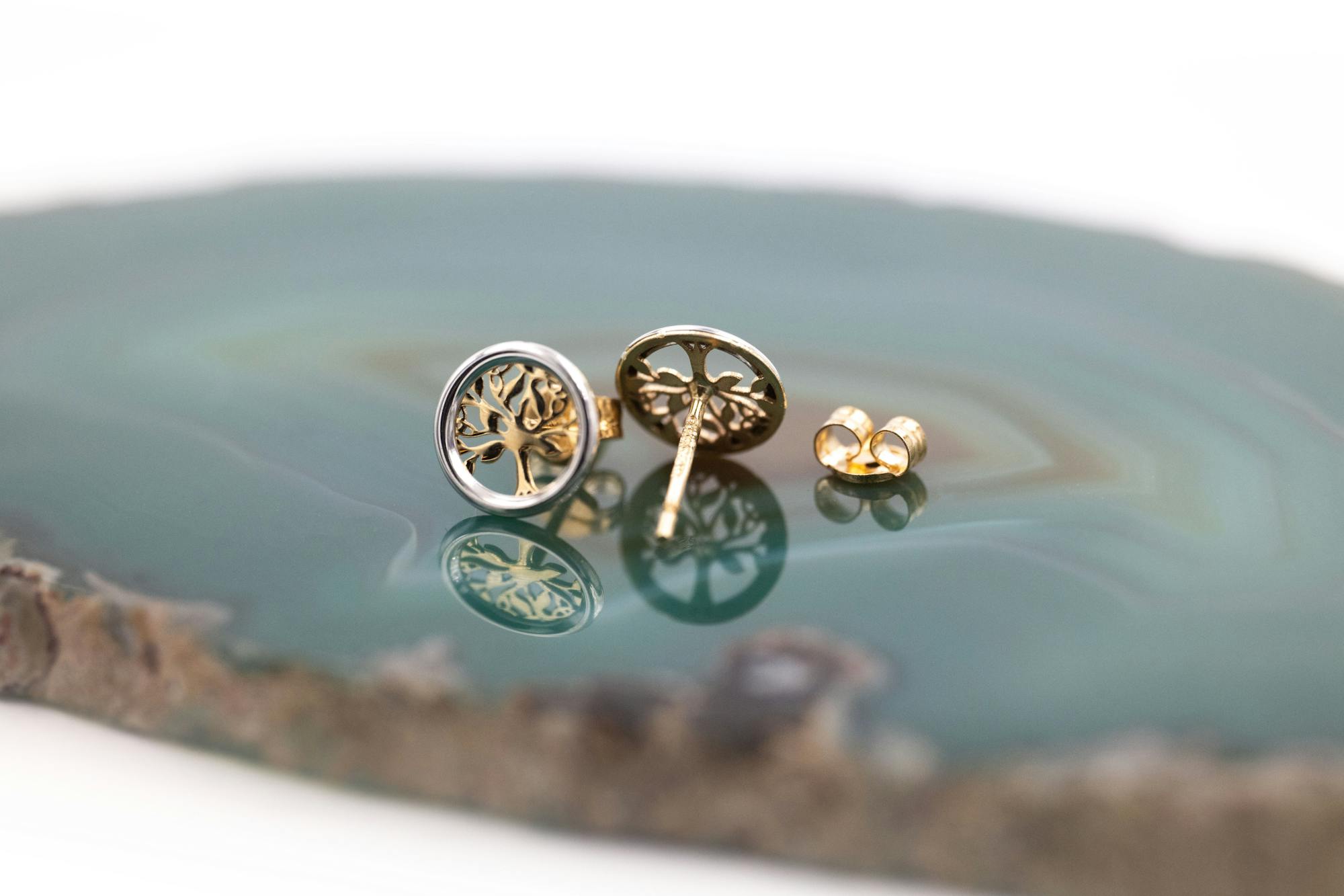 A truly magical pair of petite stud earrings, carefully crafted here in Ireland in solid 10K yellow and white gold. Each earring features a silhouetted celtic tree of life in 10K yellow gold, framed in a circle of 10K white gold.